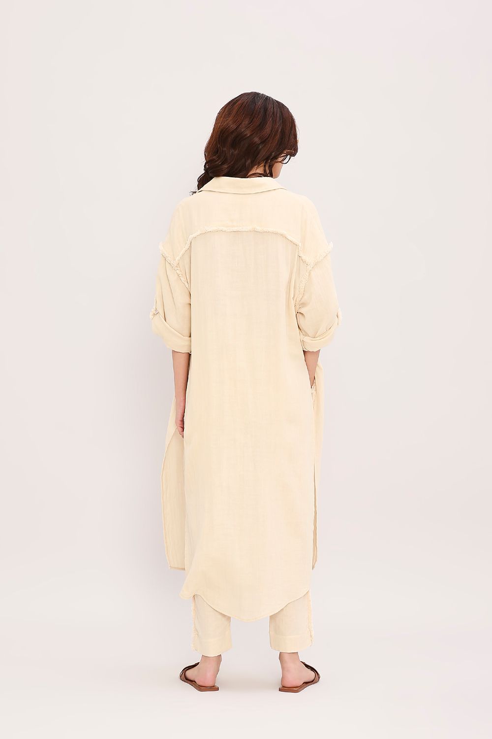 Long shirt in soft crush cotton with front button opening, fringed details and comfort fit. Comes with our tassled elasticated pants with side pockets. Total 2 pcs.