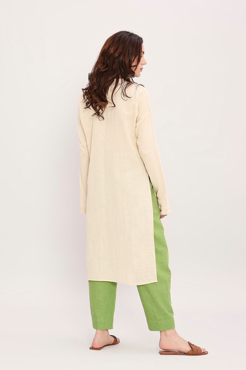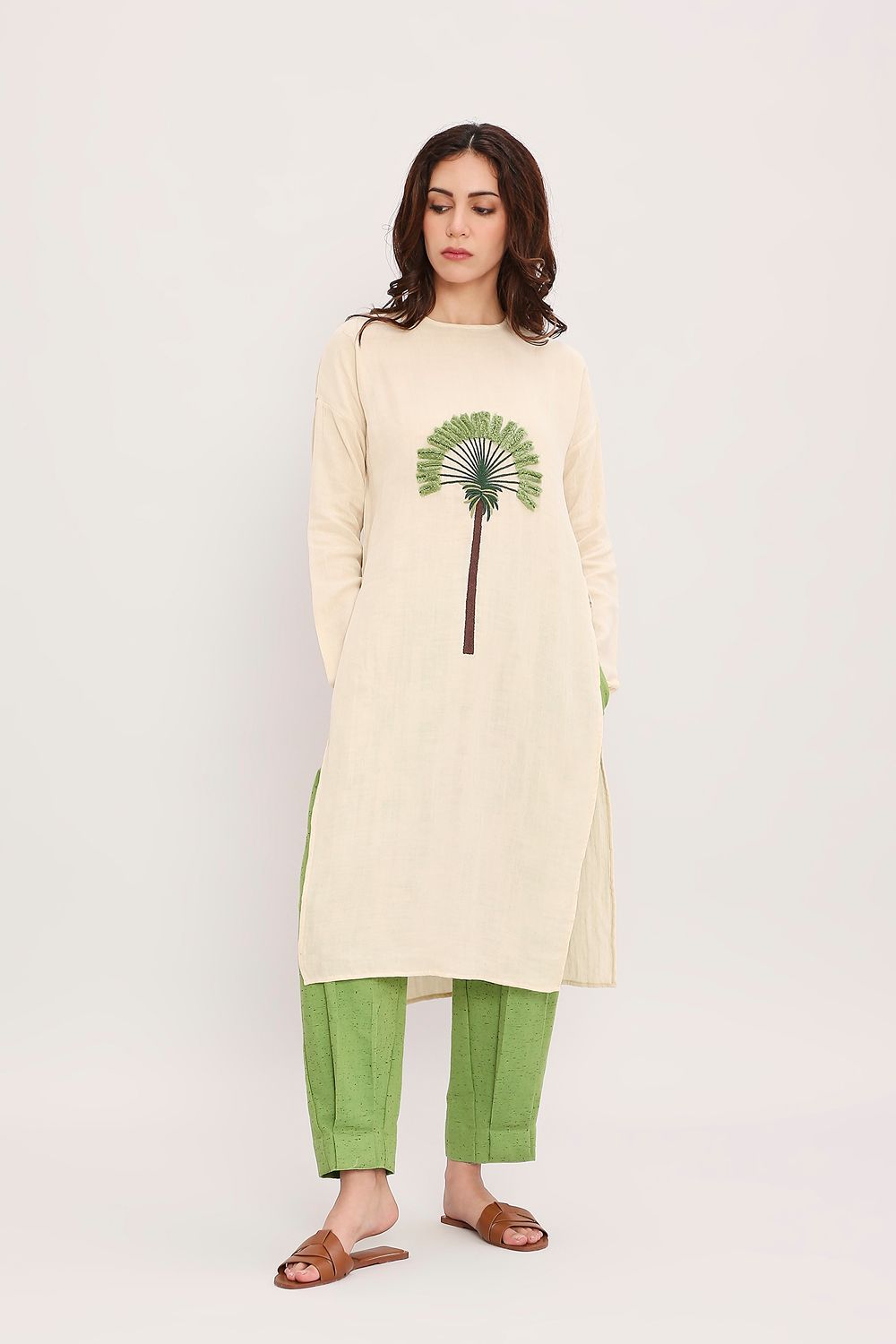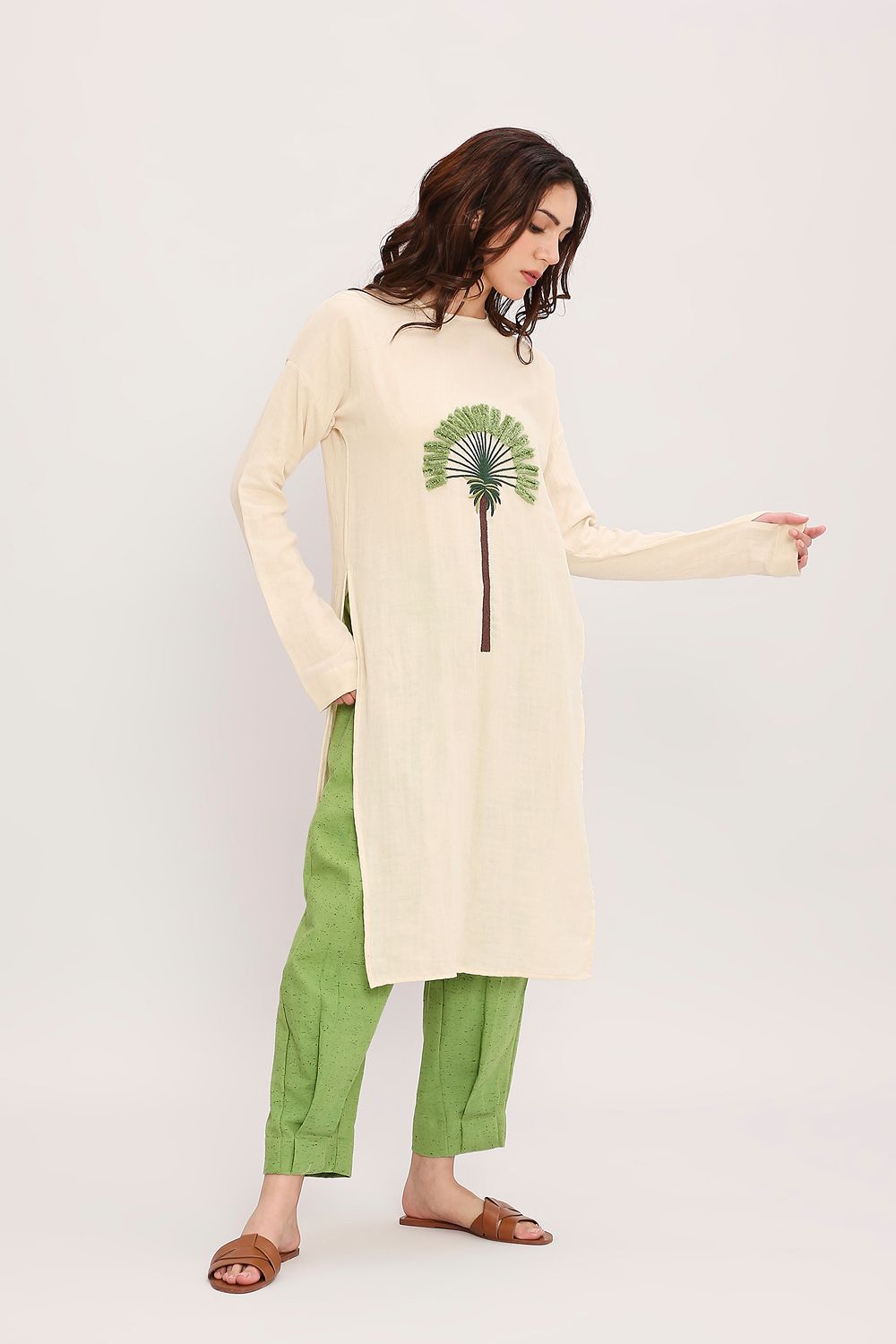 Soft crush cotton tunic with hand embroidery comes with a contrast textured cotton pants with fully elasticated waist with side pockets. Total 2 pcs.