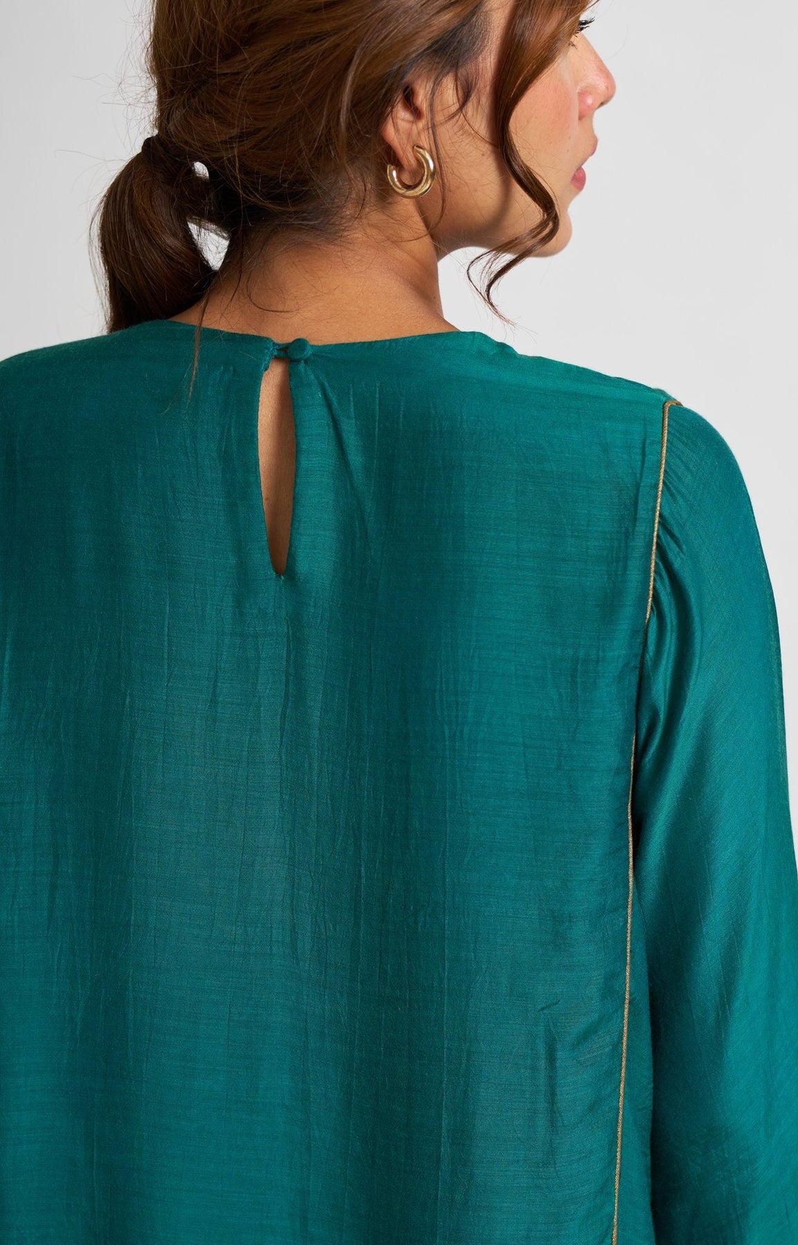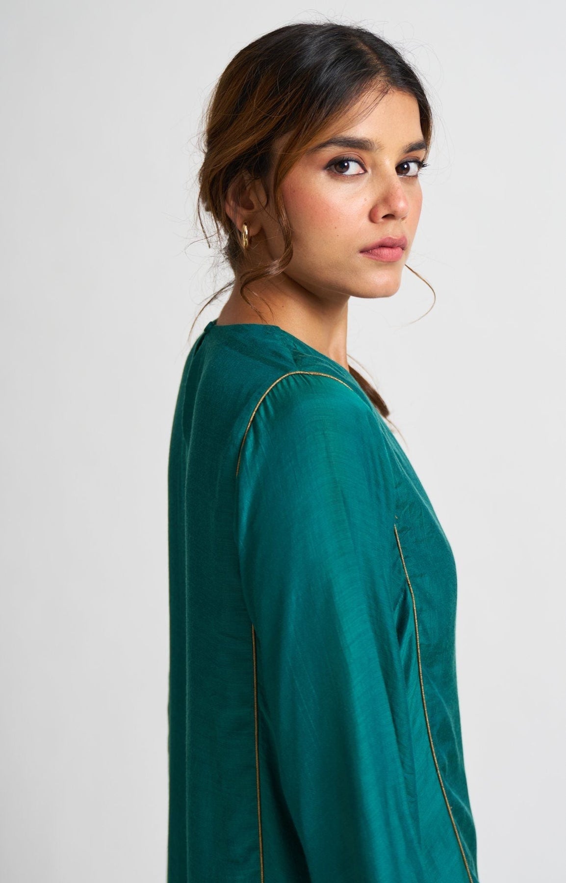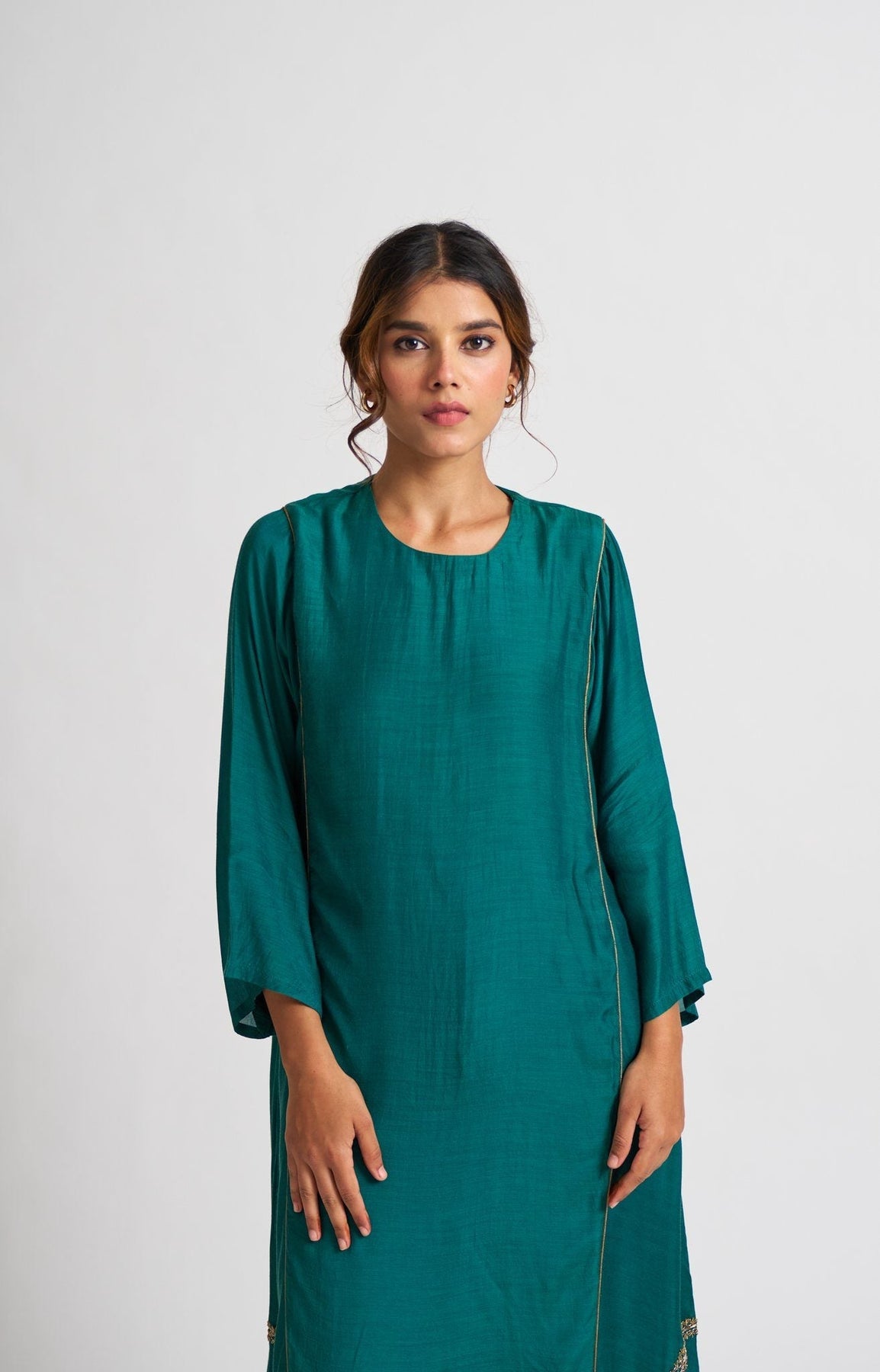 It's a three-piece garment made in cotton silk and chanderi. Colored in a deep emotive shade of turquoise. The asymmetric A-line cut of the kurta is embellished with gold dabka borders, complimenting the sensuality of red with the straight broad fit of the pants in cotton silk.