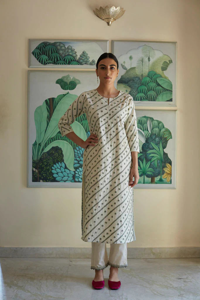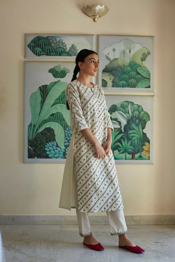 The silhouettes are simple but considered: relaxed cuts, thoughtful details, and fabrics that breathe — from handwoven cottons to delicately finished textiles rooted in Rajasthan’s craft culture. Colours stay close to the earth: muted florals, soft neutrals, and tones that age gracefully rather than fall out of season.