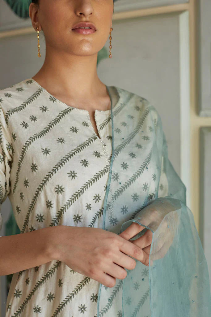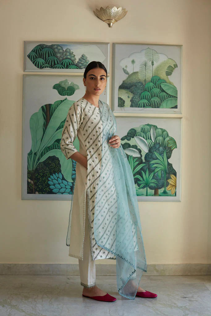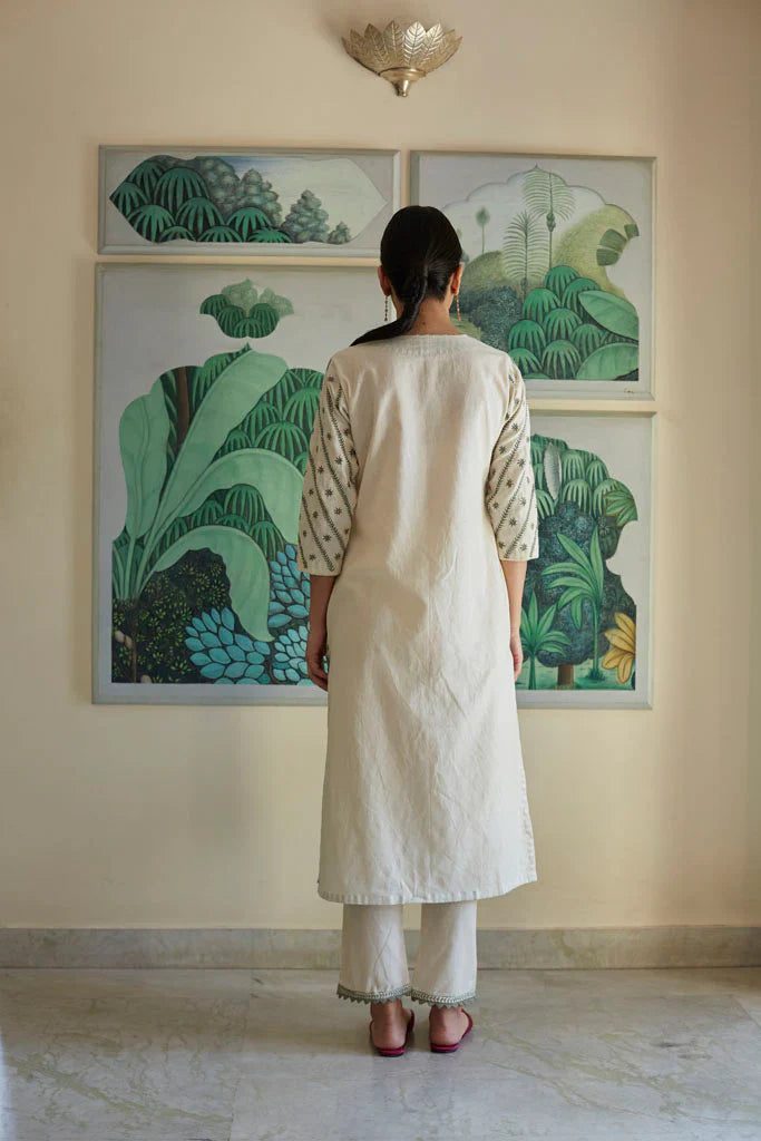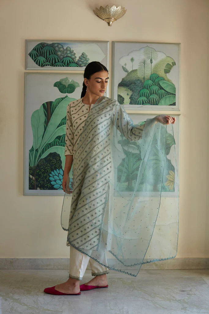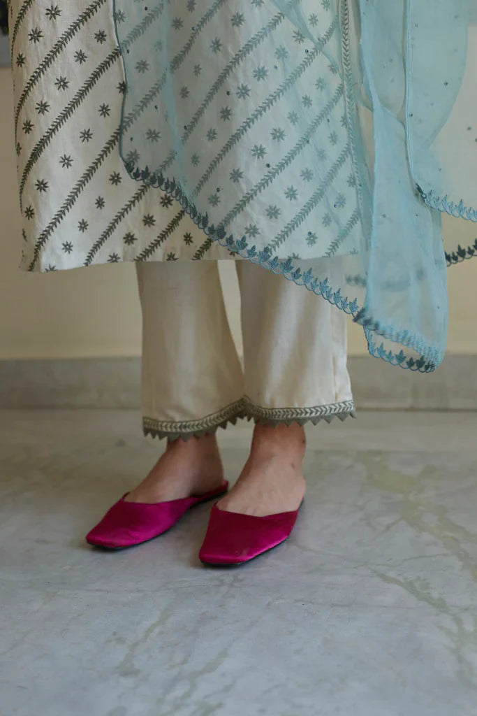 Cotton mul-mul, round edged long kurta, with hand hemmed silver ghungroos on the placcate and delicate silver "chaand" motif shadows emboirdered all over the front. Sleeve has mukaish work and monotone thread detailing. Dupatta is cotton mulmul with handmade silver chatai gota hand hemmed on it. Outfit is paired with an old fashioned narrow high salwar with bijiya edges.