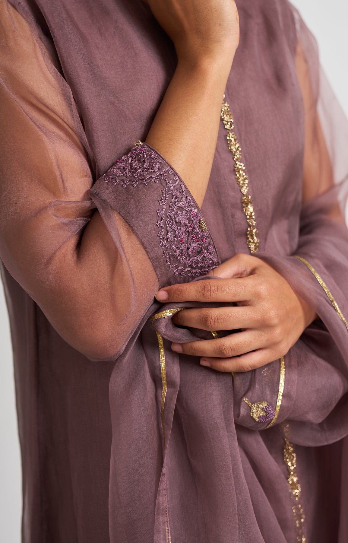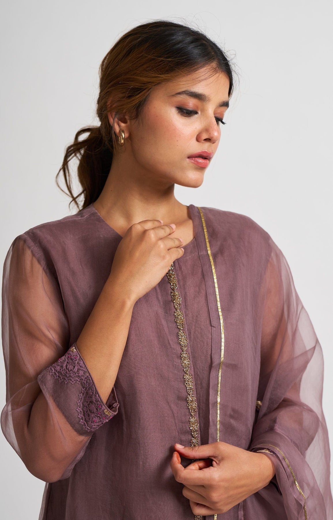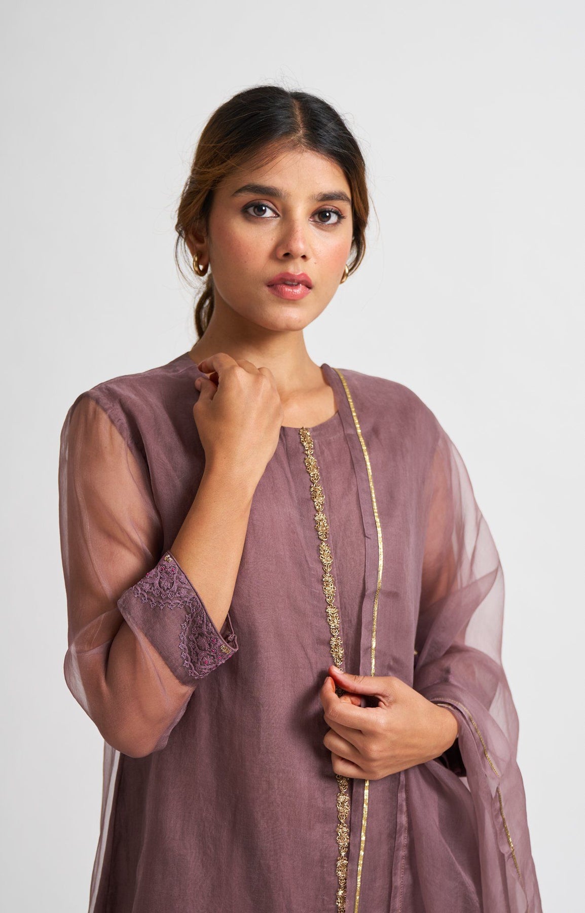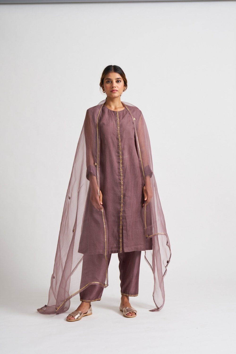 Elegant and minimal kurta set embroidered using Nakshi on front placket and a detailed Resham embroidery on sleeve hem adds to the beautiful Neera kurta set. The dupatta is beautifully finished with gota and gendakali buds spread all over the dupatta.