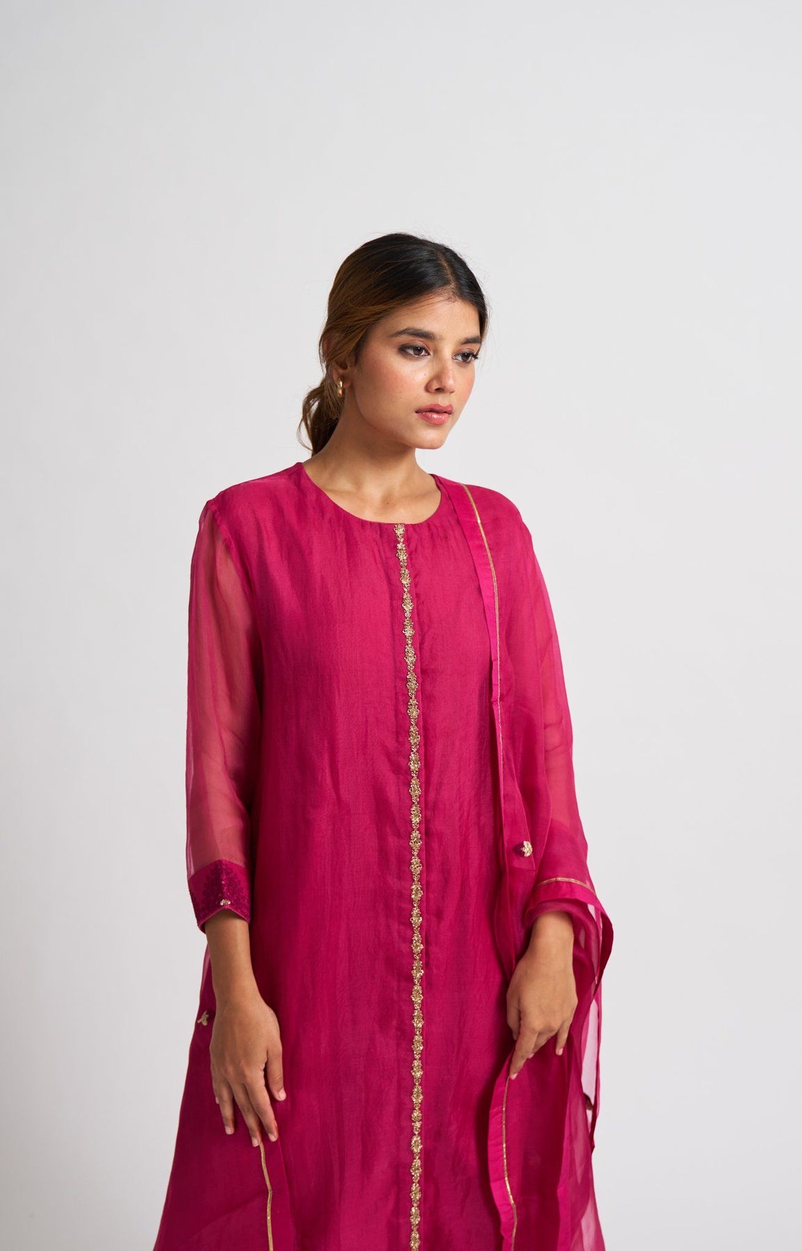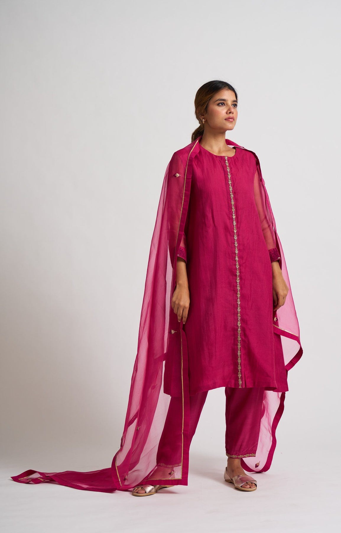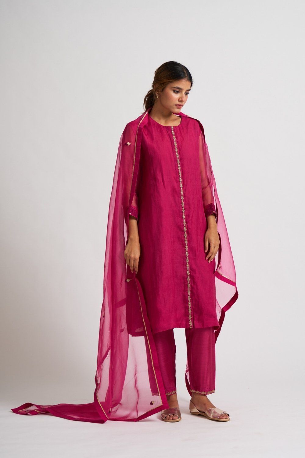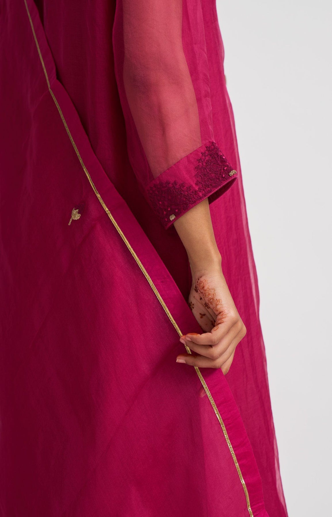 Elegant and minimal kurta set embroidered using Nakshi on front placket and a detailed Resham embroidery on sleeve hem adds to the beautiful Neera kurta set. The dupatta is beautifully finished with gota and gendakali buds spread all over the dupatta.