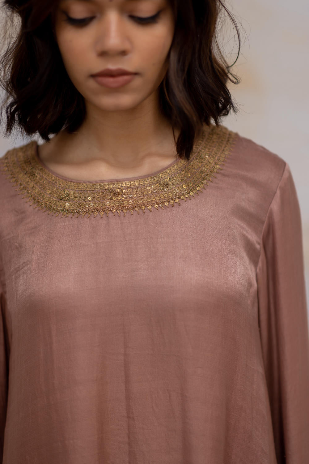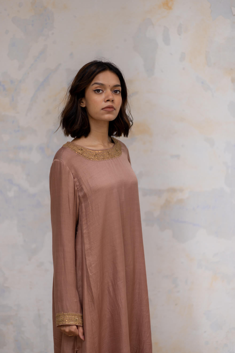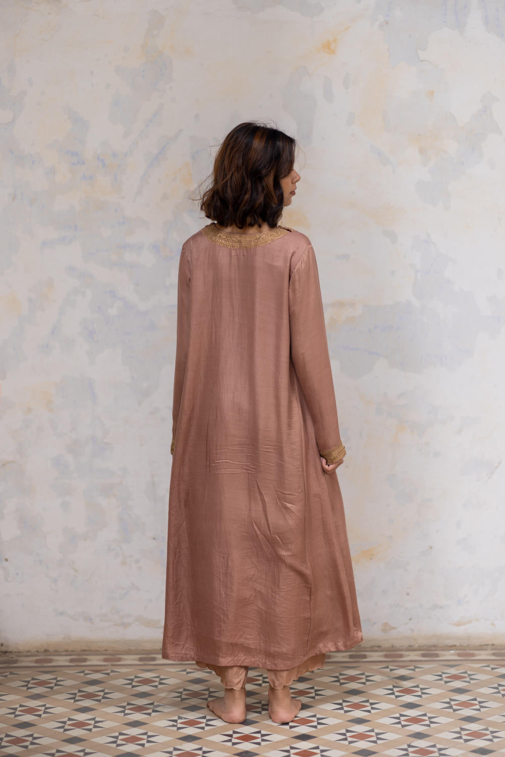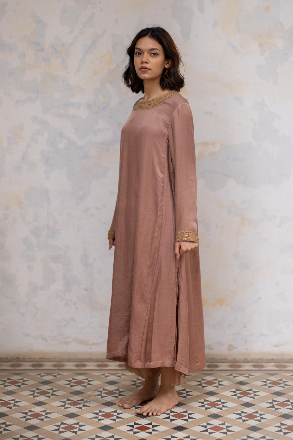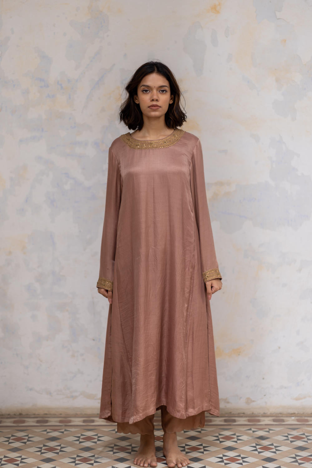 Festive round neck kurta with full sleeves and rich marodi embroidery, this kurta pronounces femininity and softness in its craftsmanship.