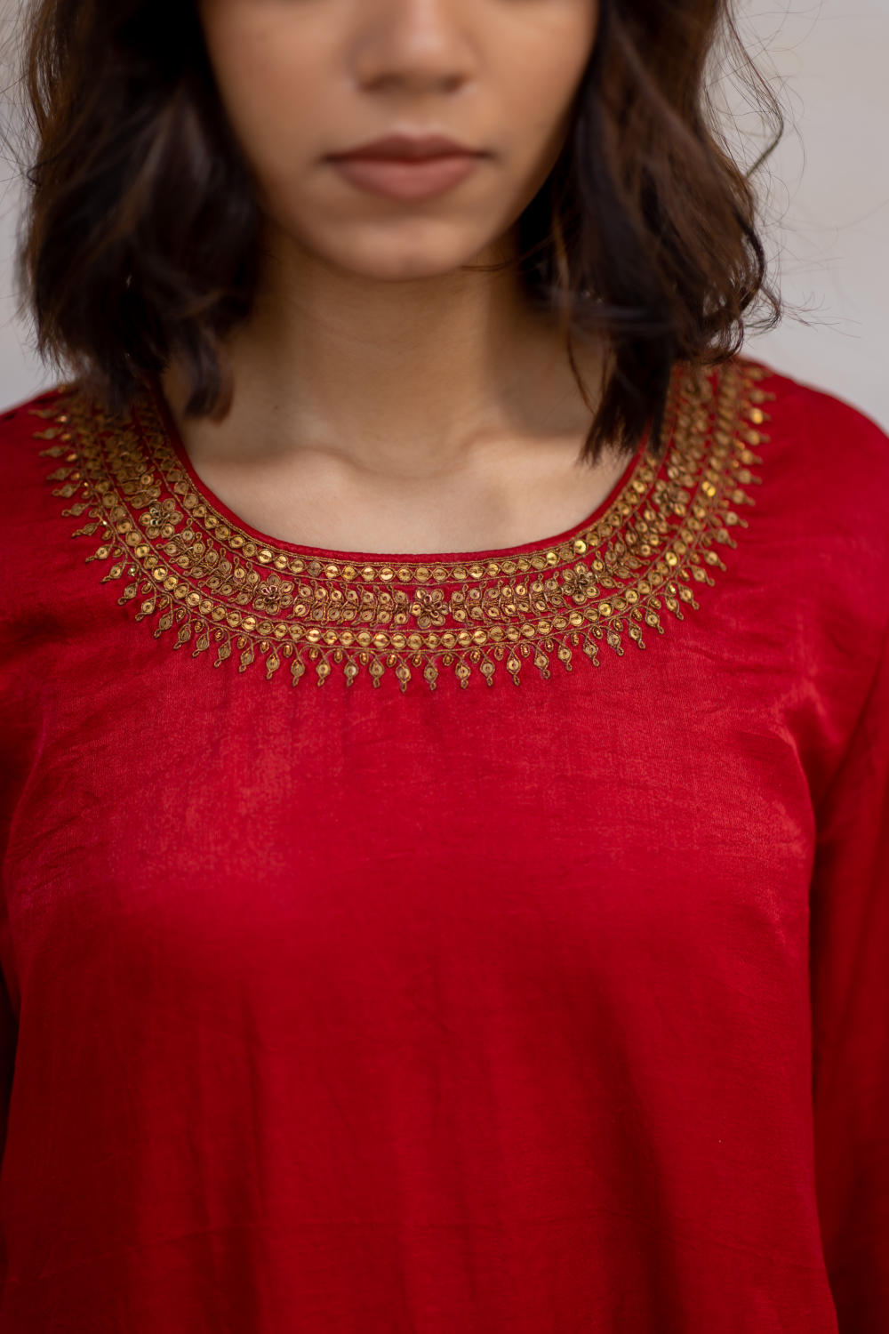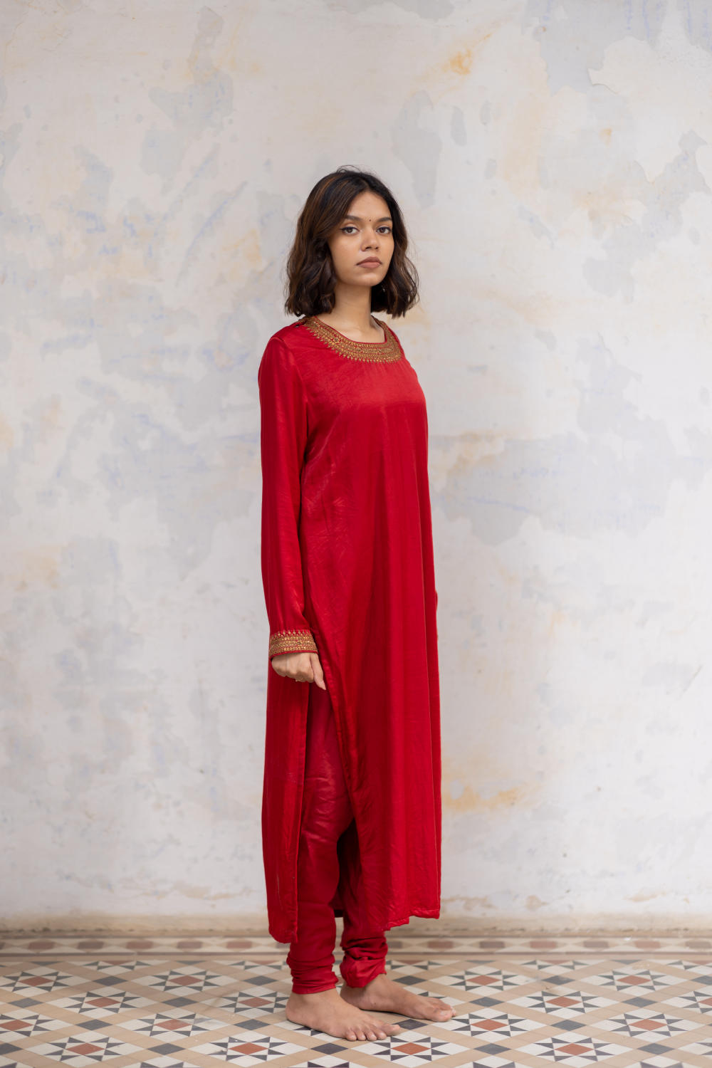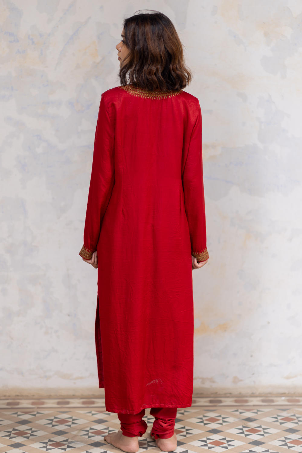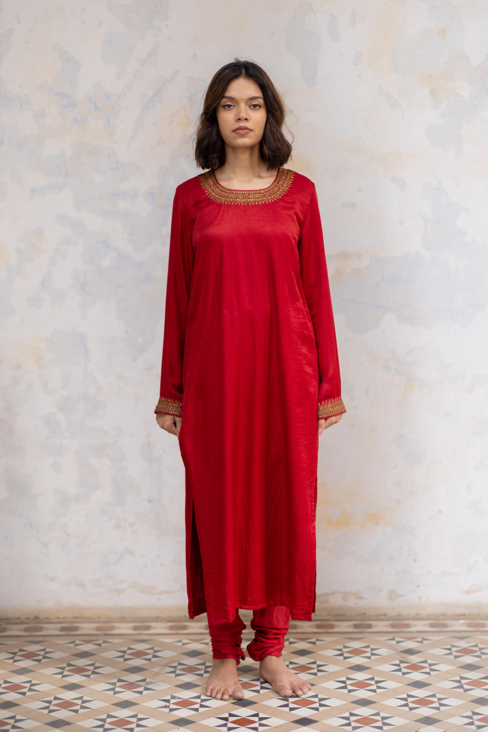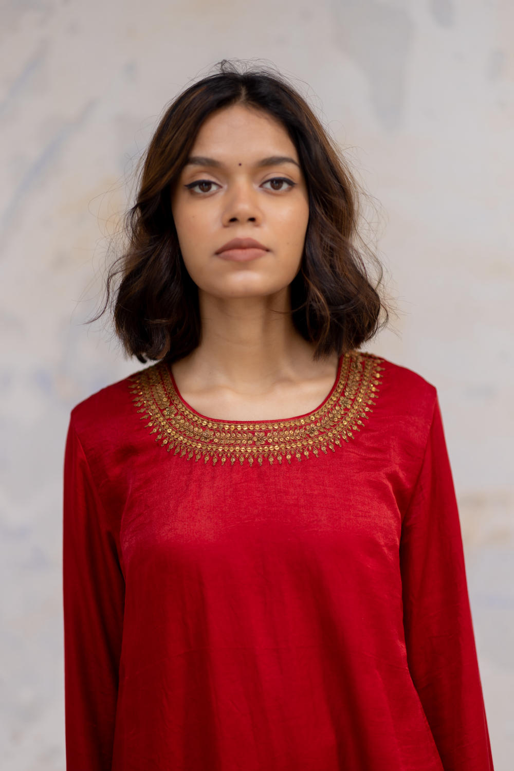Festive round neck kurta with full sleeves and rich marodi embroidery, this kurta pronounces femininity and softness in its craftsmanship.