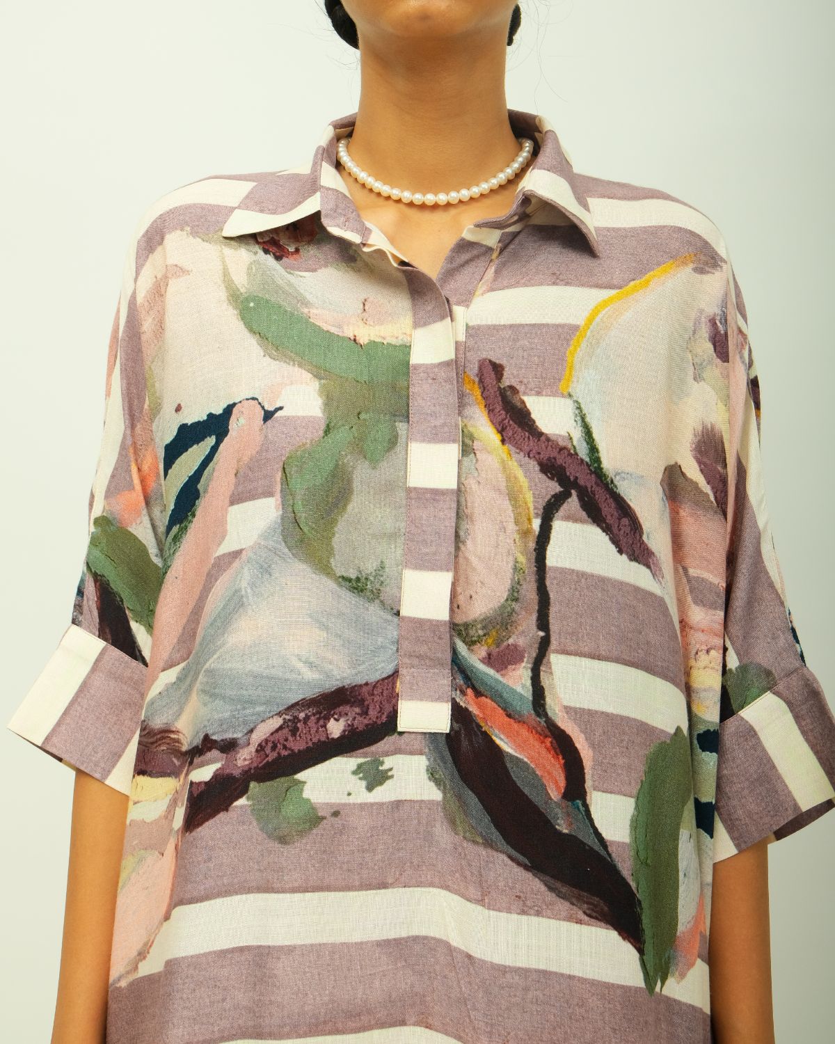 Top: An oversized shirt tunic with horizontal stripes in muted mauve and ivory, featuring a front placket and classic collar. The top showcases a digitally rendered print across the chest—originally hand-painted [print placement may vary]—adding an artistic flair to the structured silhouette.