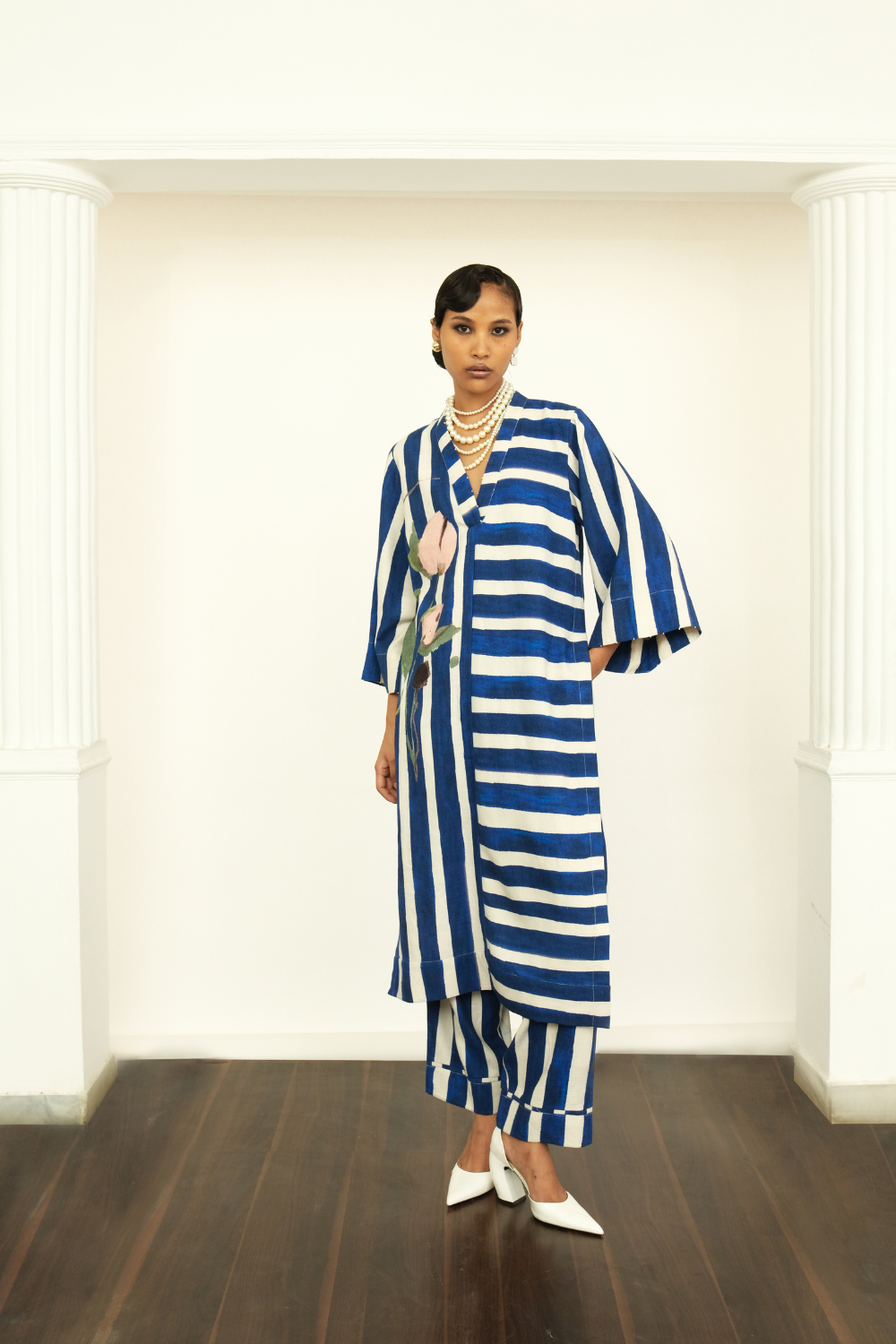 Lowers: Handpainted Signature Ofrida Stripes.Front belt, back elasticated lowers. Tapered Fit. Comes with a drawstring. Hand-painted abstract expressionist print. Side pockets, Relaxed Fit. Print placements will vary—single Piece.