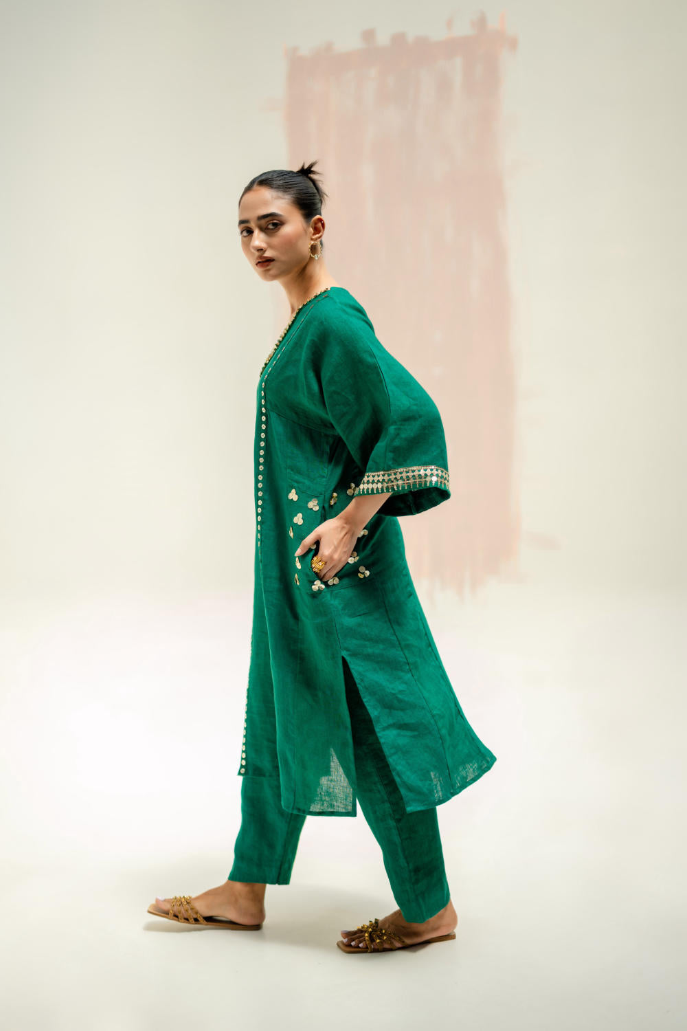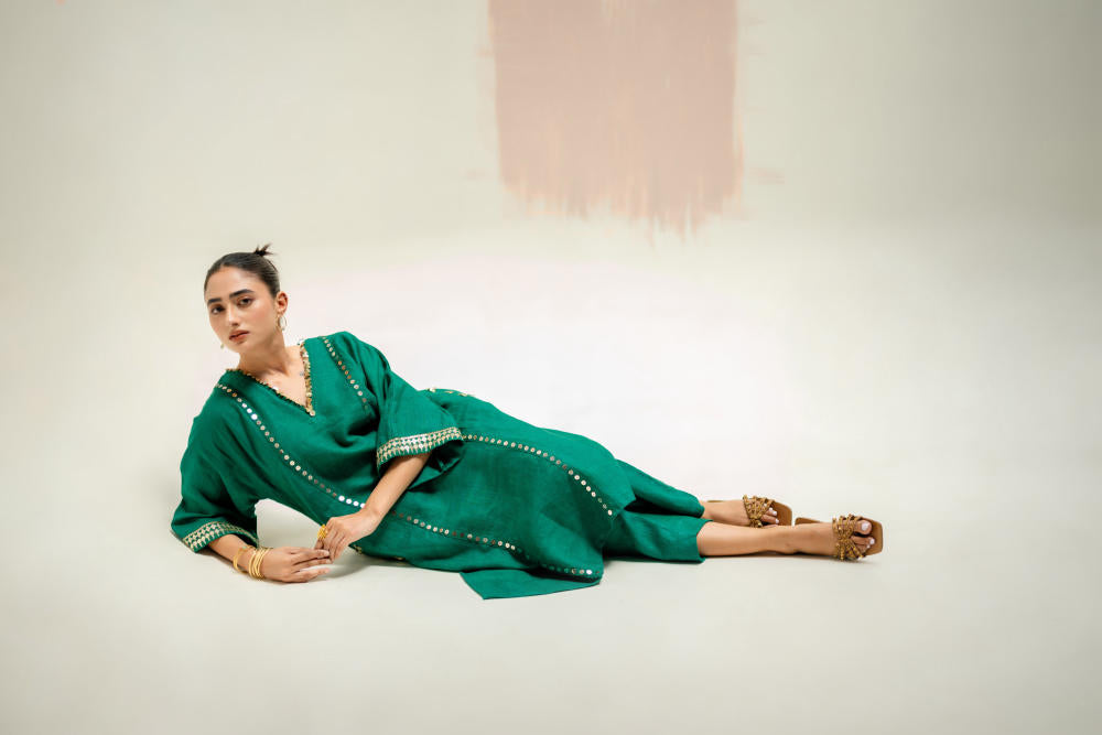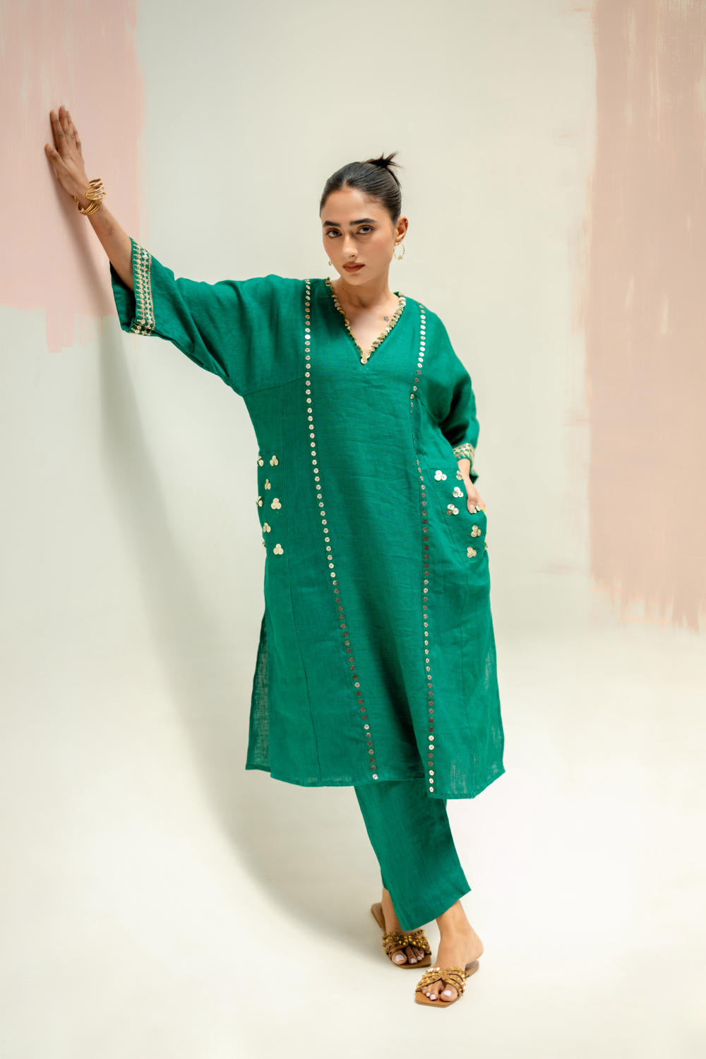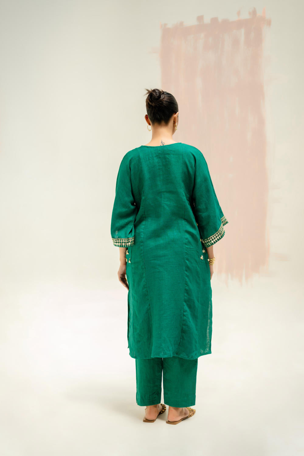 The emerald green Choga Kurta Set seamlessly blends style and sophistication. With hand-embroidered pockets and a distinctive Choga silhouette, this kurta is paired with slim linen pants for a refined look