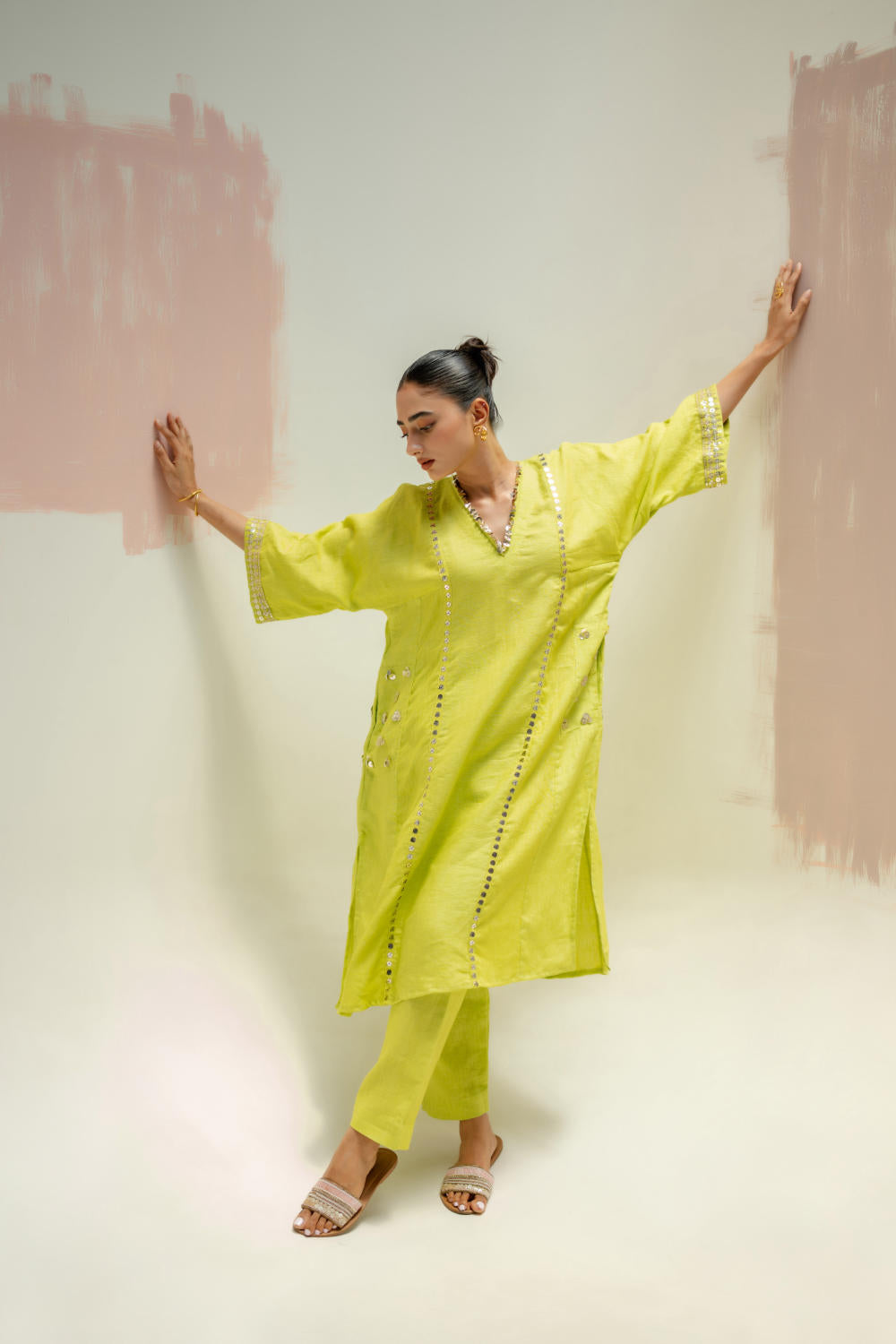The Sublime Neon Choga Kurta Set offers the perfect blend of style and sophistication. With hand-embroidered pockets and a distinctive Choga silhouette, the kurta is paired with slim linen pants, making it an ideal choice for all-day festivities