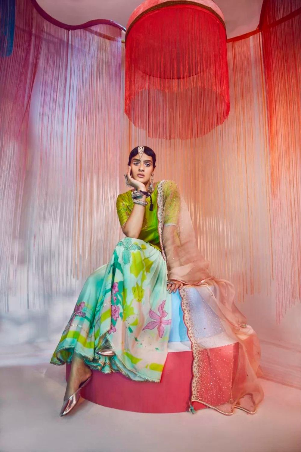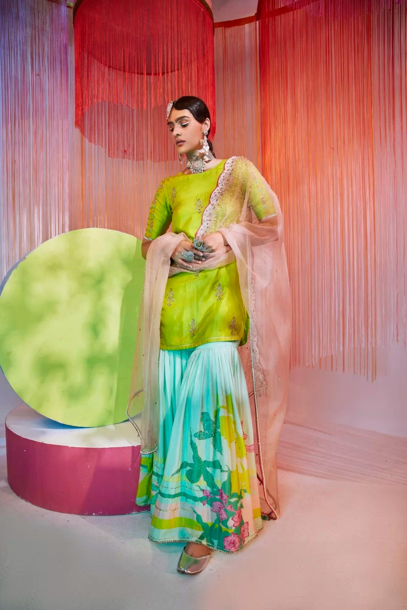Bright Green hand embroidered silk kurta with Powder Blue printed and embroidered crepe gharara. Along with Nude Pink pearl hand embroidered organza dupatta with tassel detailing.