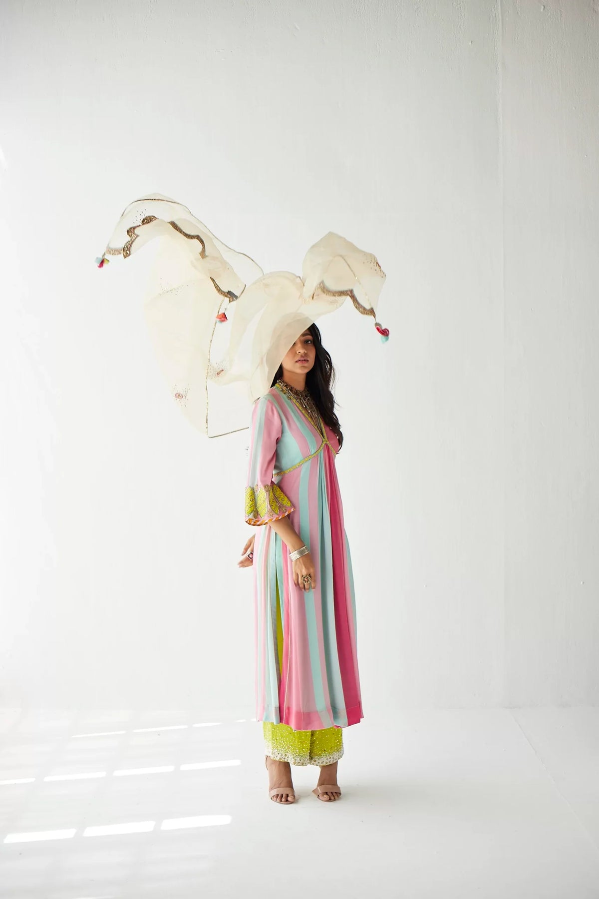 Bright pink – Powder blue printed striped crepe A-line kurta with hand embroidered neck and bell sleeves paired with lime green pearl hand embroidered palazzo.