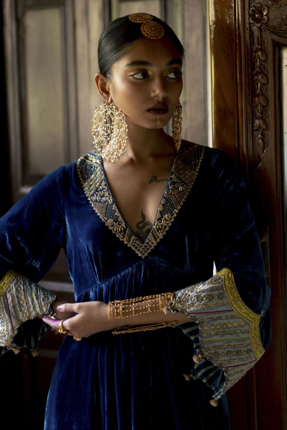 Blue silk velvet front puckering kurta with intricate hand emebroidered neckline and sleeves paired with velvet embroidered palazzo .