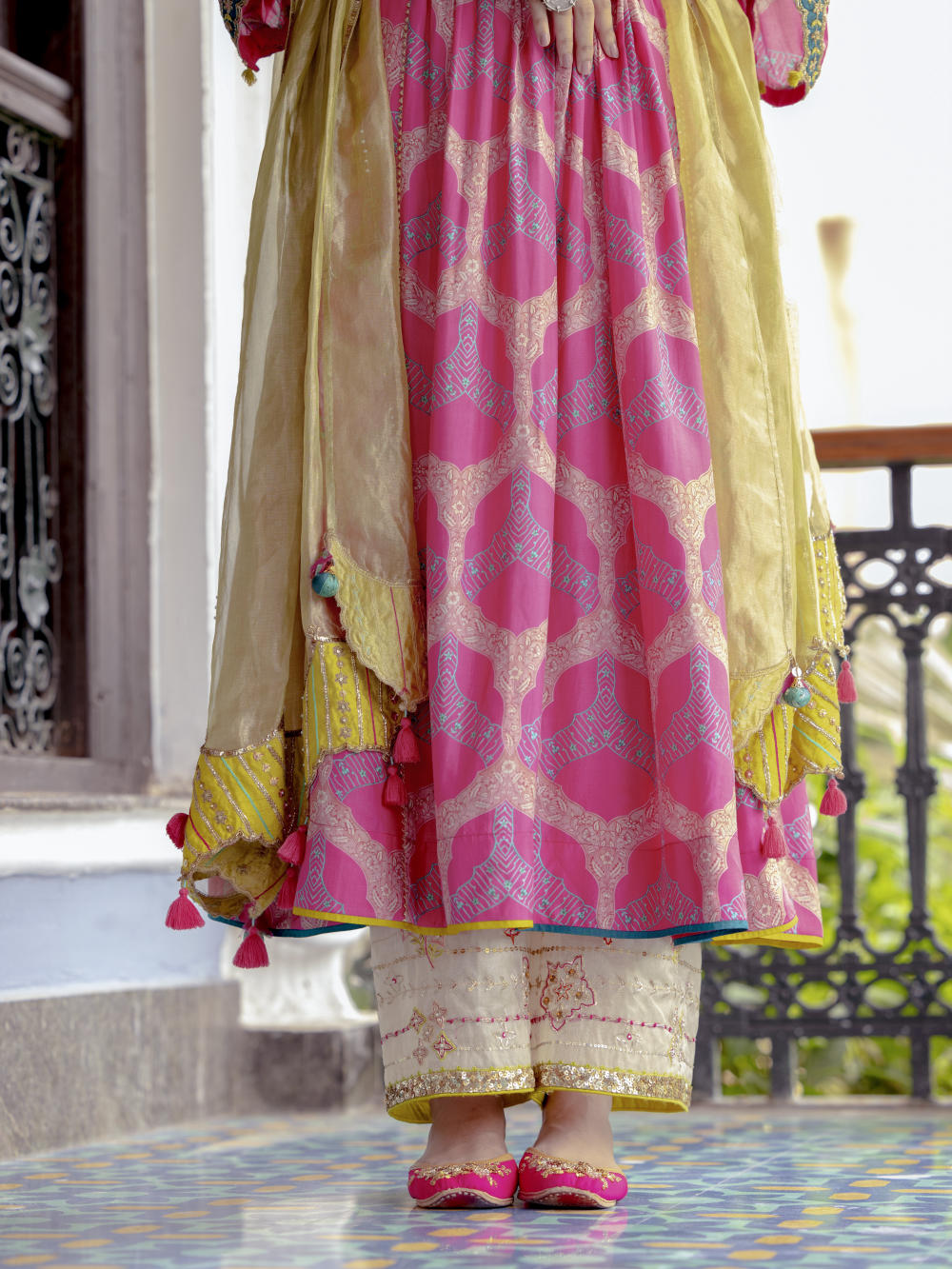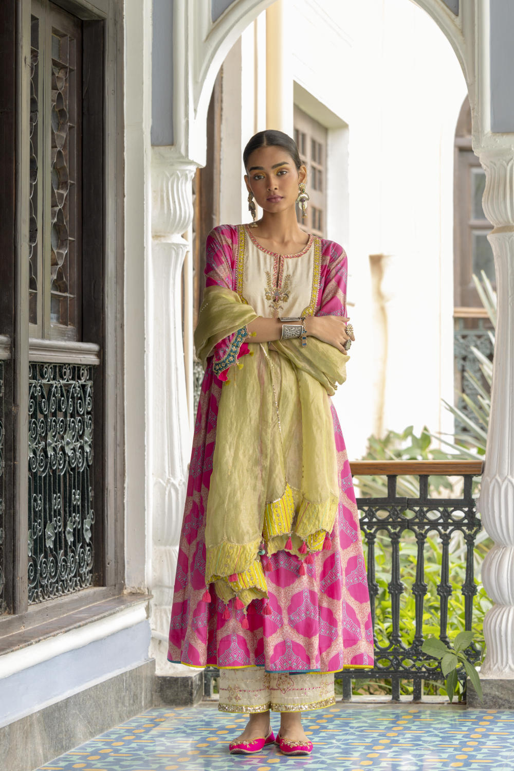 Hot Pink printed silk front puckering kurta with intricate hand embroidered yoke and sleeves. Paired with hand embroidered ivory palazzo and green tissue organza dupatta.