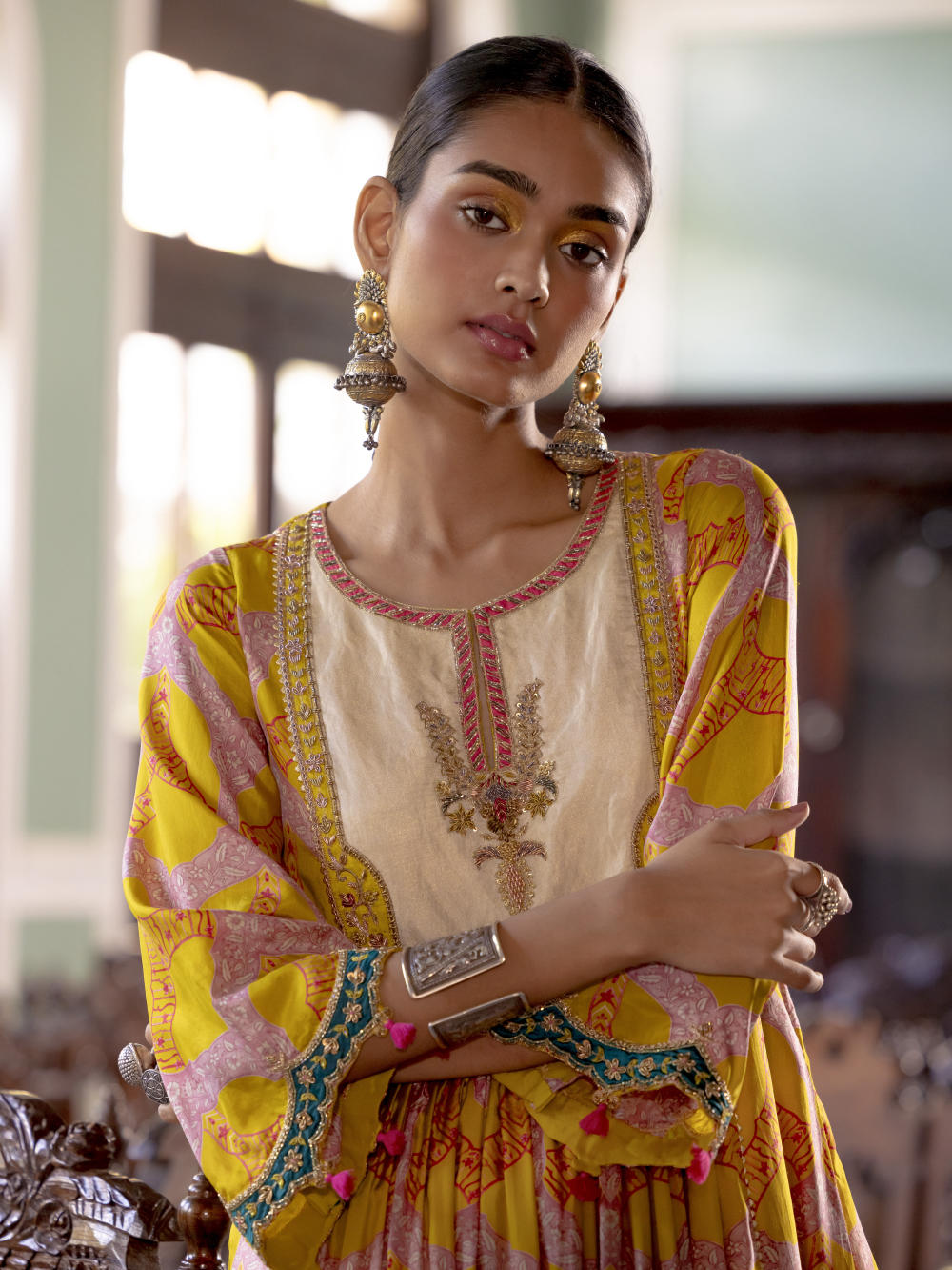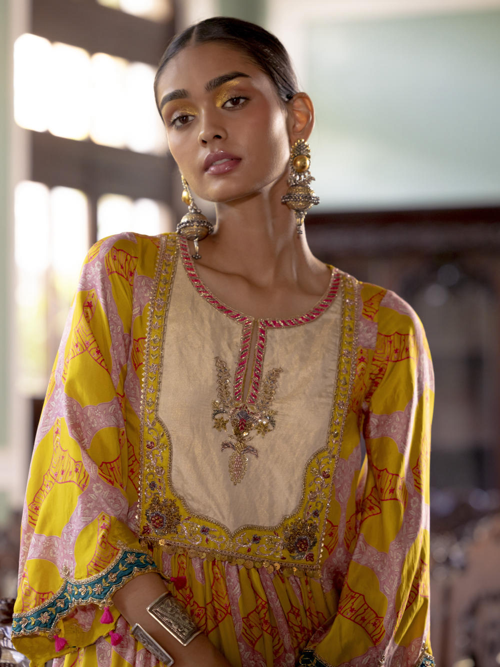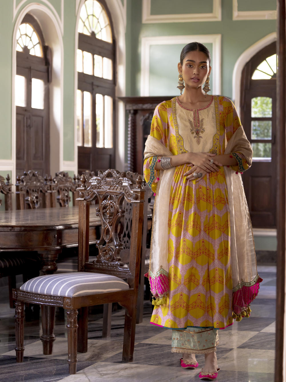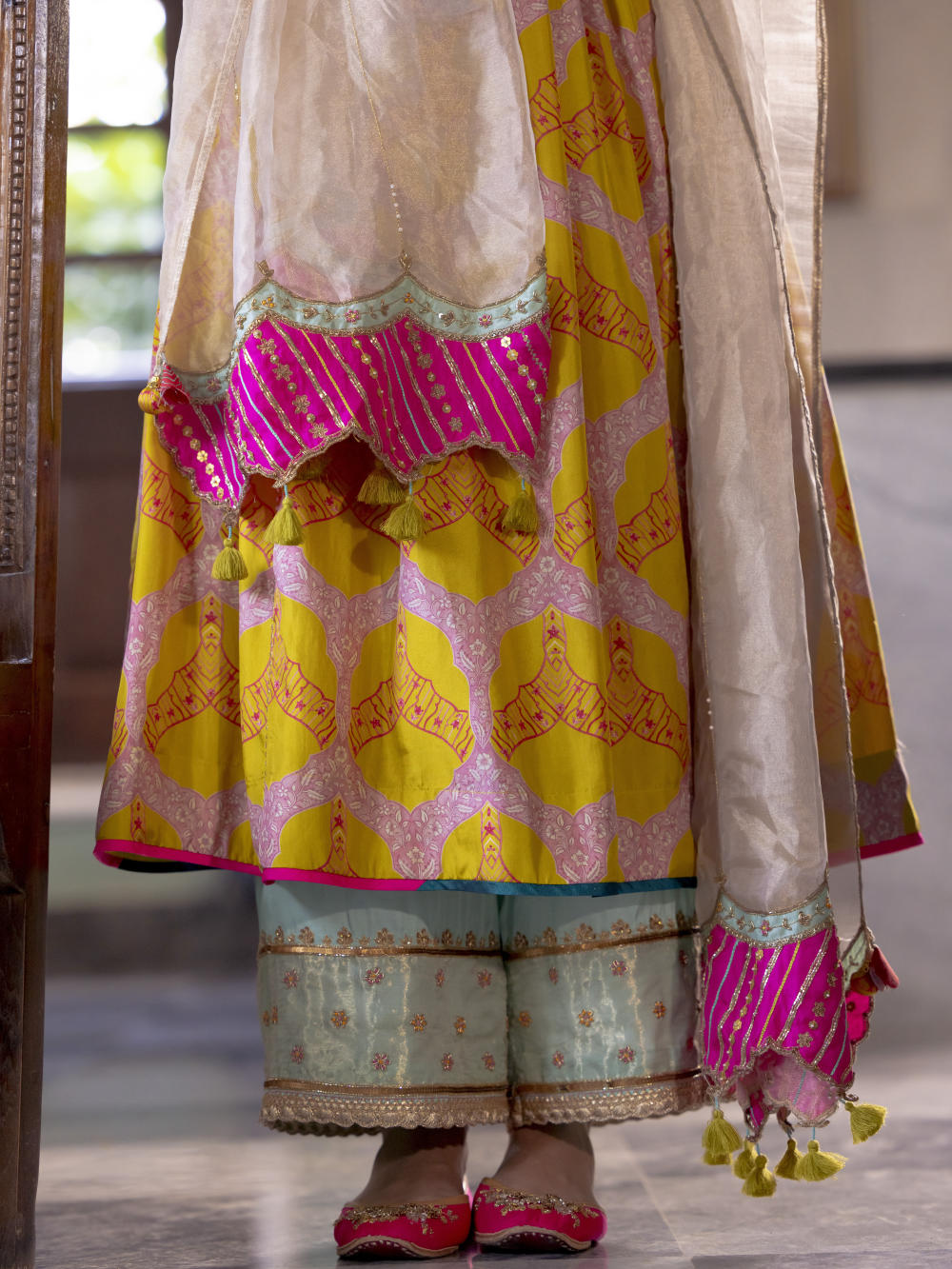 Lime Yellow printed silk front puckering kurta with intricate hand embroidered yoke and sleeves. Paired with hand embroidered Powder Blue palazzo and Ivory tissue organza dupatta with tassel detailing.