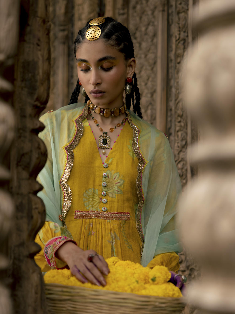 Lime Yellow printed chanderi tissue front puckering kurta with intricate hand embroidered back yoke and cuffs. Paired with Powder Blue hand embroidered organza dupatta and pink embroidered salwar.
