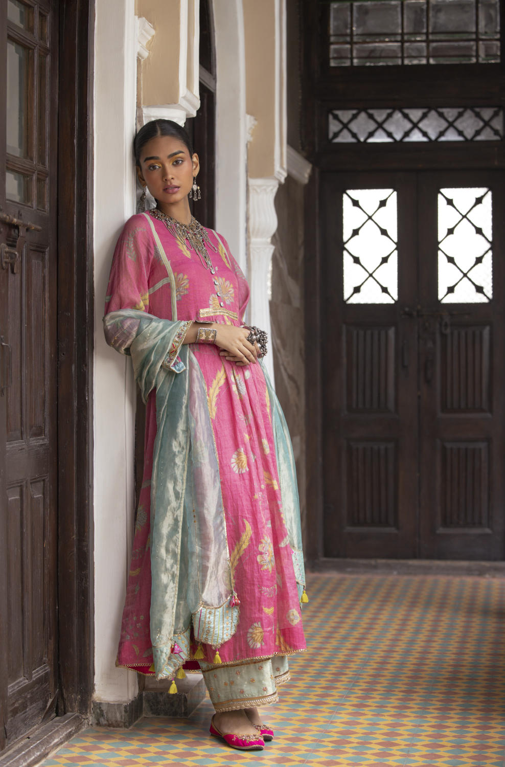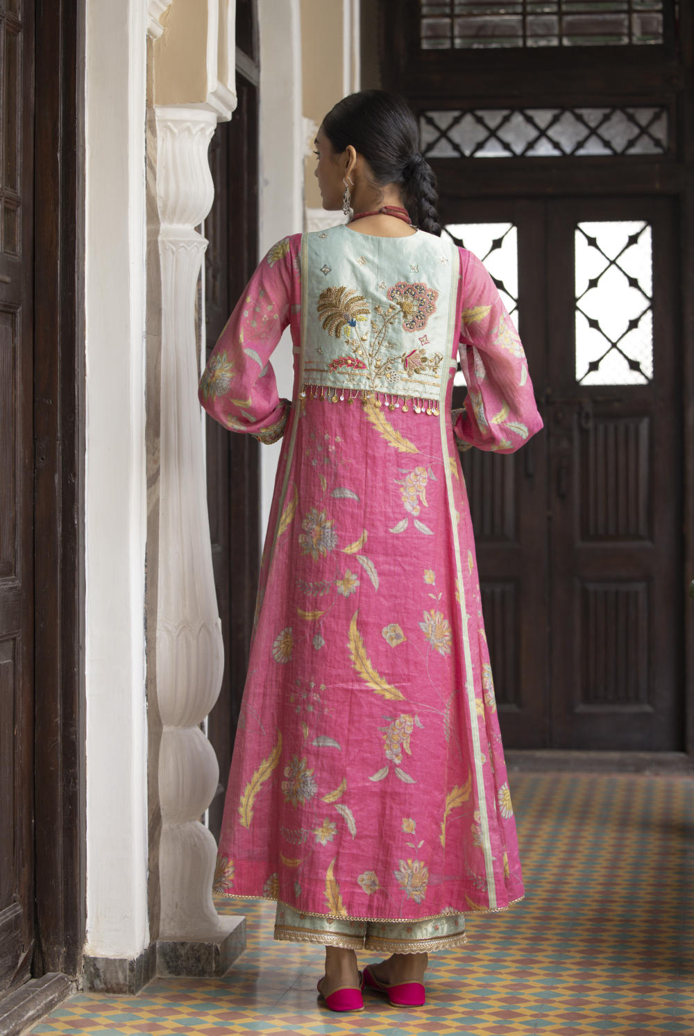 Pink printed chanderi tissue front puckering kurta with intricate hand embroidered back yoke and cuffs. Paired with Powder Blue hand embroidered tissue dupatta and palazzo.