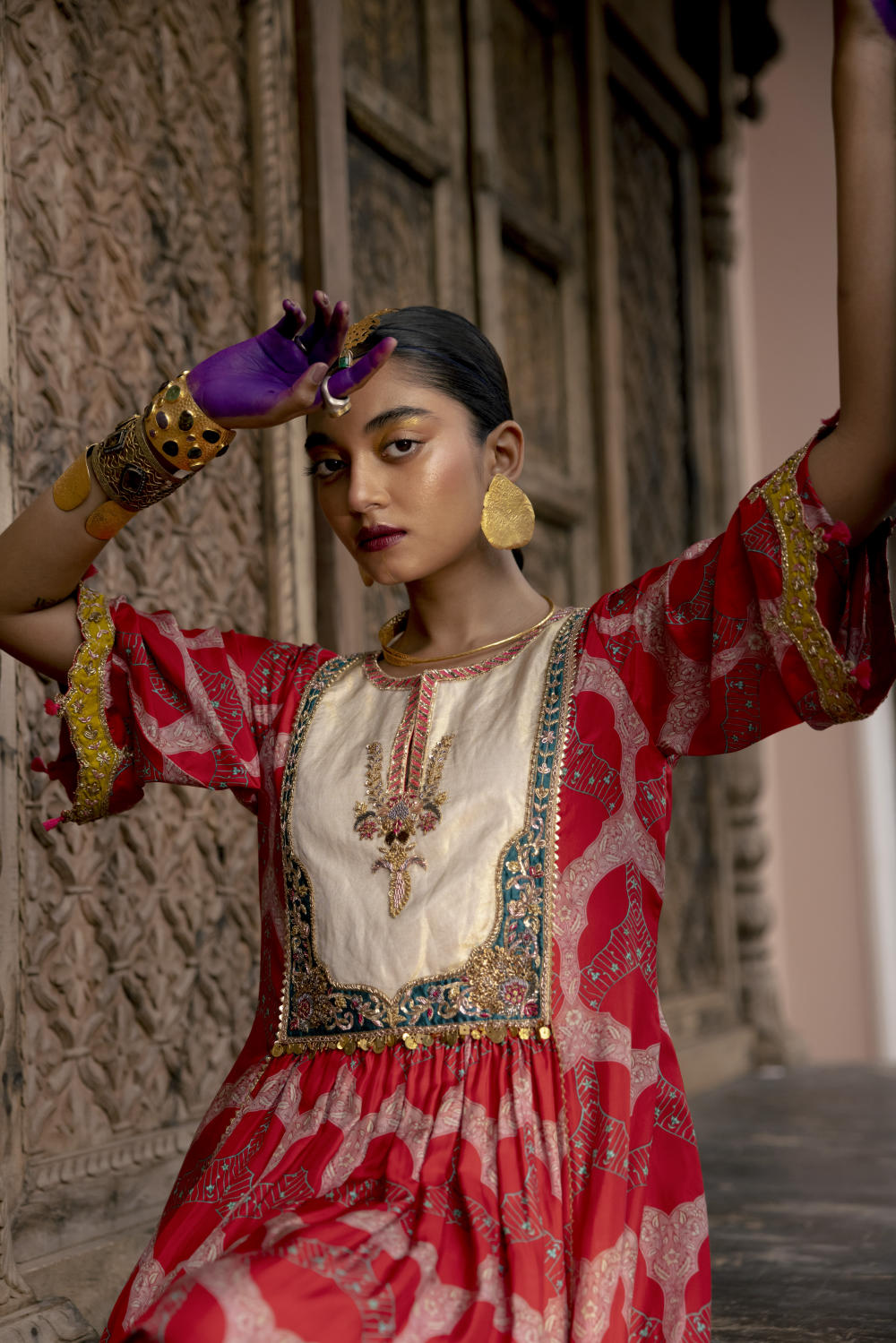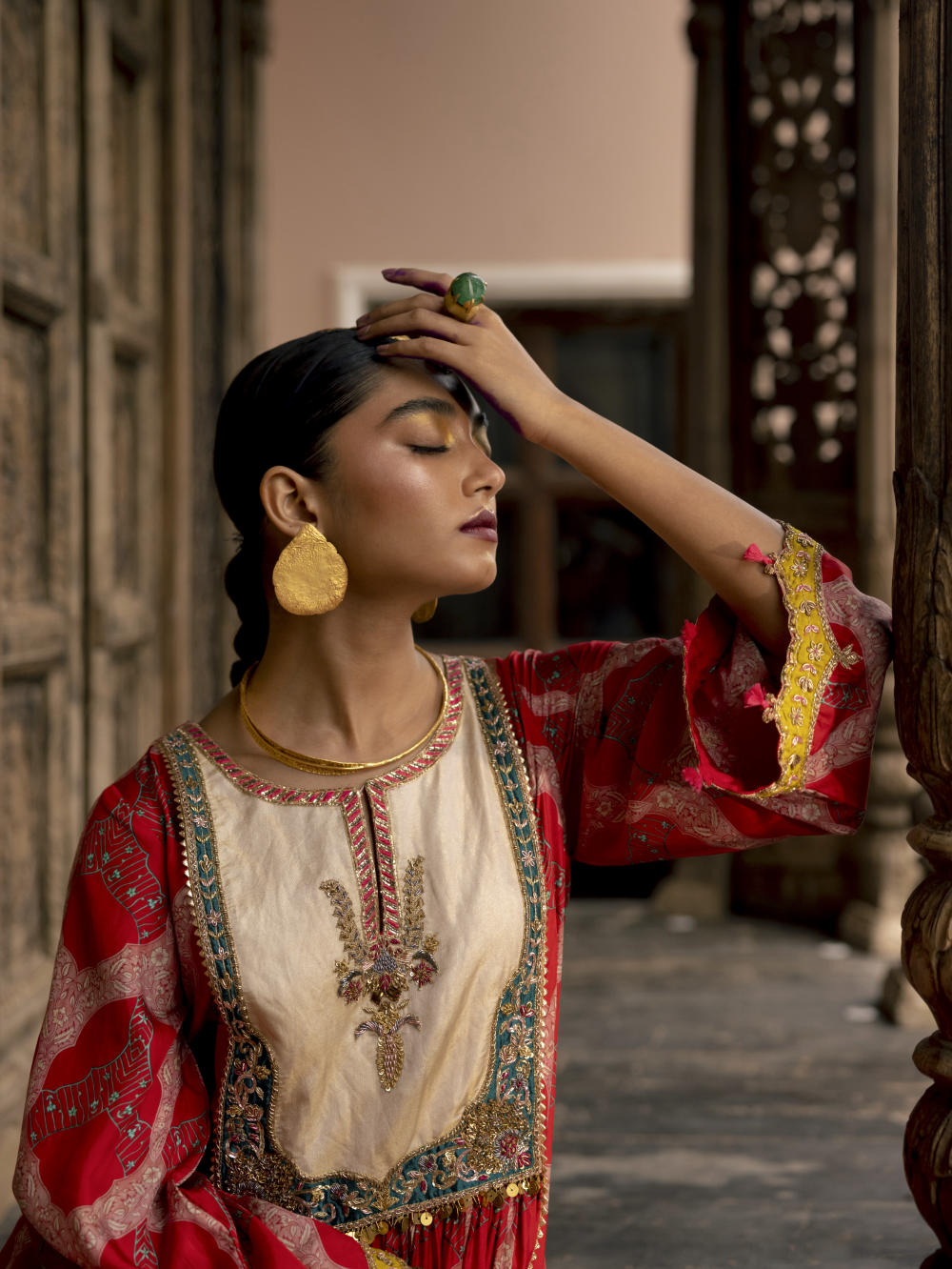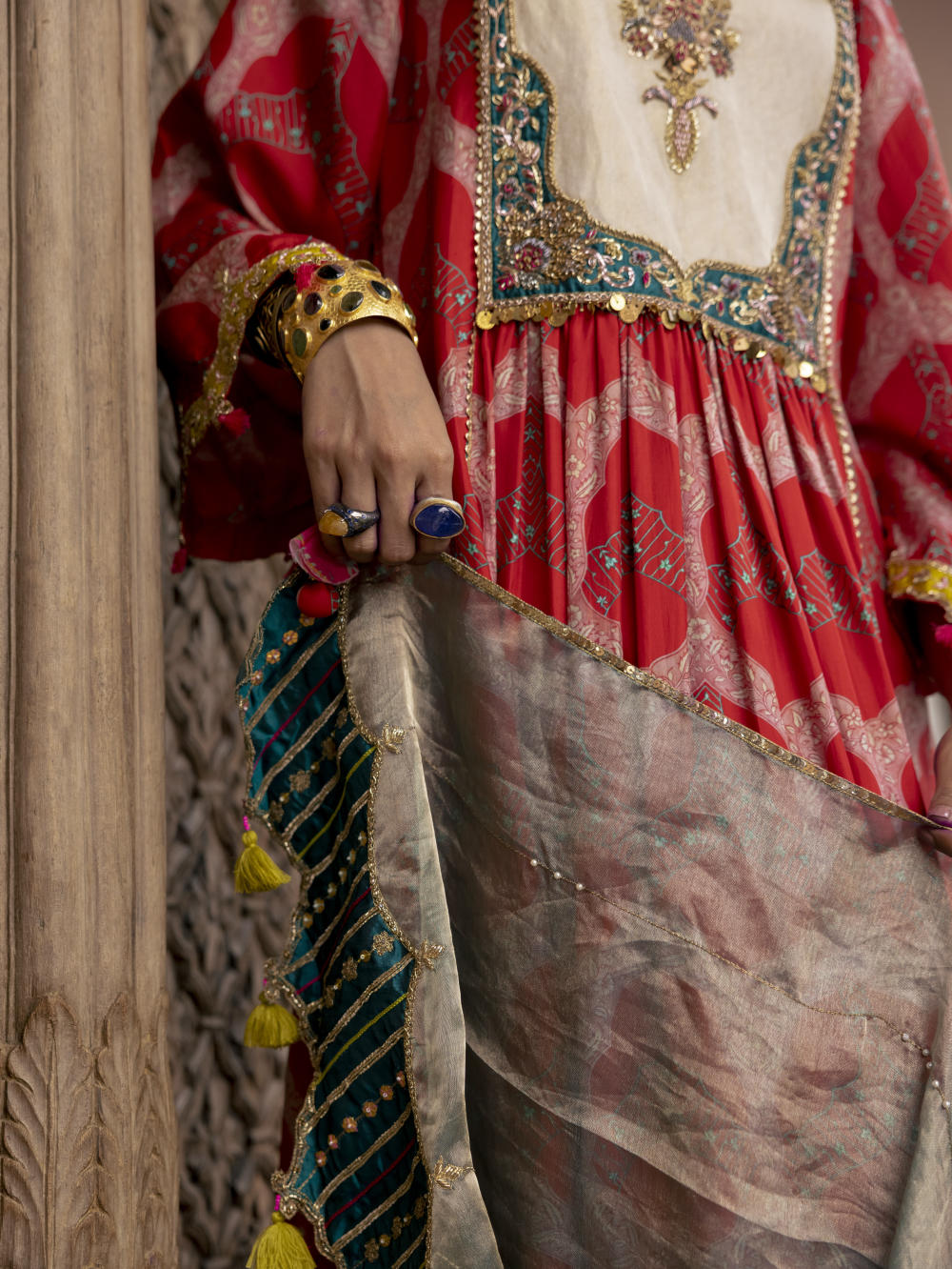 Red printed silk front puckering kurta with intricate hand embroidered yoke and sleeves. Paired with hand embroidered ivory palazzo and teal tissue organza dupatta.