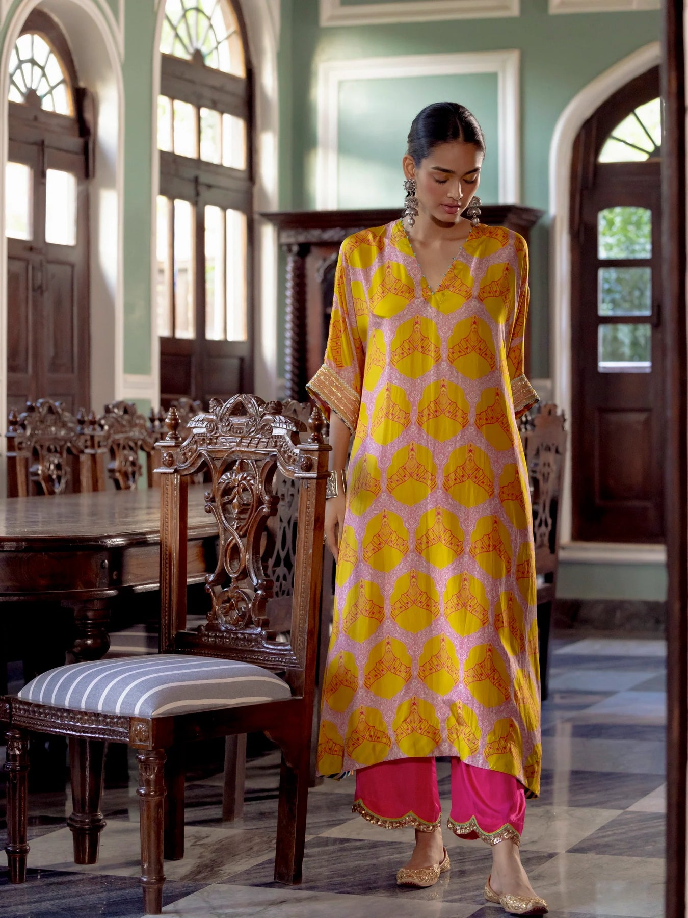 Yellow printed silk kaftan kurta with intricate hand embroidered sleeves paired with Hot Pink modal satin palazzo with scalloped embroidery.