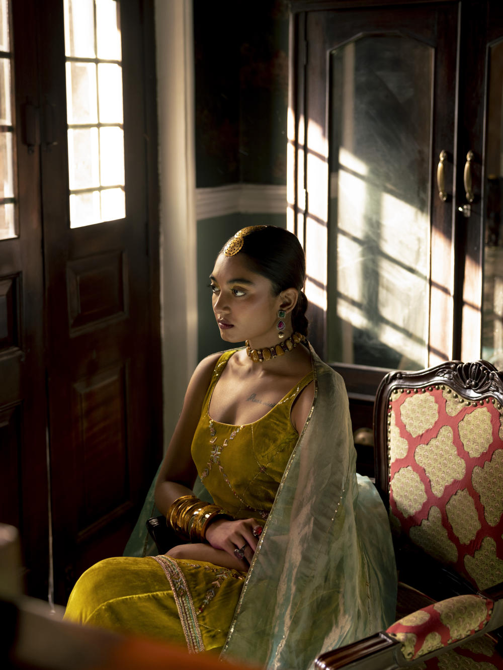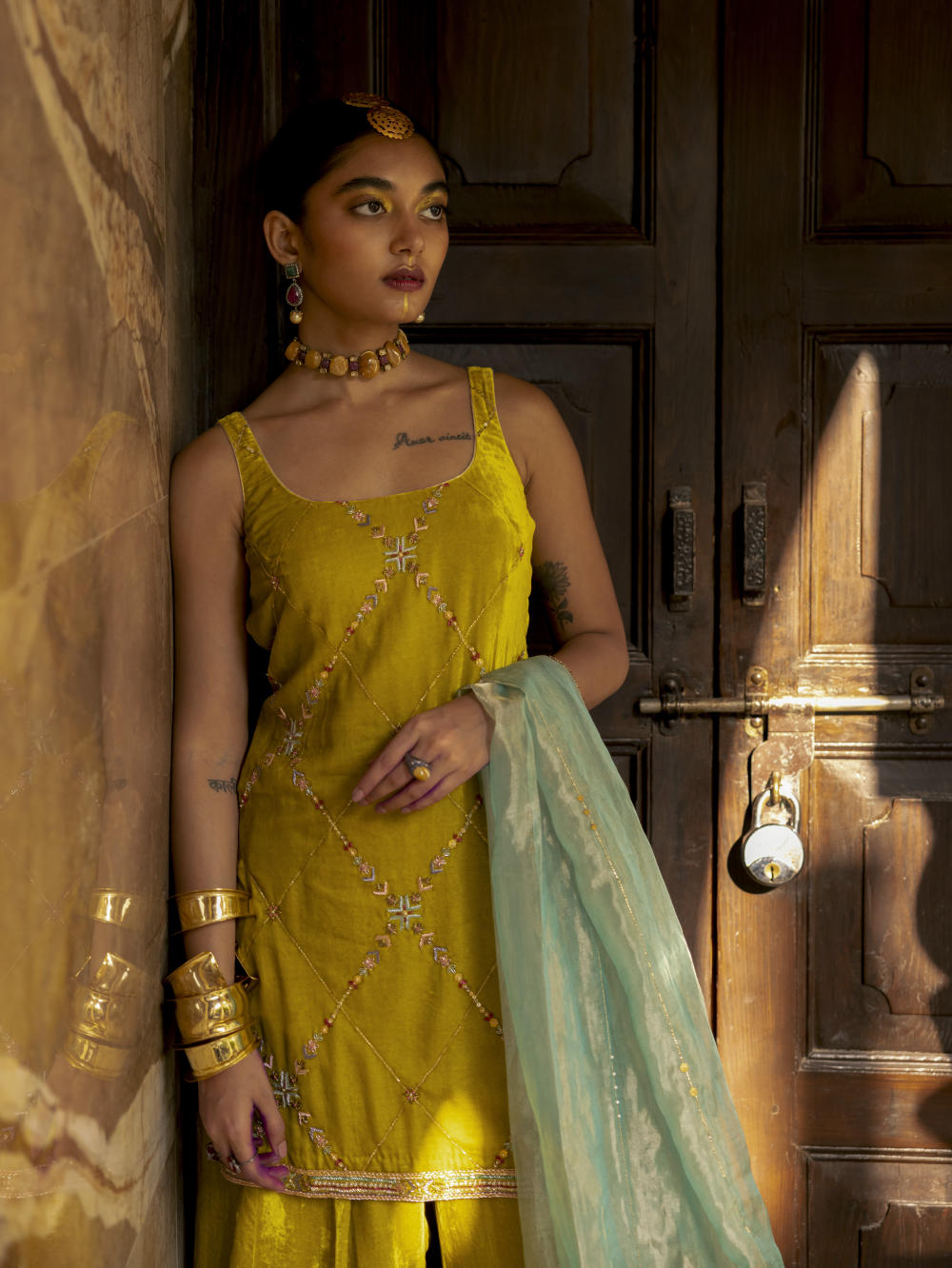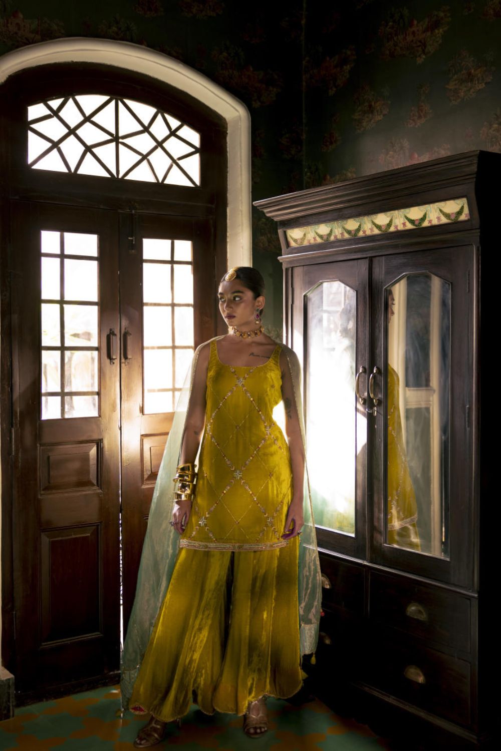 Yellow silk velvet short kurta with intricate hand embroidery paired with velvet sharara with scalloped hemline detailed with gotta, Along with hand embroidered Powder Blue Tissue dupatta.