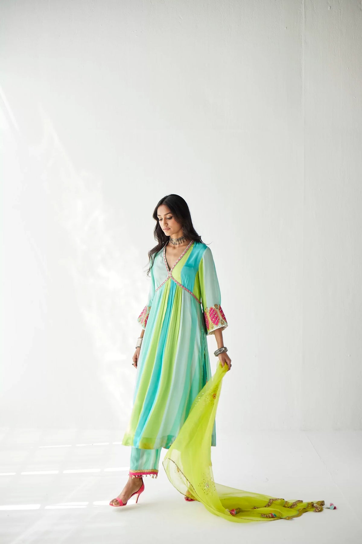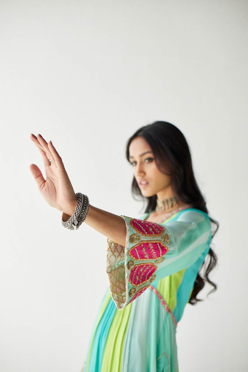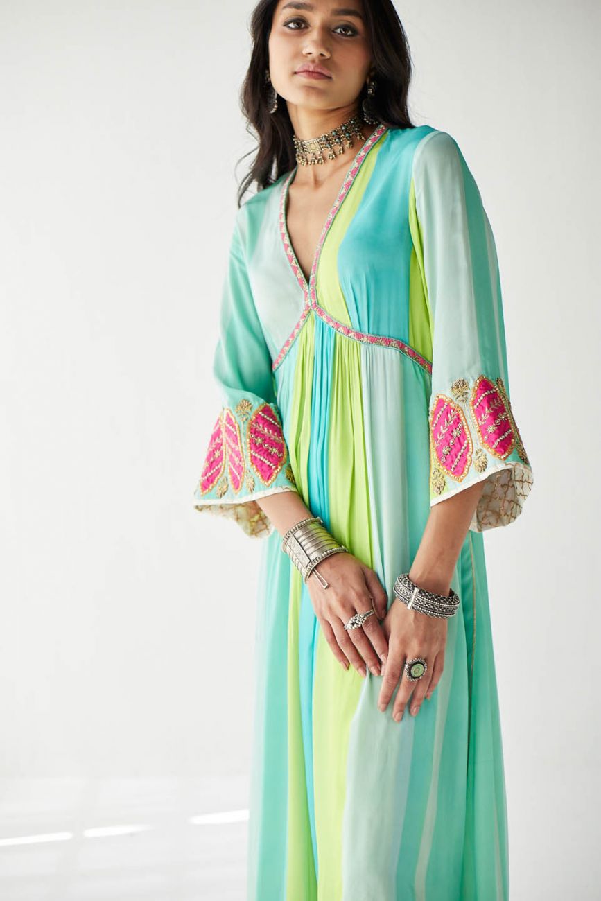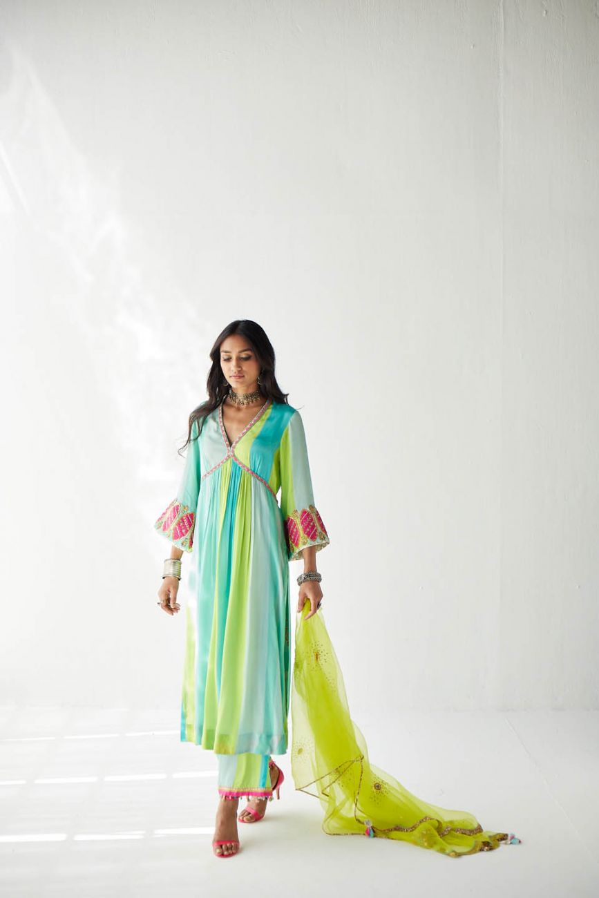 Ferozy – Green printed striped crepe A-line kurta with hand embroidered neck and bell sleeves paired with printed palazzo with tassel detailing. Paired with lime green hand embroidered organza dupatta.
