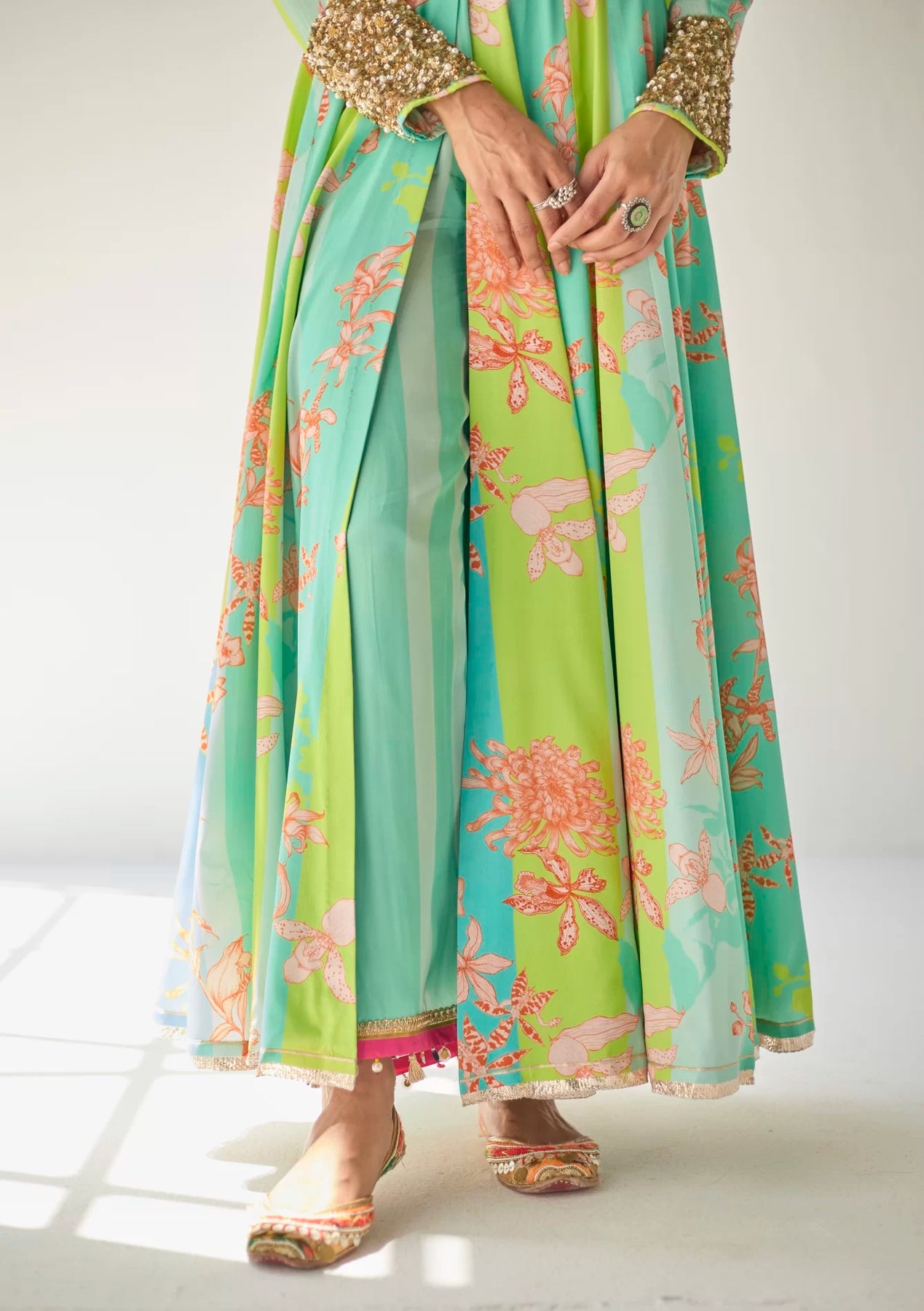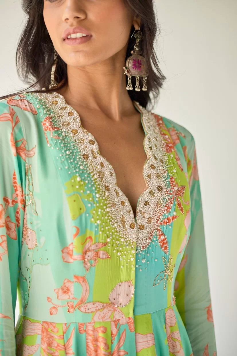 Ferozy – Green printed crepe front slit anarkali with intricate pearl hand embroidered scallop neck and sleeves, paired with printed crepe palazzo with tassel detailing.