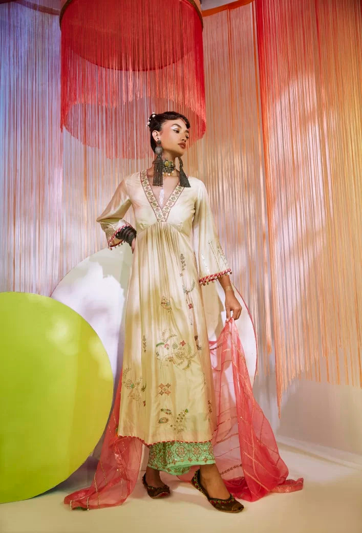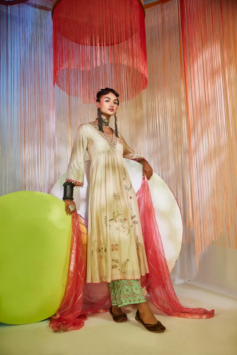 Ivory silk kurta with intricate hand embroidery, paired with embroidered sea green palazzo . Along with bright pink hand embroidered organza dupatta .