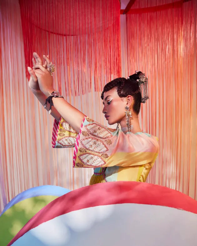 Their work is an ode to handcrafted Indian design — rooted in traditional embroidery techniques like zardozi, dabkaa, and fine threadwork, yet shaped into silhouettes that feel refreshingly contemporary. Clean cuts, relaxed forms, pure fabrics, and a distinctive palette come together to create pieces that travel seamlessly from India to Singapore and beyond.