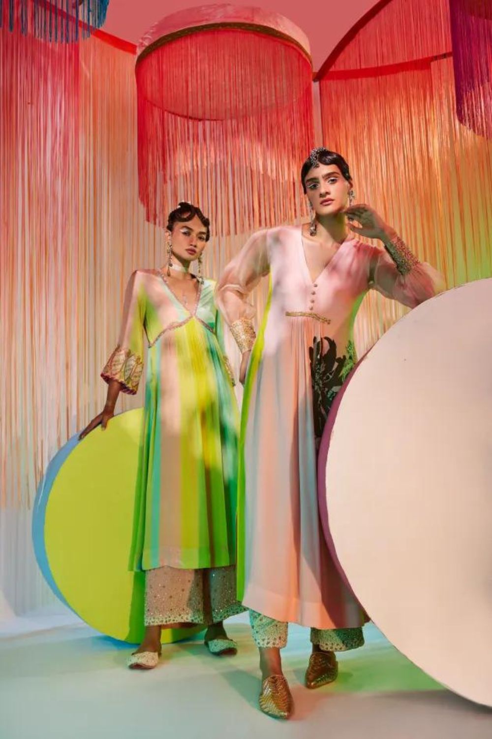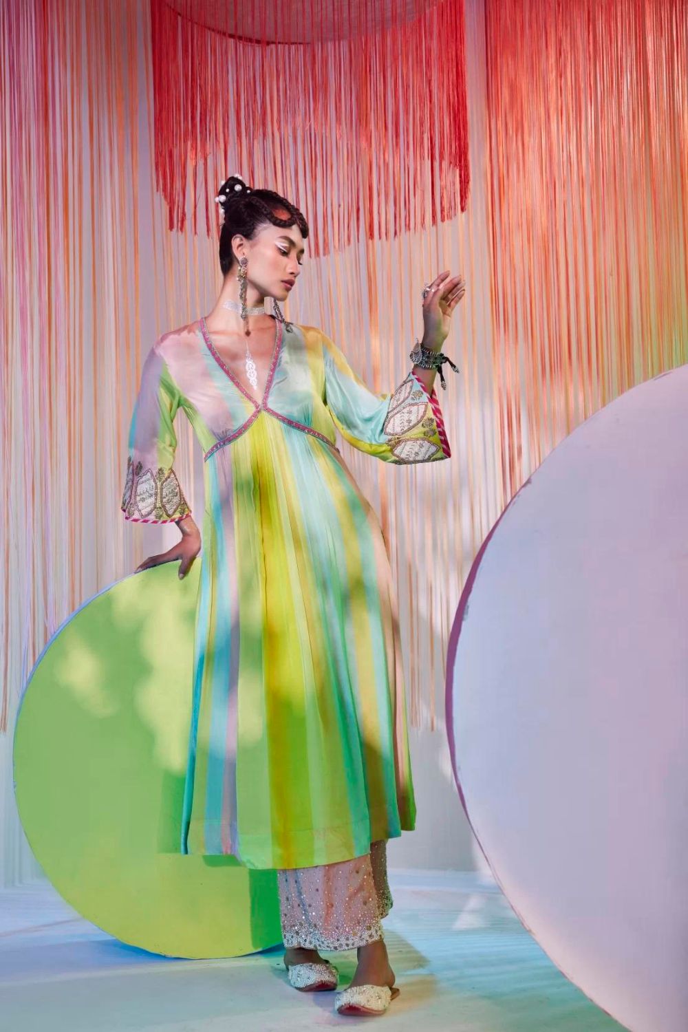Lime yellow – Powder blue printed striped crepe A-line kurta with hand embroidered neck and bell sleeves paired with nude pink pearl hand embroidered palazzo.