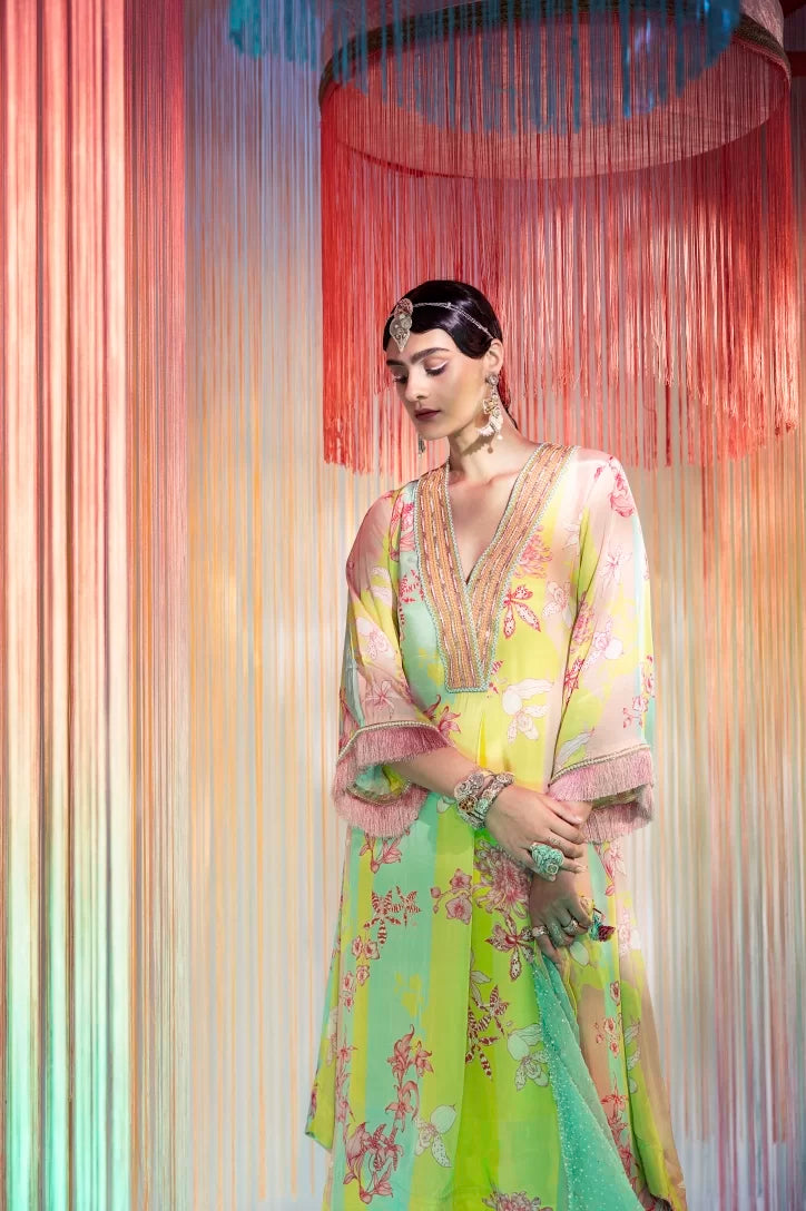 Lime Yellow – Powder Pink printed crepe kurta with intricate hand embroidered neck and tassels on sleeves with assymtrical hemline . Paired with powder blue pearl hand embroidered palazzo and organza dupatta with tassel detailing.
