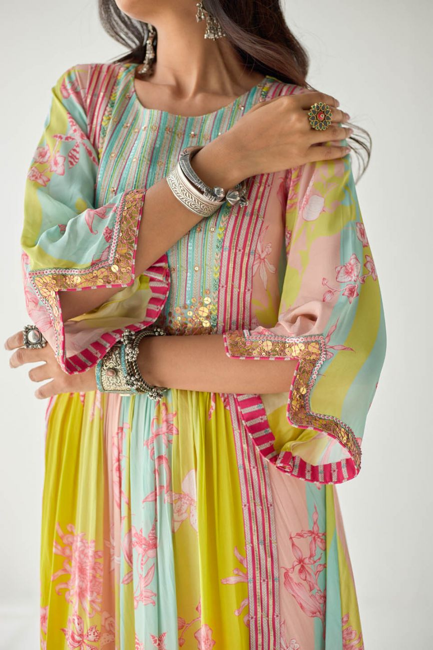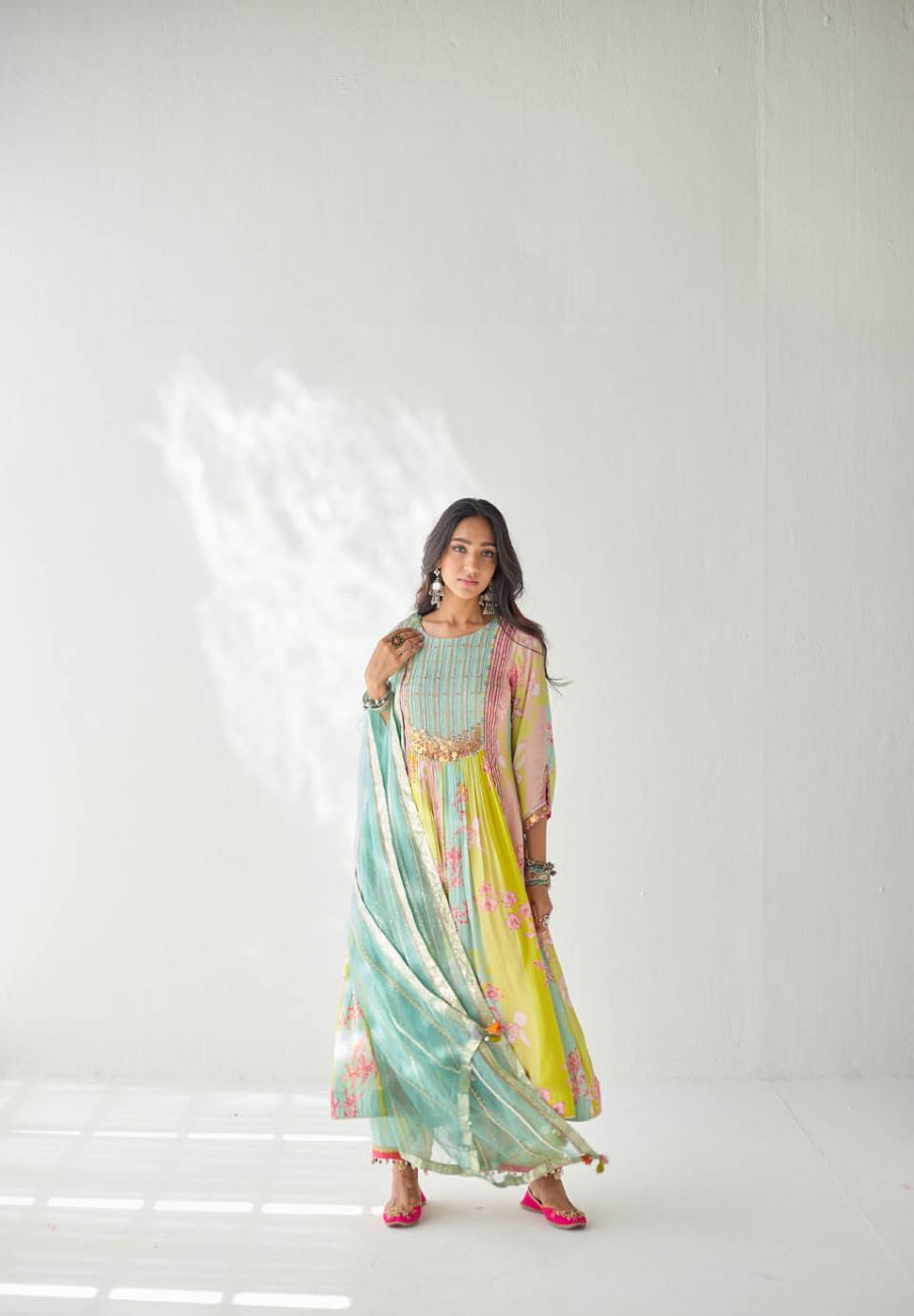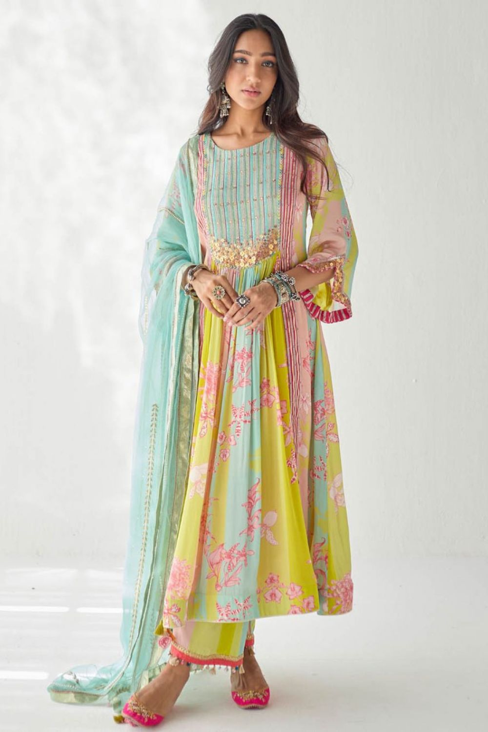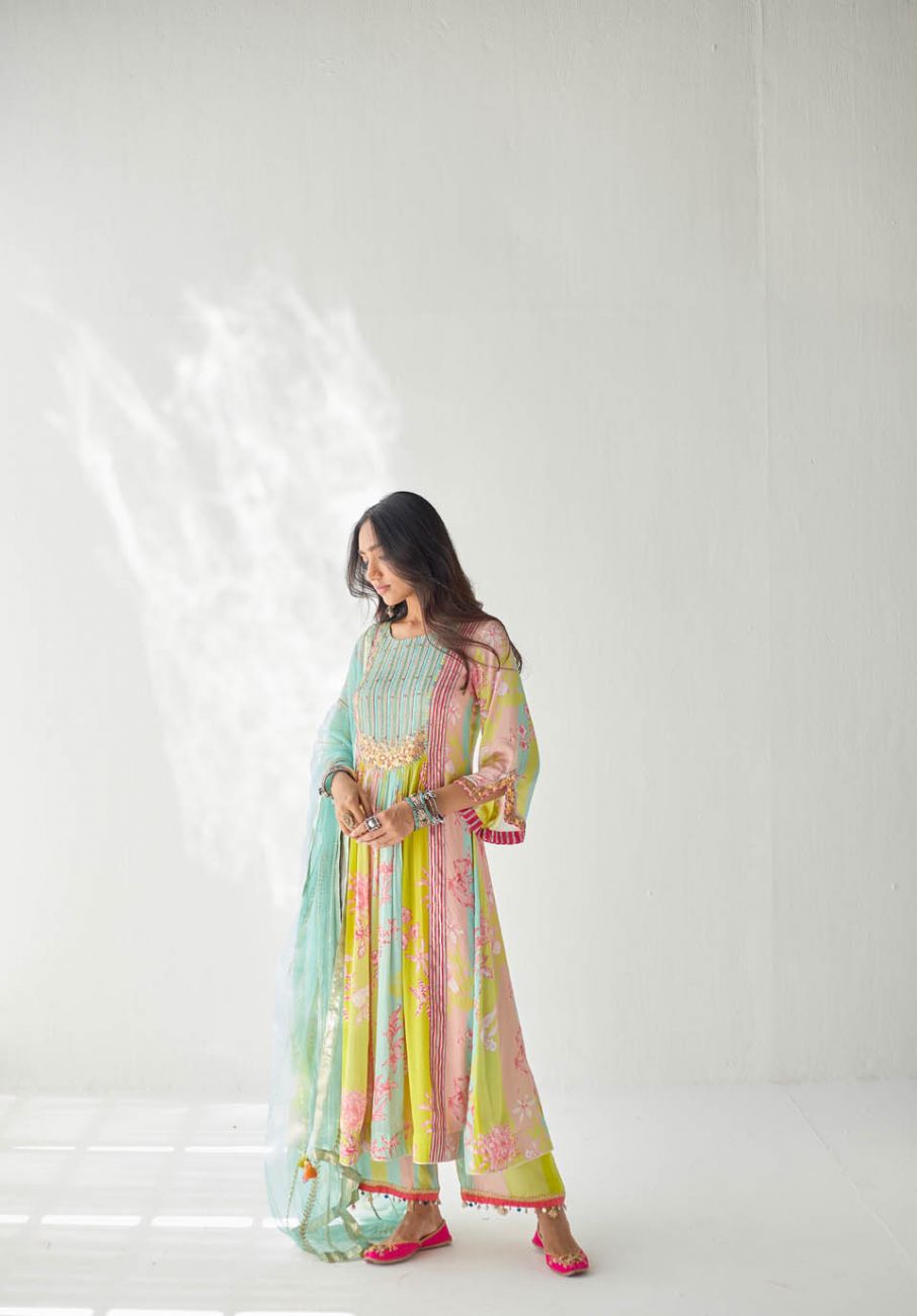 Lime Yellow printed crepe front puckering kurta with intricate hand embroidered yoke and sleeves. Paired with printed crepe palazzo with tassel detailing and hand embroidered bright lime organza dupatta.