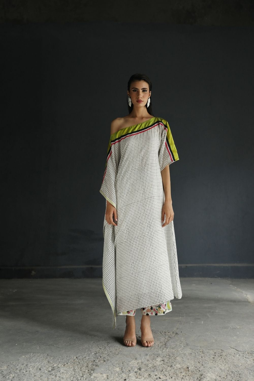 Printed cotton silk off shoulder kaftan with silk finishings paired with intricate Embroidered Printed palazzo