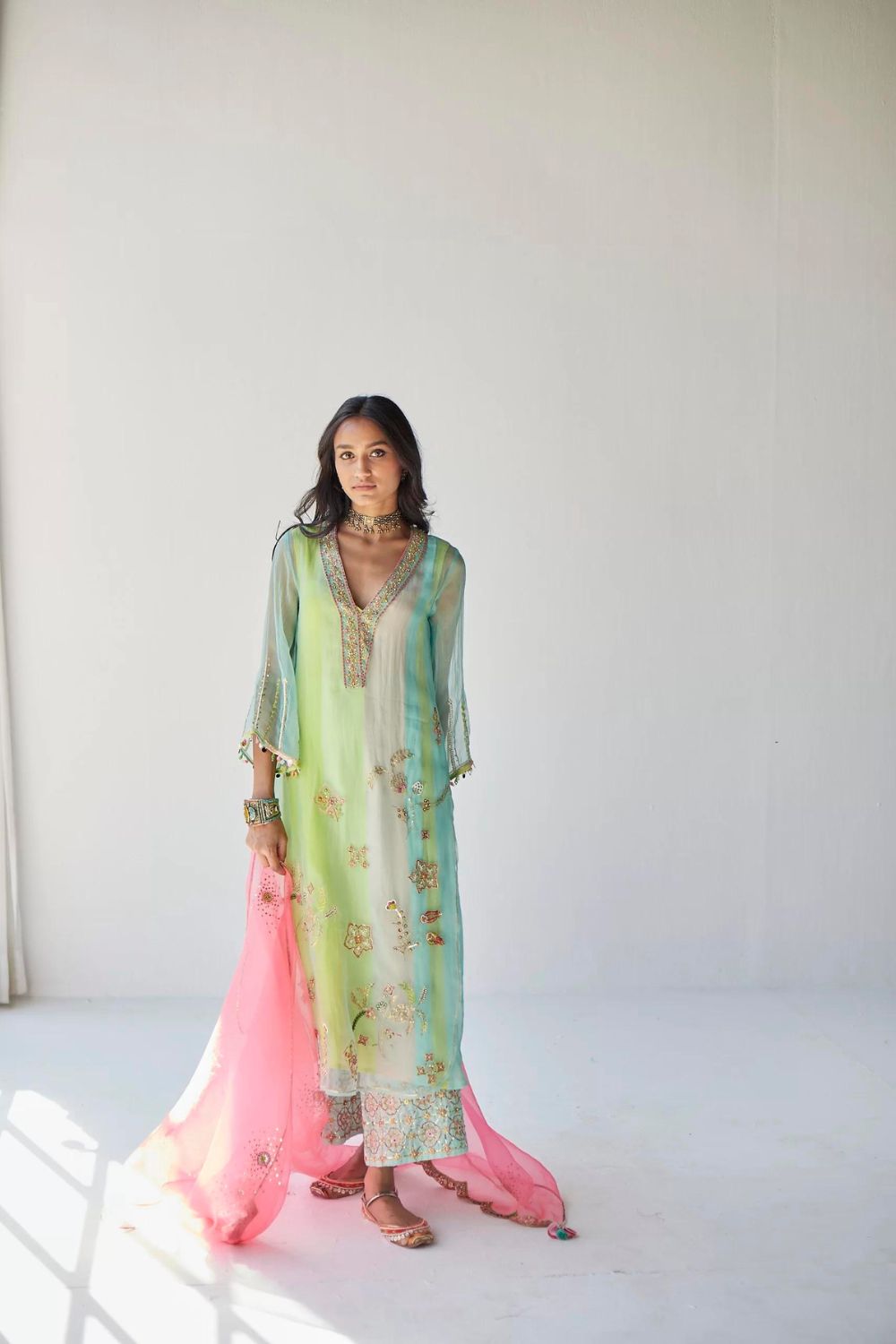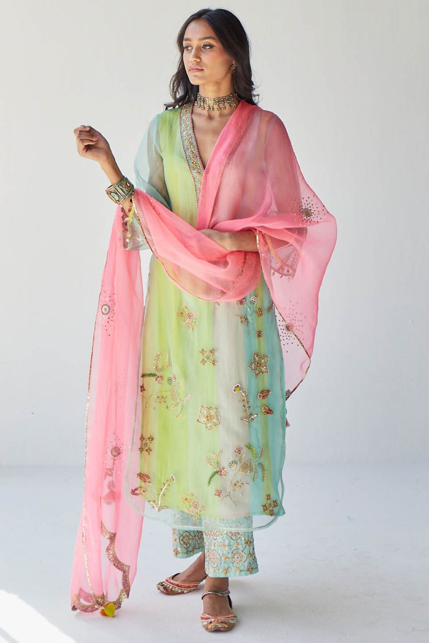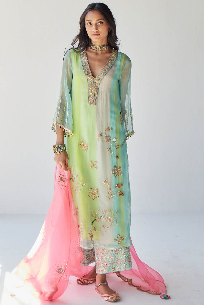 Powder blue organza kurta with intricate hand embroidery paired with embroidered bright green palazzo . Along with blush pink hand embroidered organza dupatta .