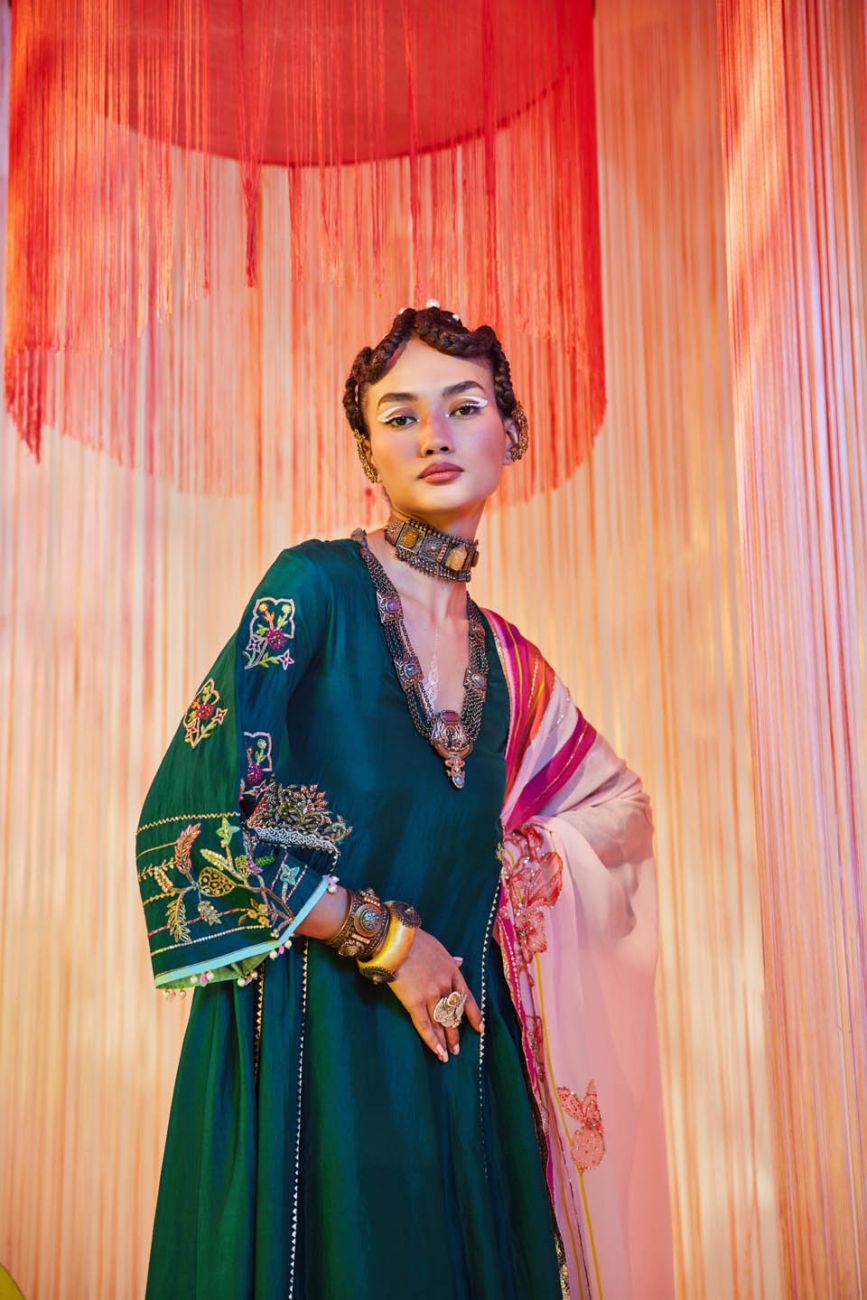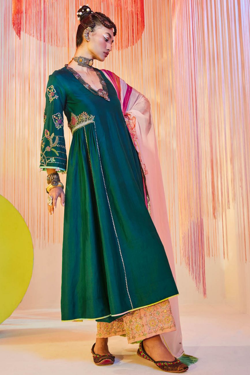 Teal Green silk kurta with hand embroidery on side kali and sleeves paired with nude pink hand embroidered palazzo. Along with Nude pink printed hand embroidered crepe dupatta with fringe detailing.