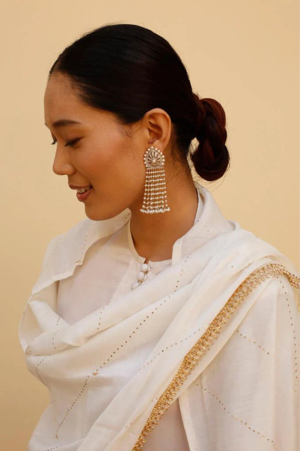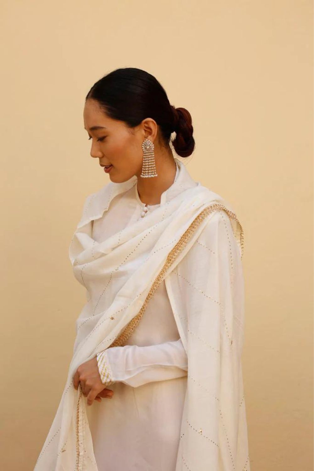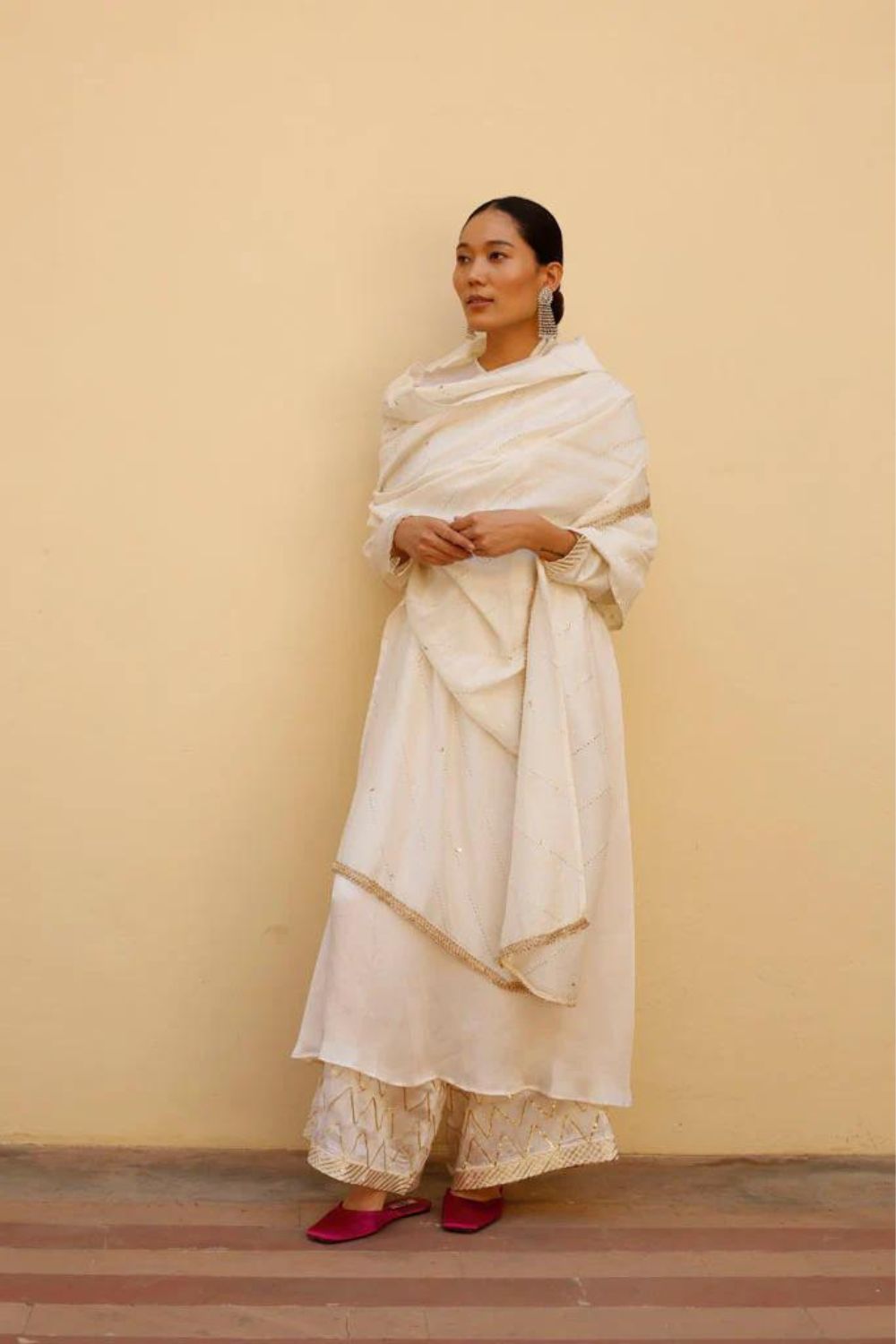 Cotton satin vanilla colored a-line flowy set of 3 with Gota detailing on the wide legged ijaar pajama. Dupatta is embroidered with golden lace and beaten mukaish work in a linear design.