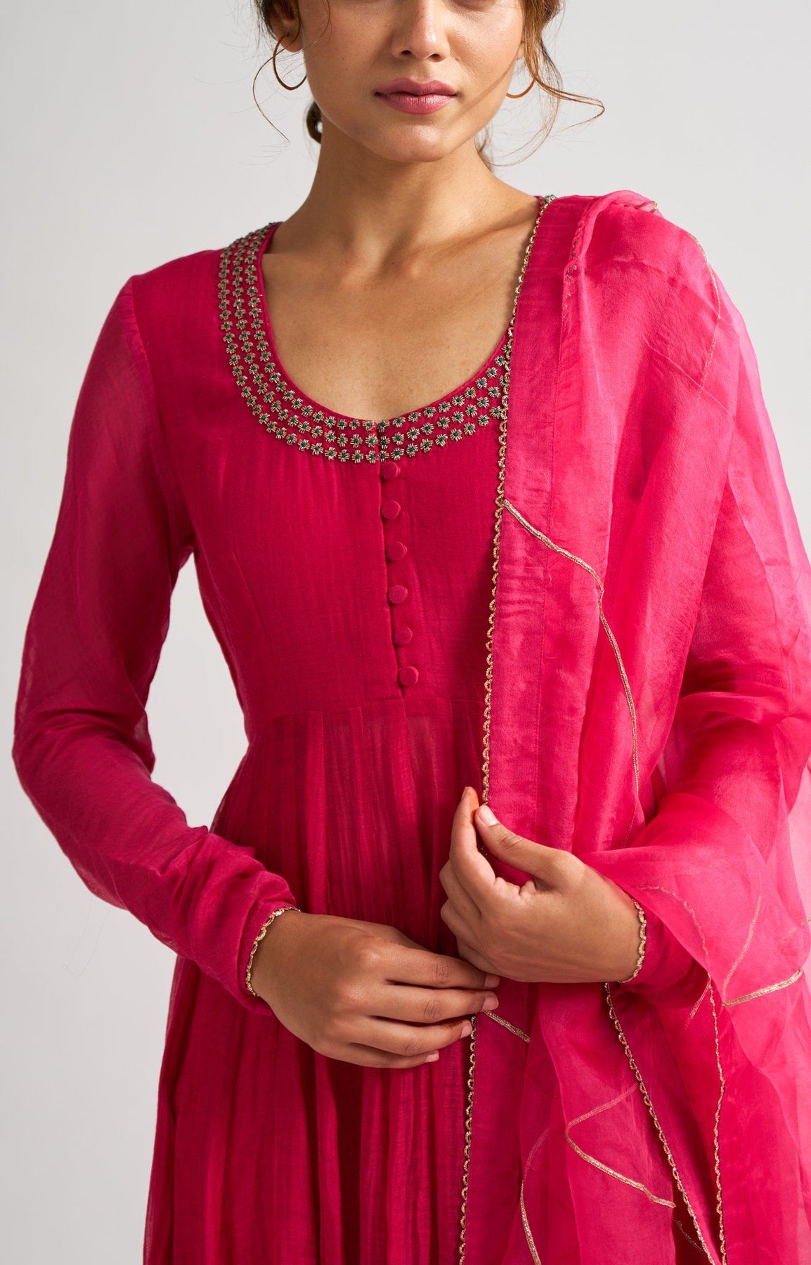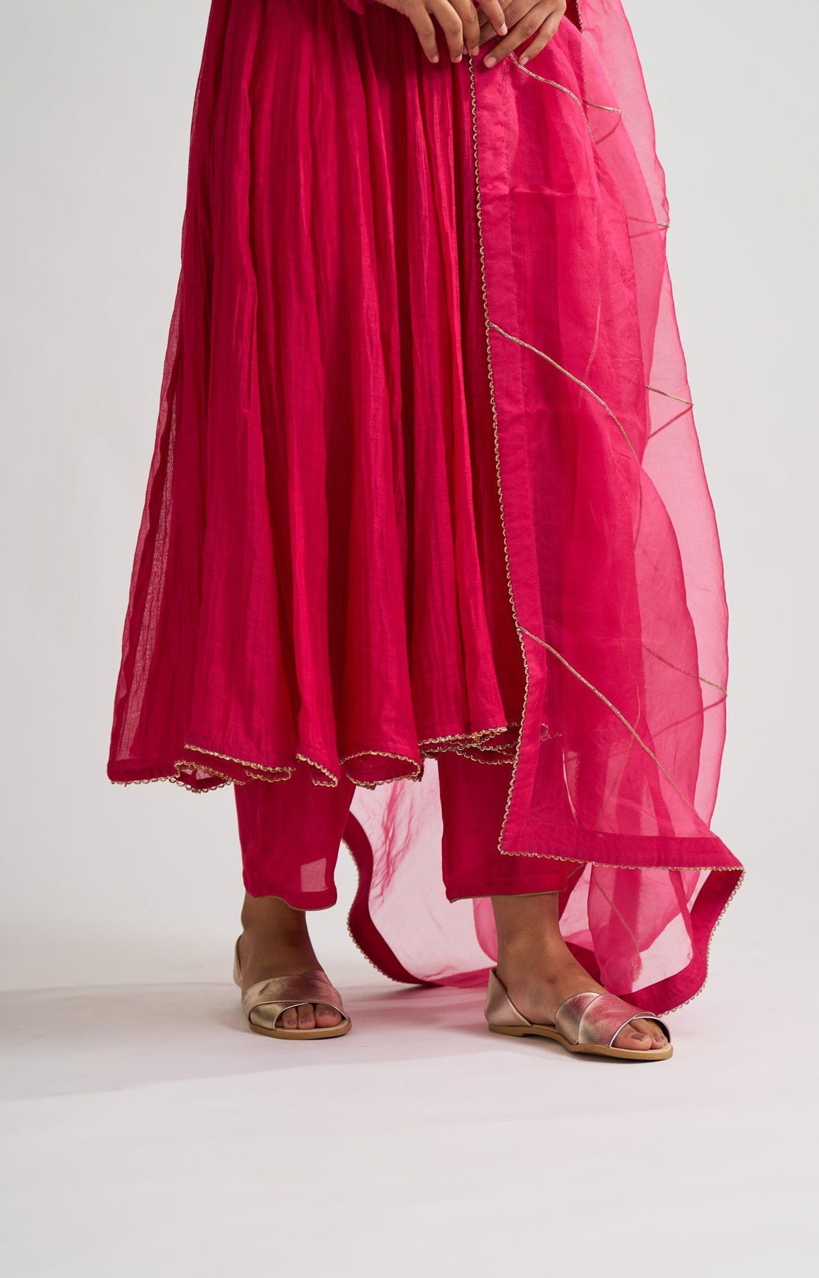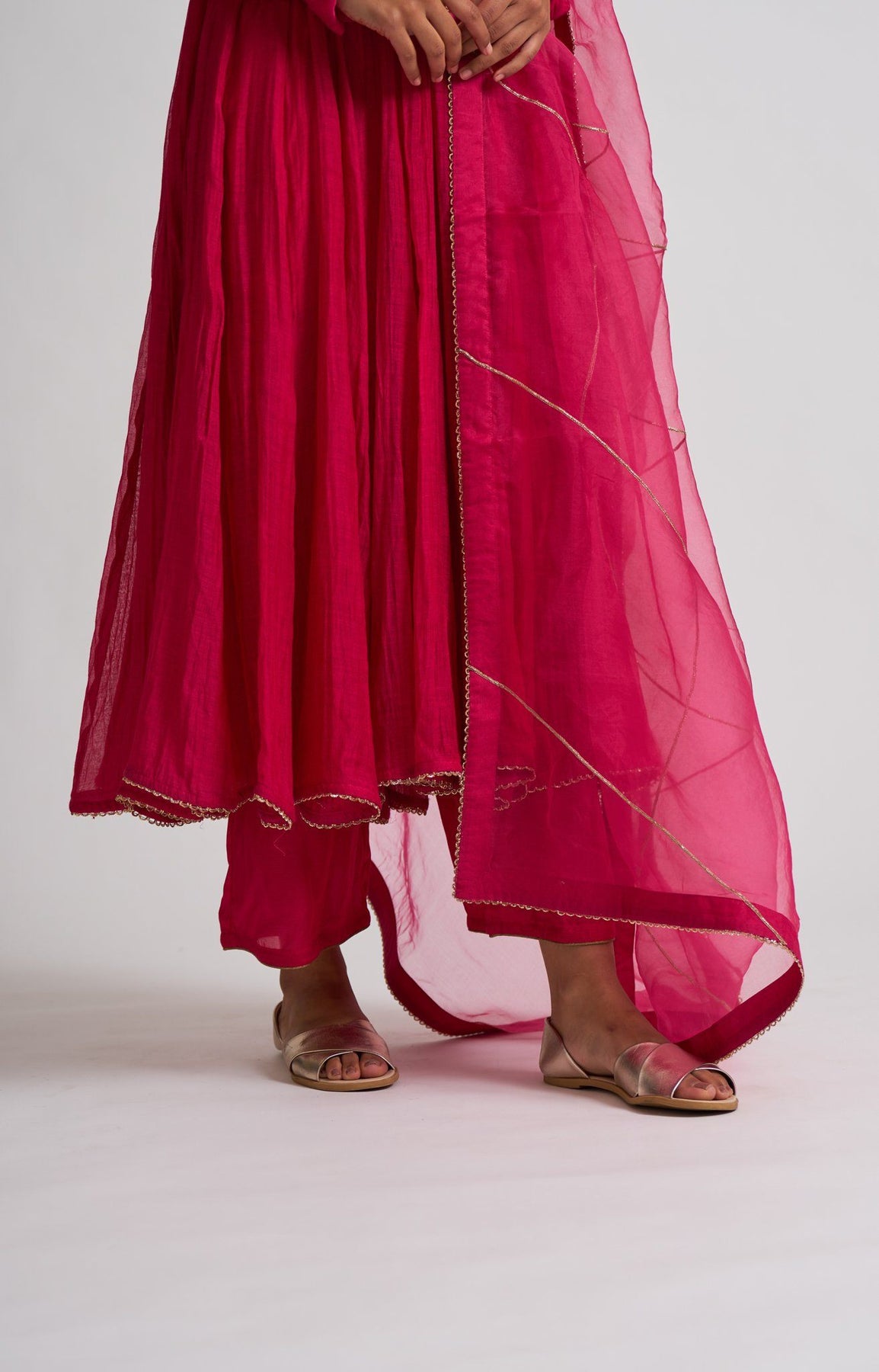Tracing a stylistic lineage to the Mughal court and its splendid bazaars, this Chanderi kurta carries grace in its luxurious gheras and myriad kalis , stitched keenly together paired with soft cotton silk pants. The organza dupatta adds a texture of gossamer, matching splendor with softness.