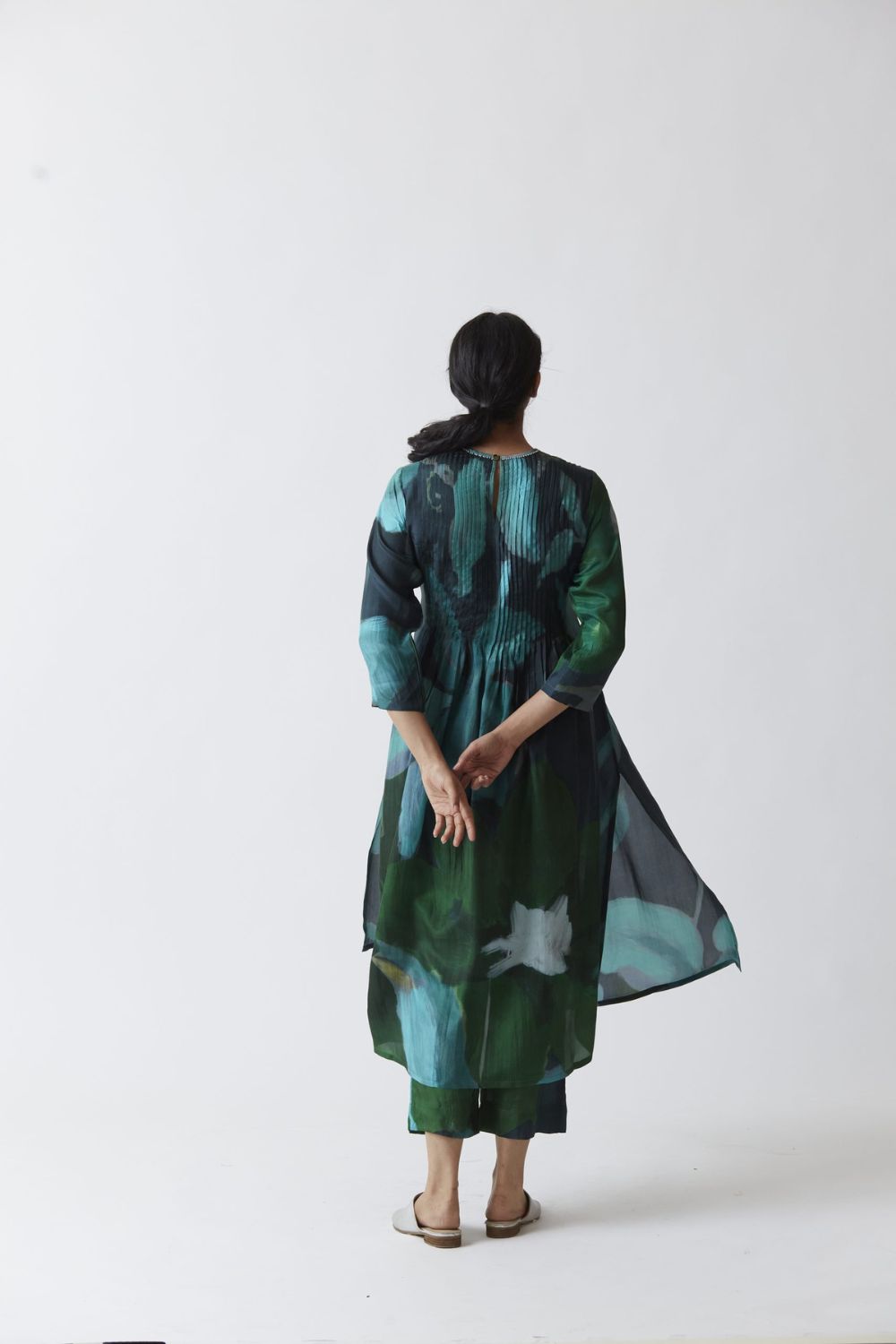 The set is crafted in the Jade print carefully printed on Pure silk featuring white pearls on the neck.