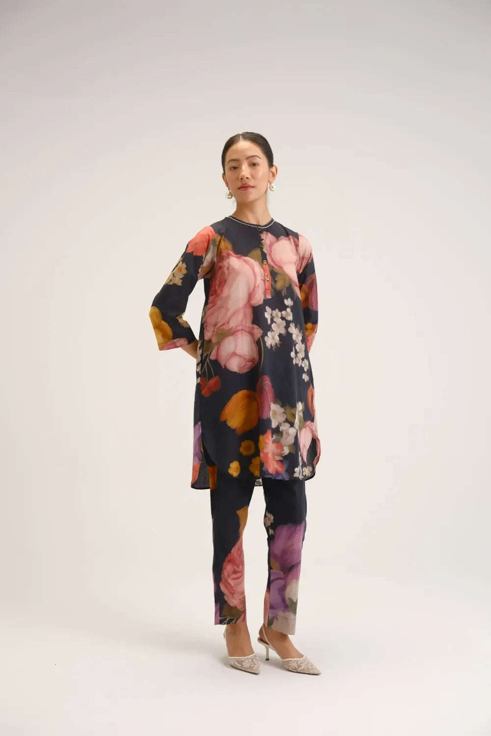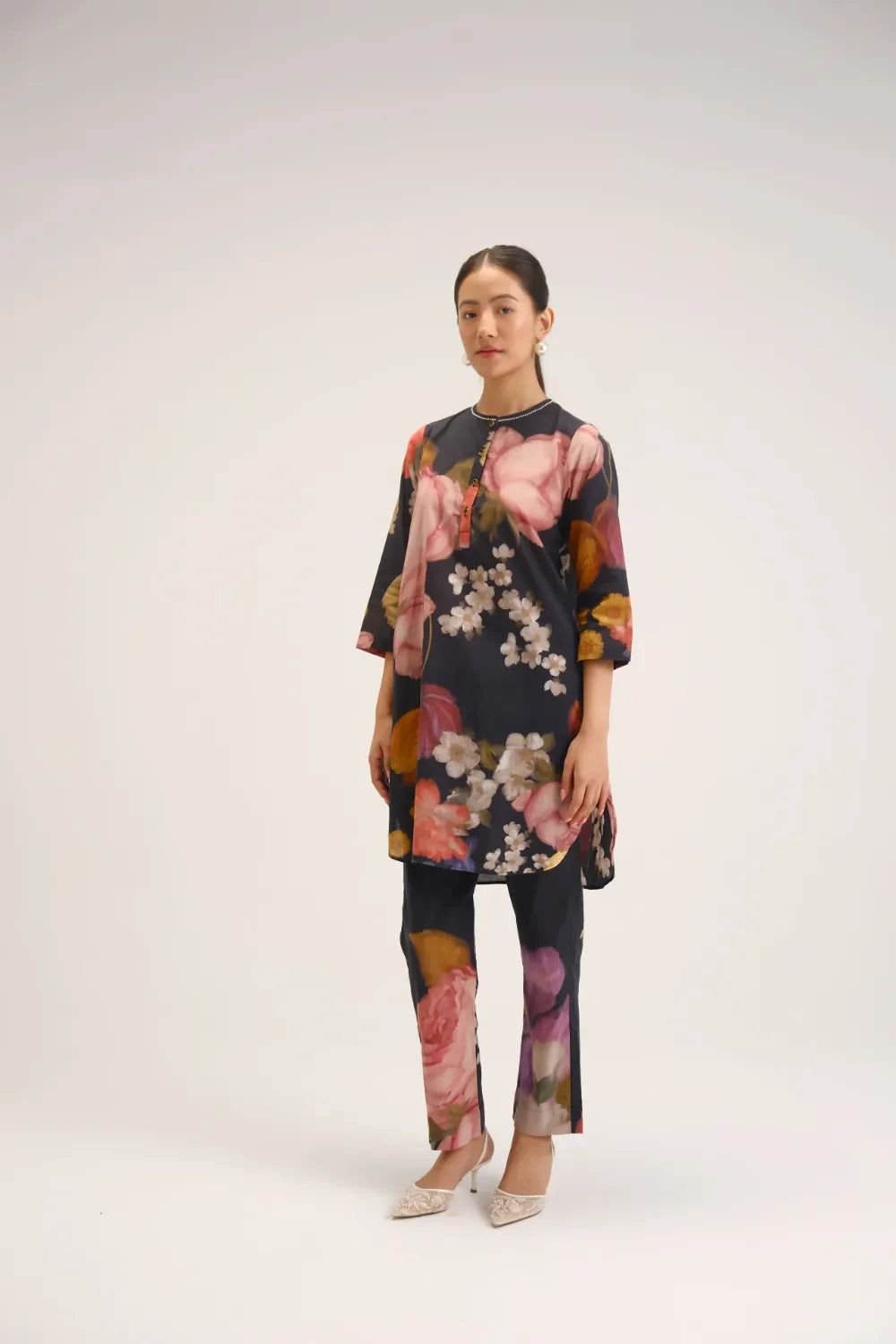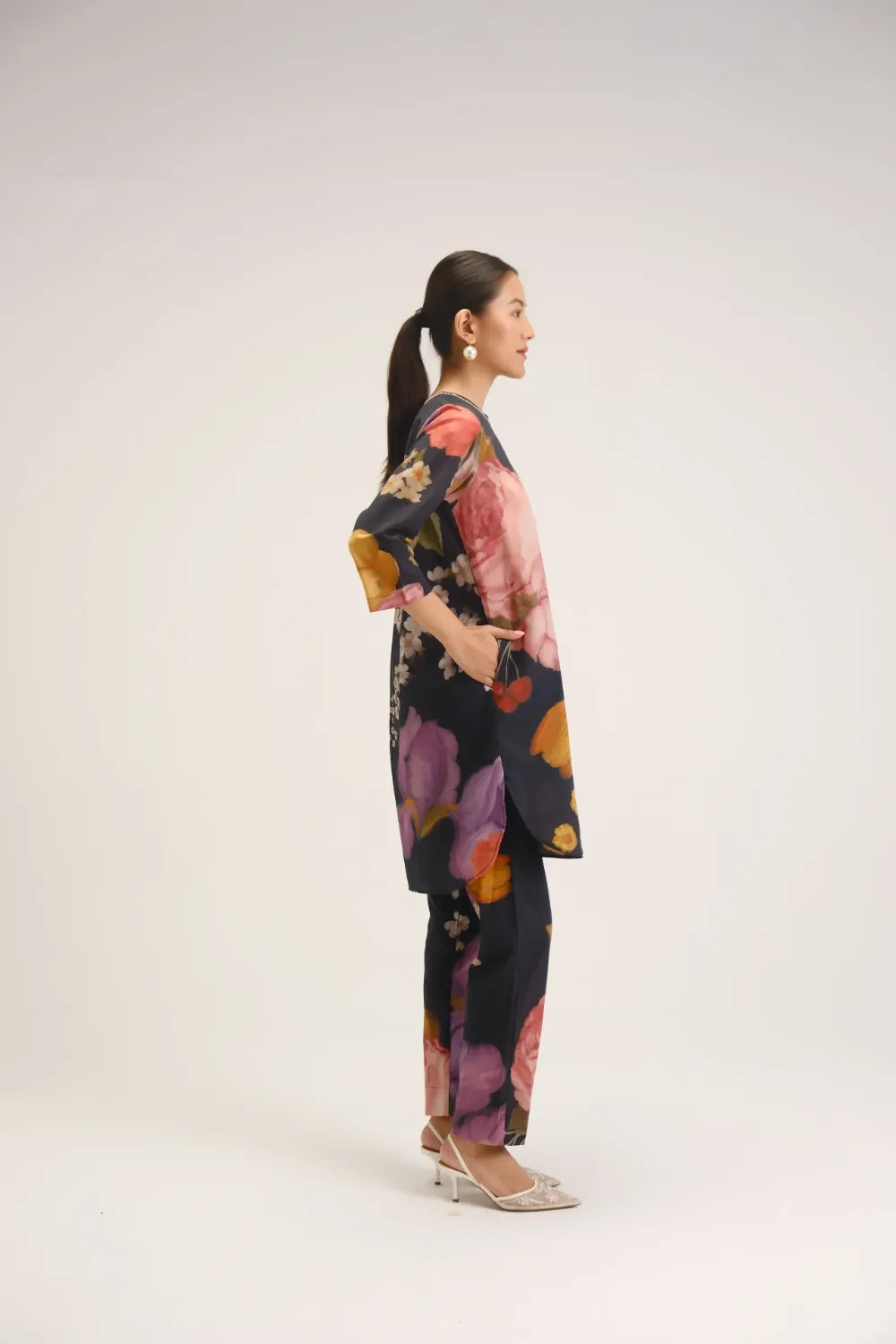 Elevate your everyday with the Kurta Set, a striking ensemble that marries dark elegance with floral vibrancy. Set against a deep charcoal base, the print bursts with oversized blossoms in shades of blush pink, ochre, ivory, and violet — creating a rich contrast reminiscent of oil paintings and classic botanical illustrations.