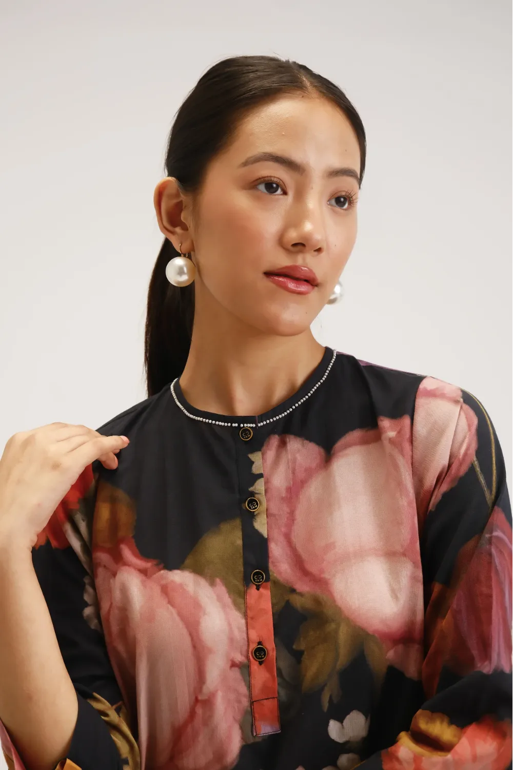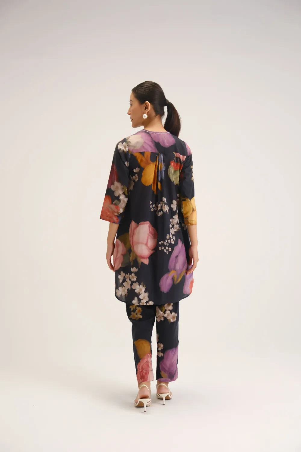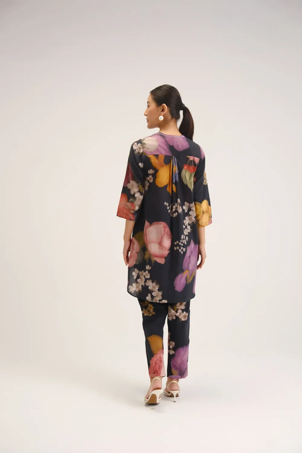 Elevate your everyday with the Kurta Set, a striking ensemble that marries dark elegance with floral vibrancy. Set against a deep charcoal base, the print bursts with oversized blossoms in shades of blush pink, ochre, ivory, and violet — creating a rich contrast reminiscent of oil paintings and classic botanical illustrations.