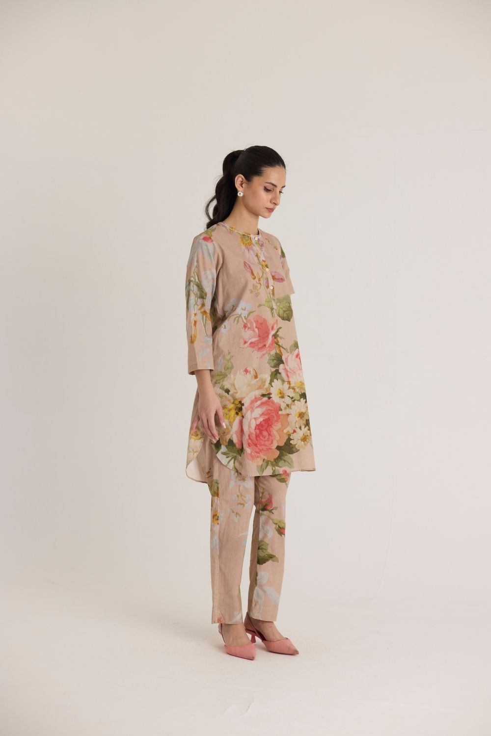 This sophisticated co-ord set features a soft beige base adorned with delicate hand-painted floral prints in hues of pink, green, and ivory. The relaxed-fit kurta with a buttoned neckline and 3/4th sleeves offers understated elegance, while the straight-cut trousers complement the design seamlessly. Crafted from breathable fabric, this ensemble is perfect for effortless daytime chic or a refined evening look.