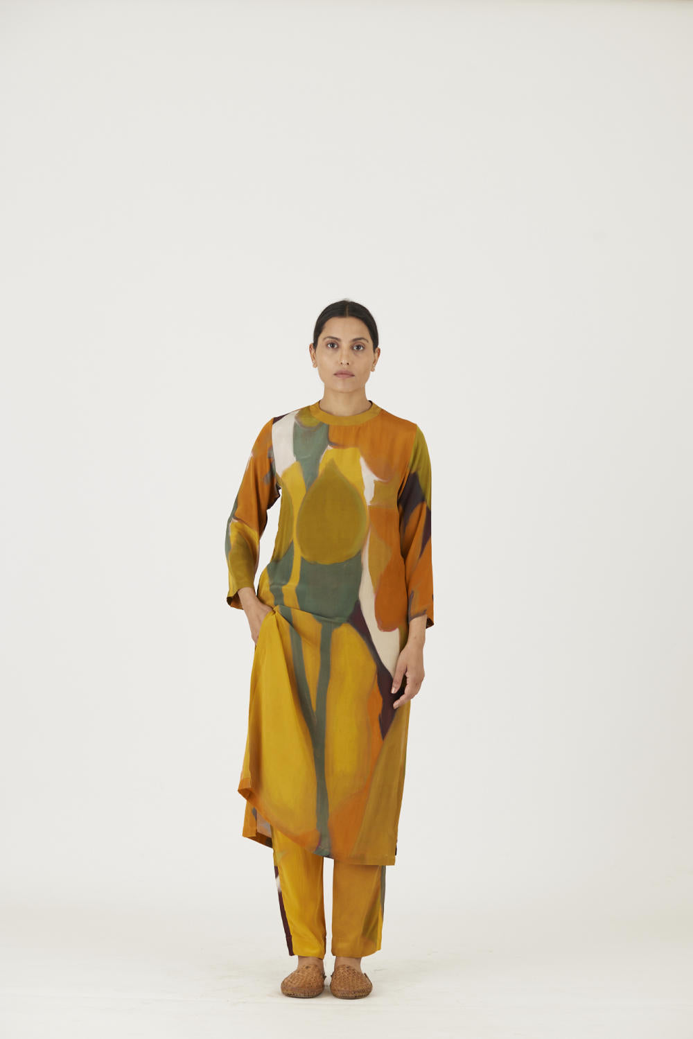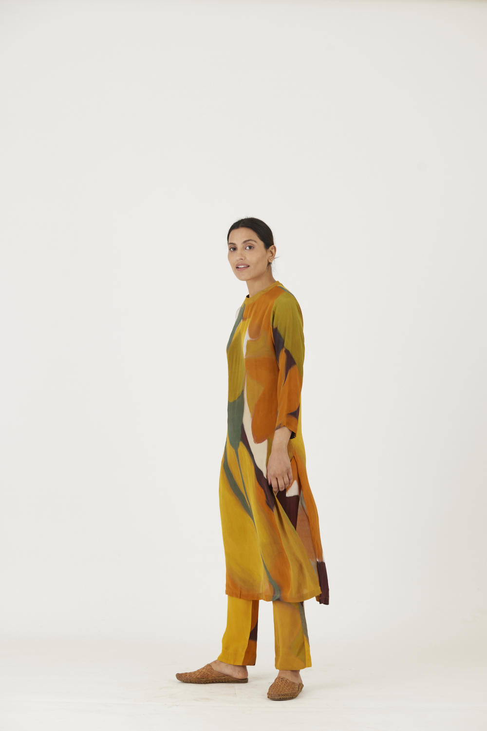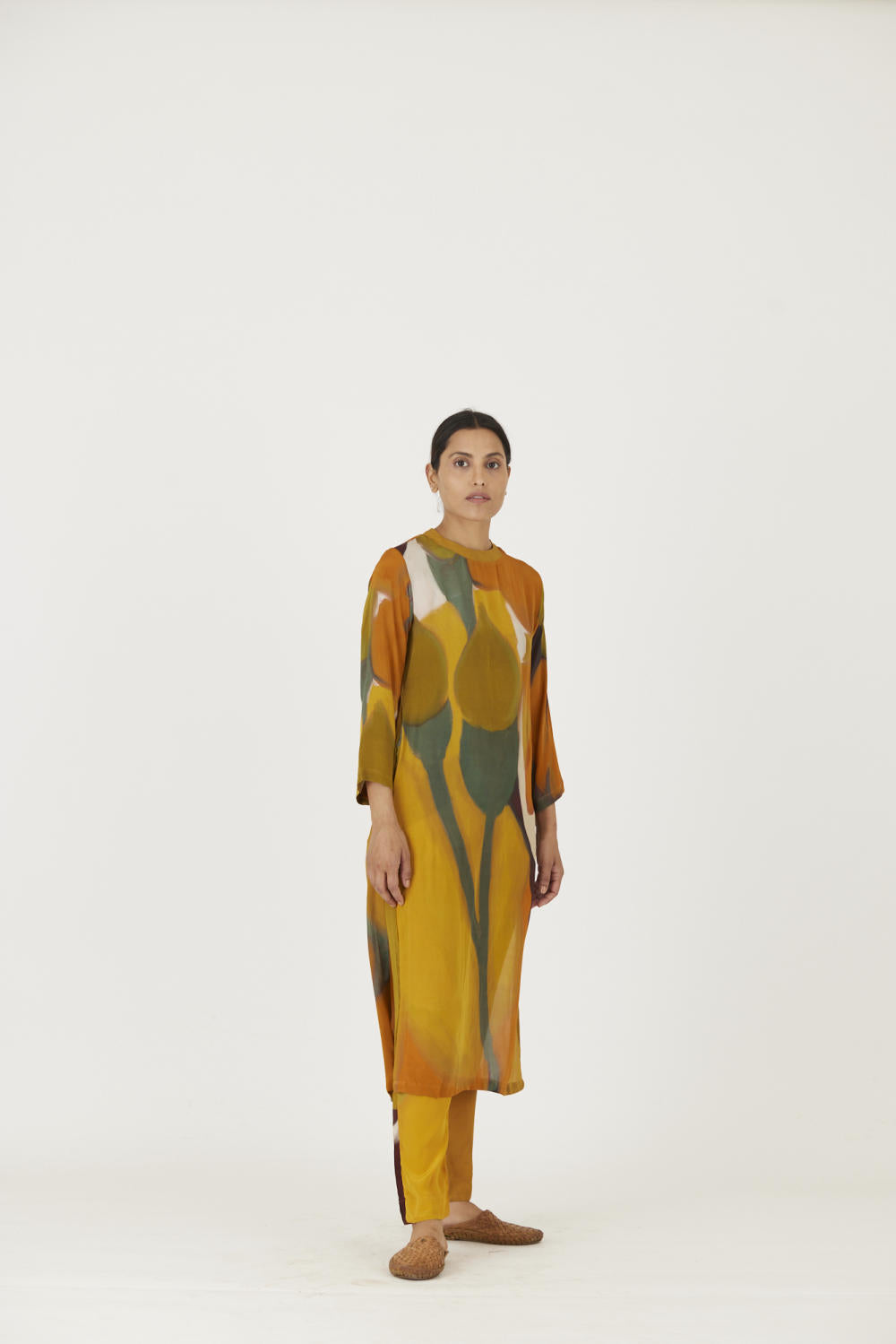 The print is inspired by a rosebud and features a bouquet of flowers and buds in a unique arrangement. The kurta features a 1" patti on the neckline and high slits . The kurta is crafted in crepe and comes with complimenting pants.