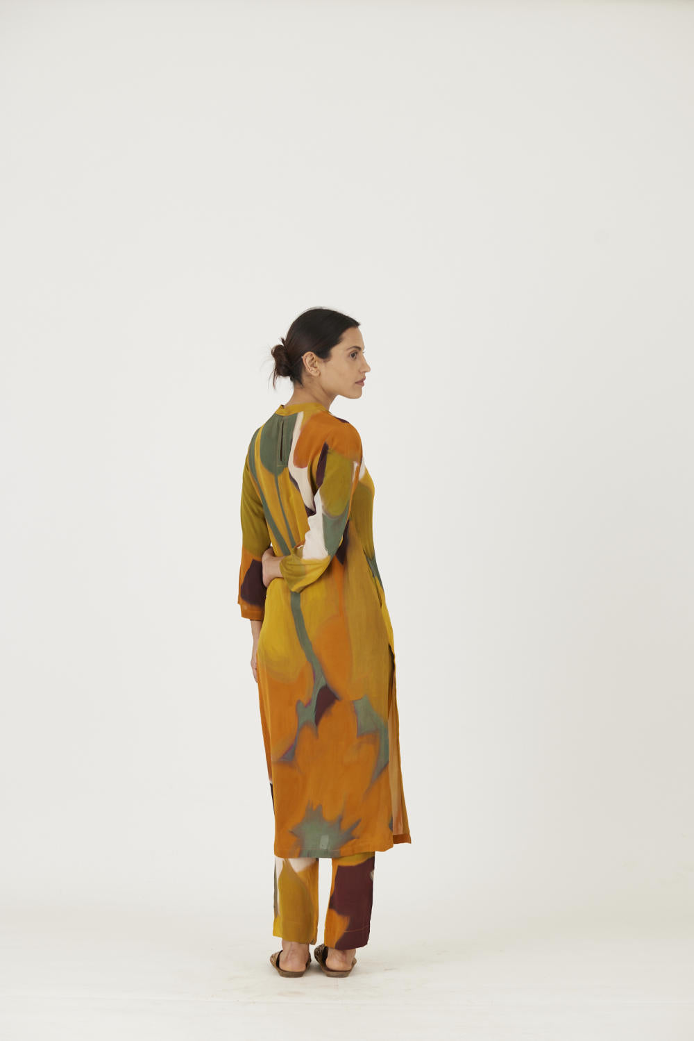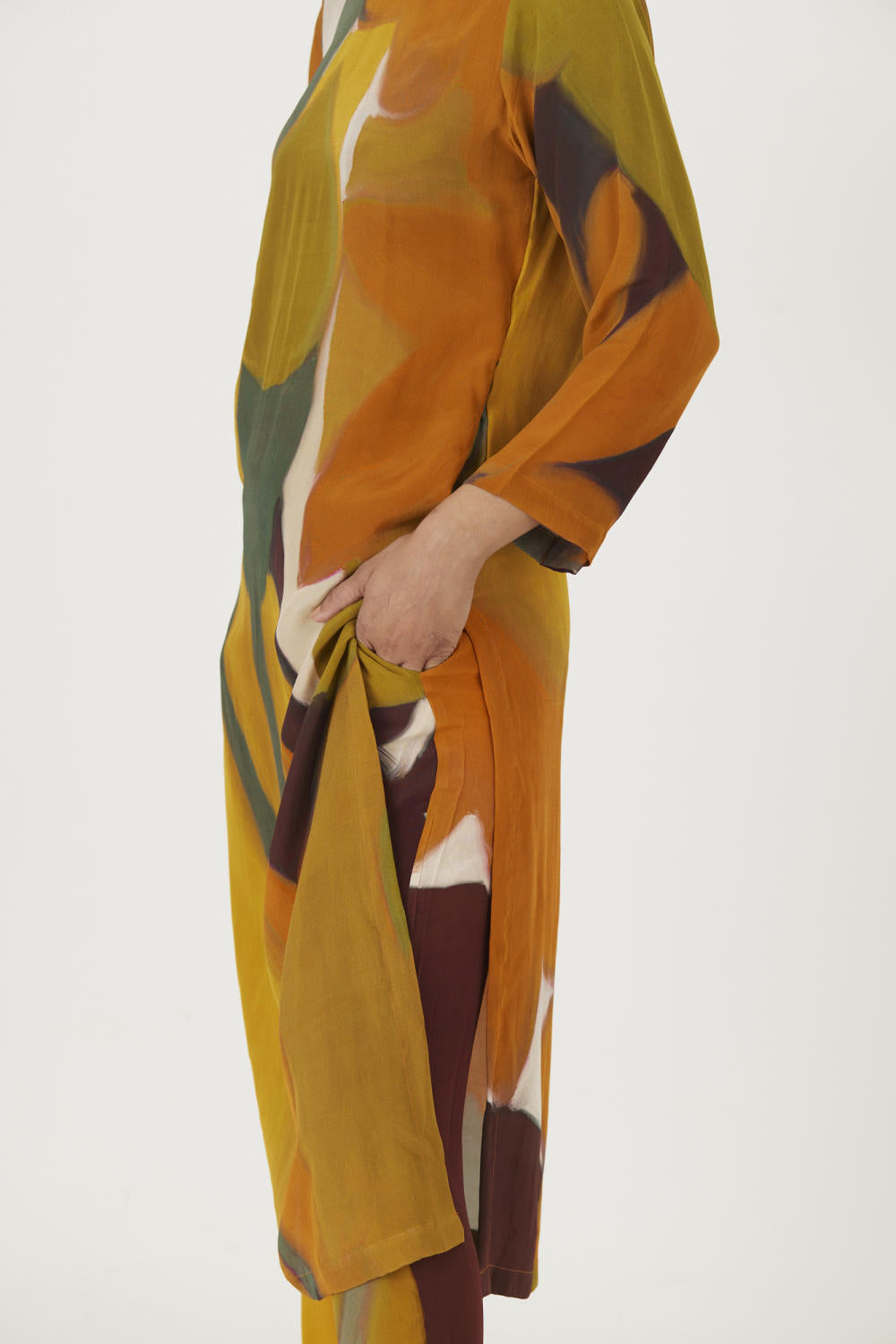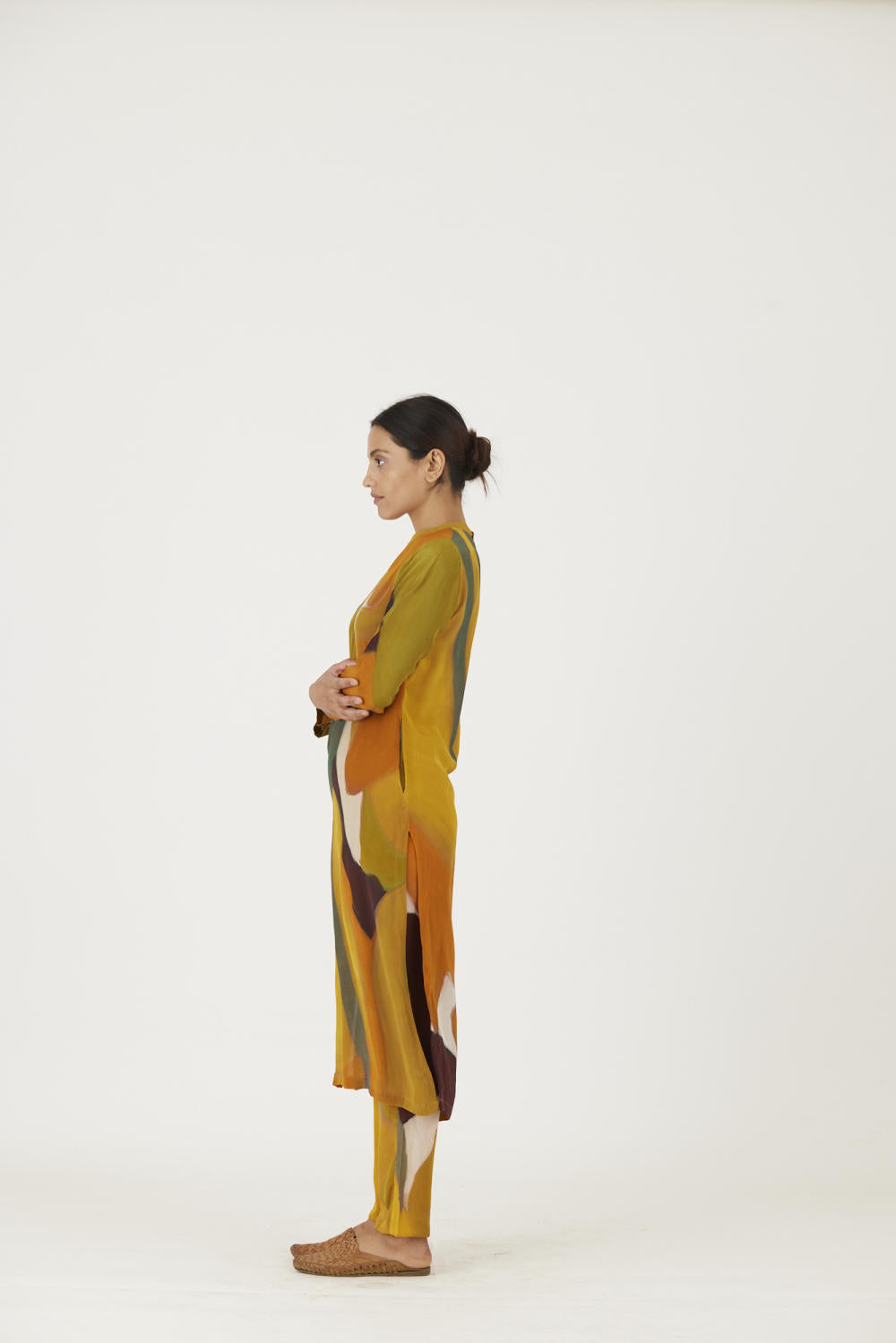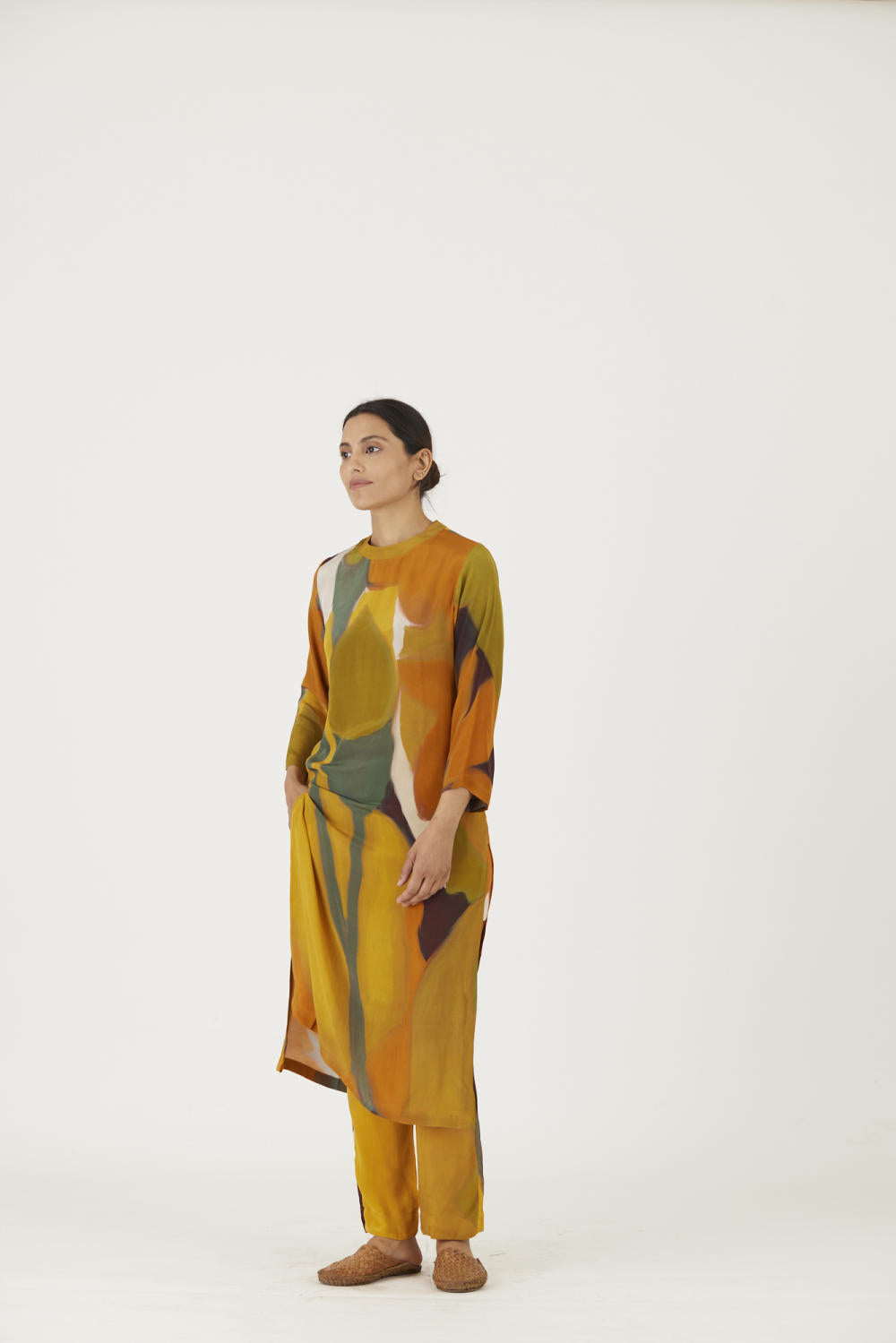 The print is inspired by a rosebud and features a bouquet of flowers and buds in a unique arrangement. The kurta features a 1" patti on the neckline and high slits . The kurta is crafted in crepe and comes with complimenting pants.