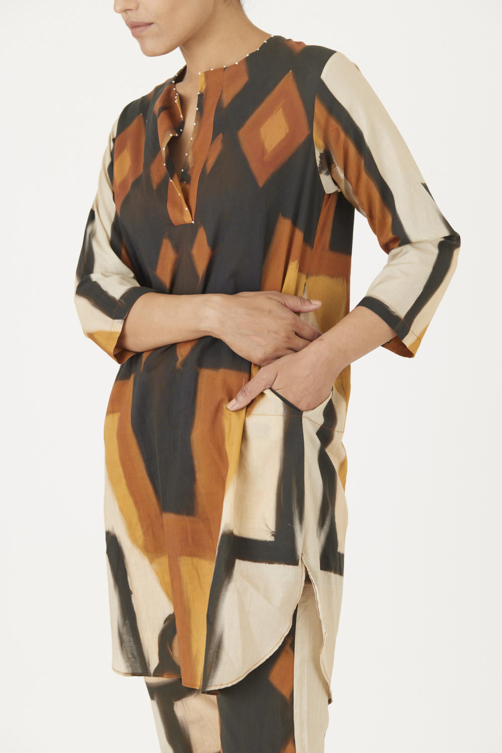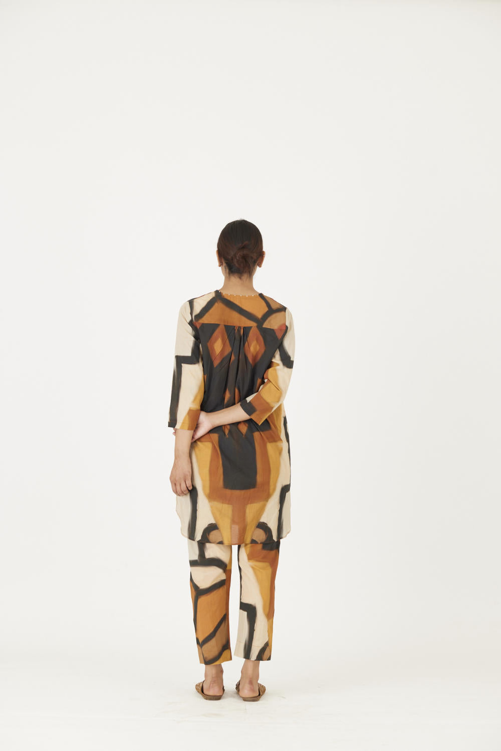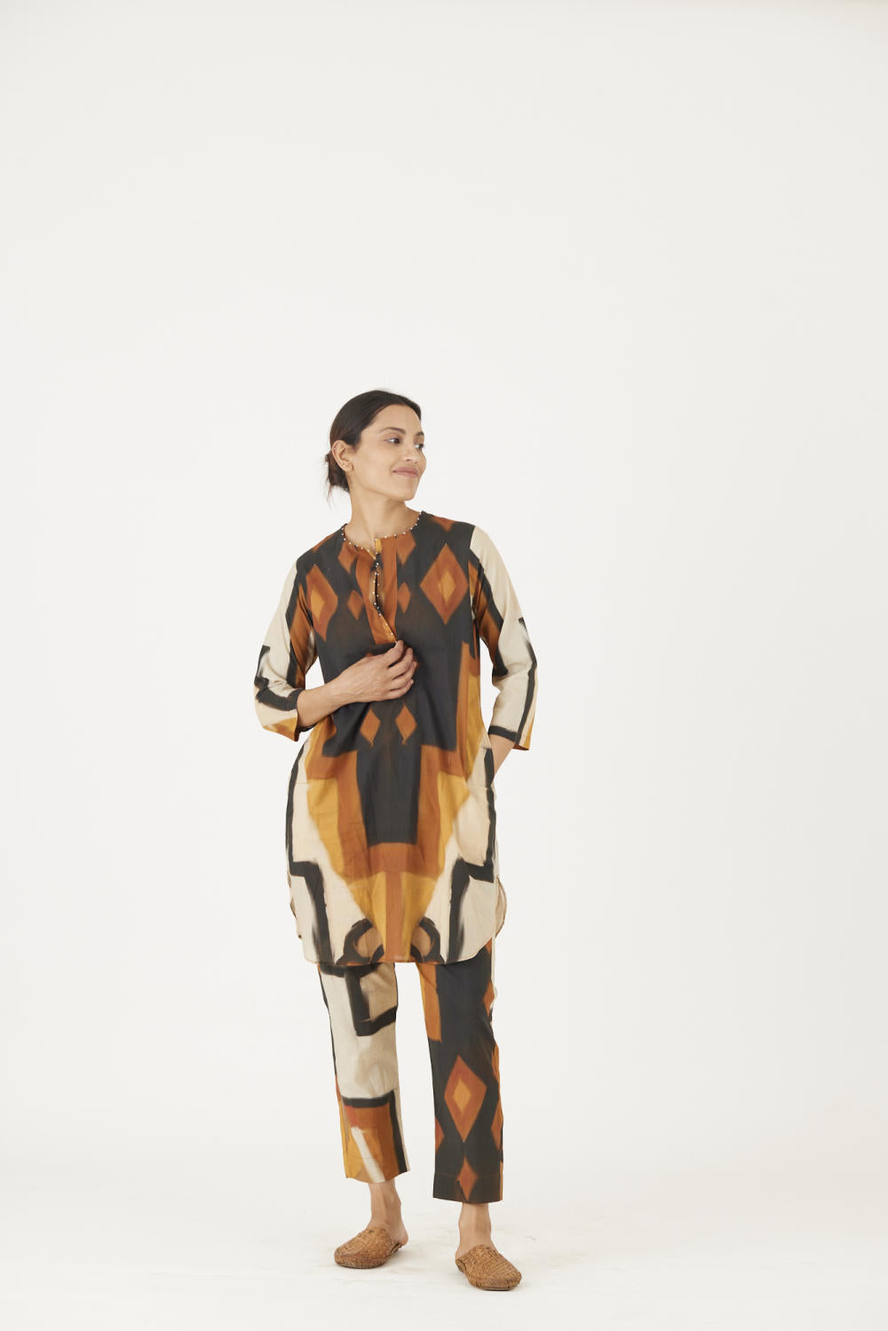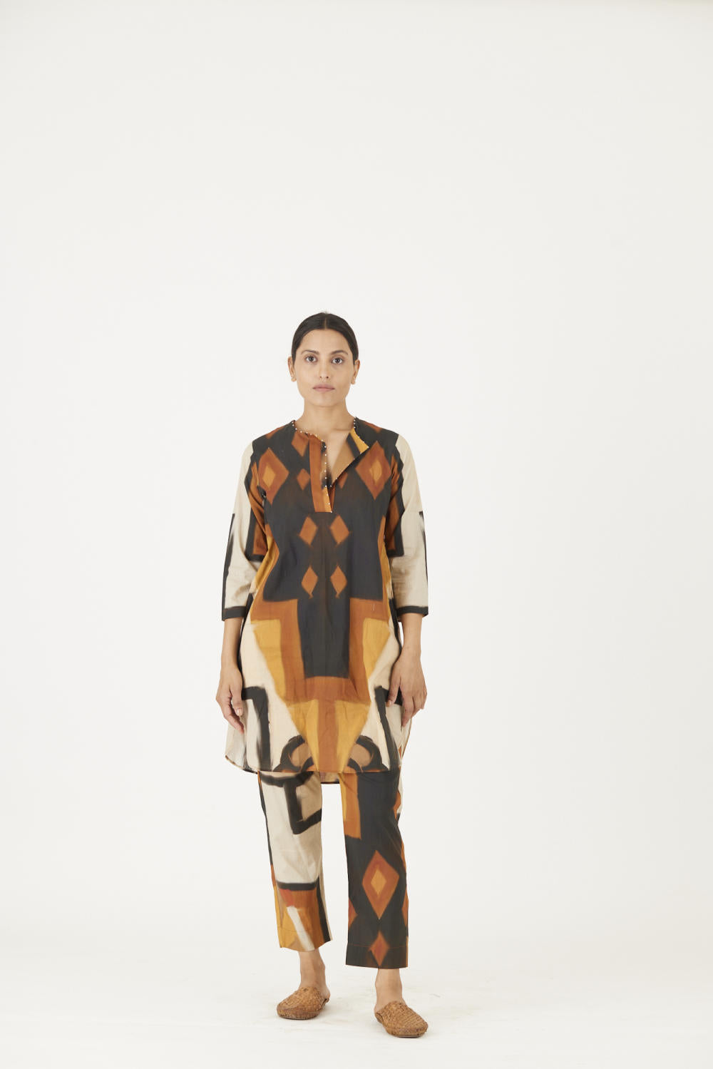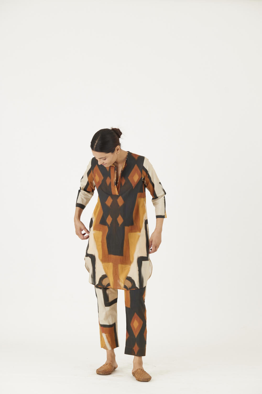 The print is inspired from the ancient rugs of Egypt and features a unique placement of florals and geomentric motifs . The set includes a short kurta with side slits and 2" kurta patti . It comes with complimenting pants.