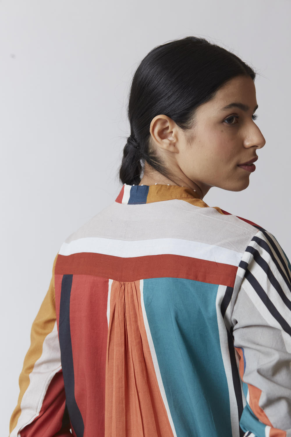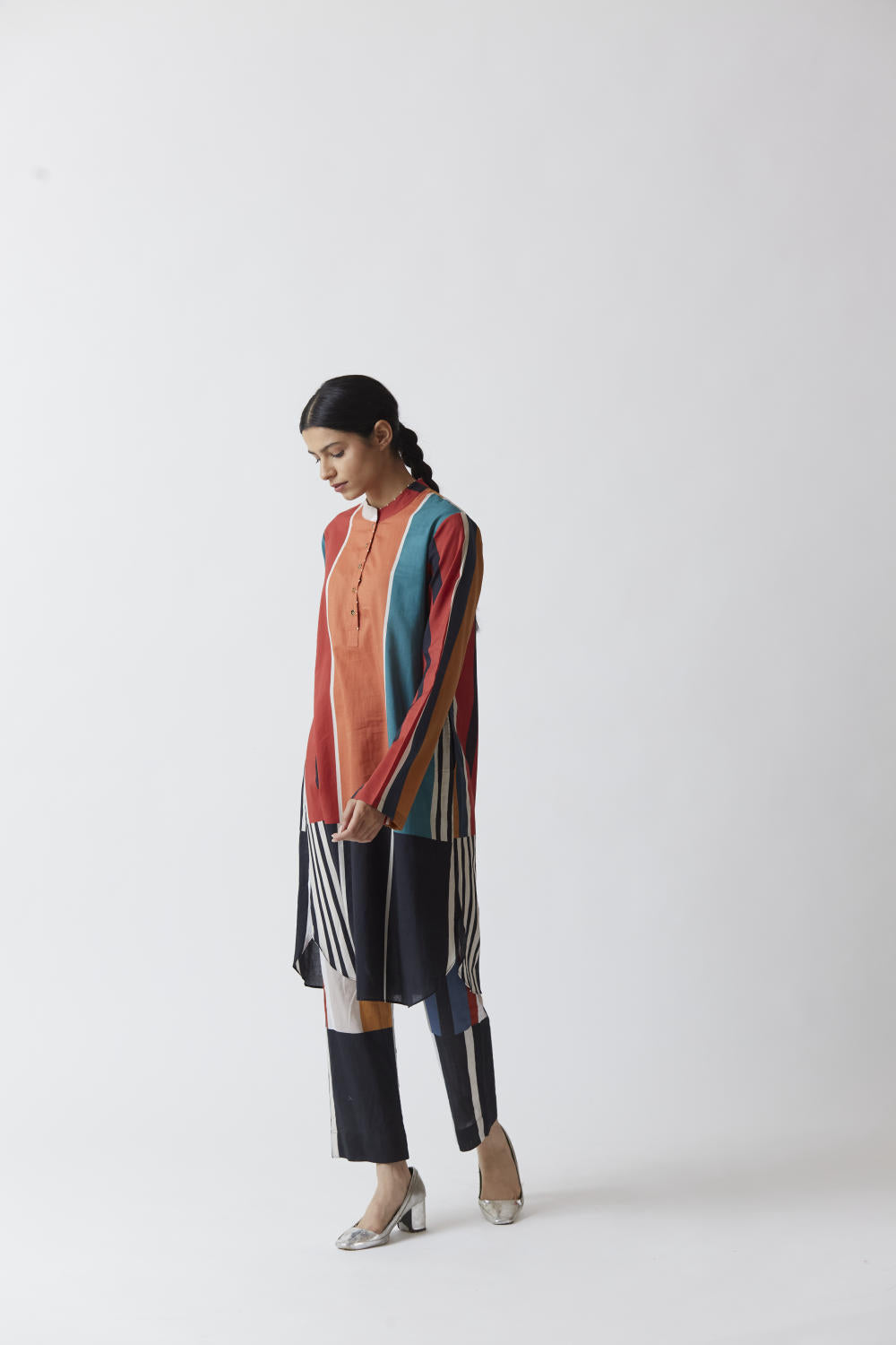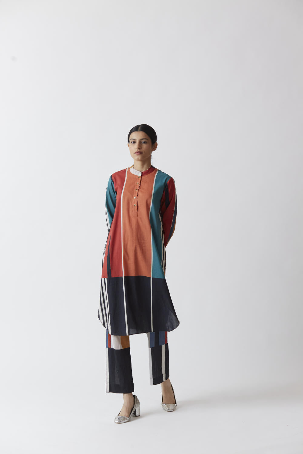 Cotton printed kurta in bold stripes with straight full sleeves. It is