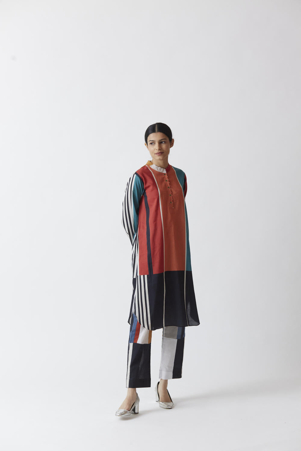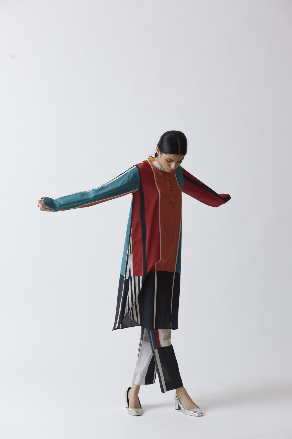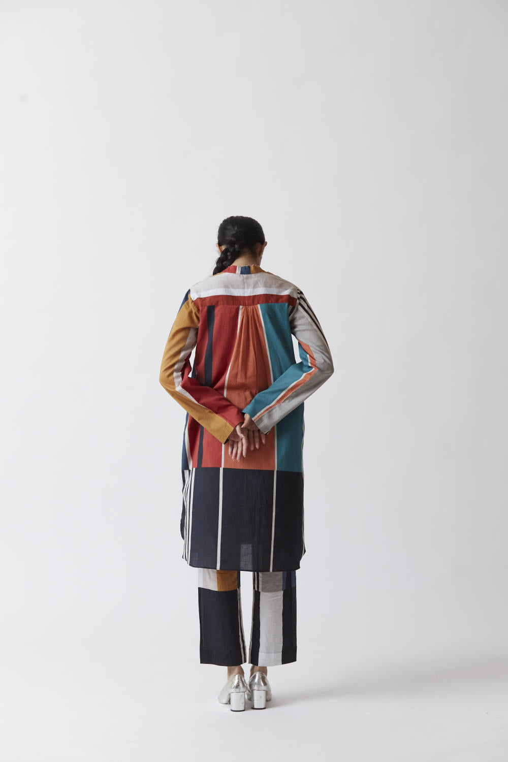 Cotton printed kurta in bold stripes with straight full sleeves. It is
