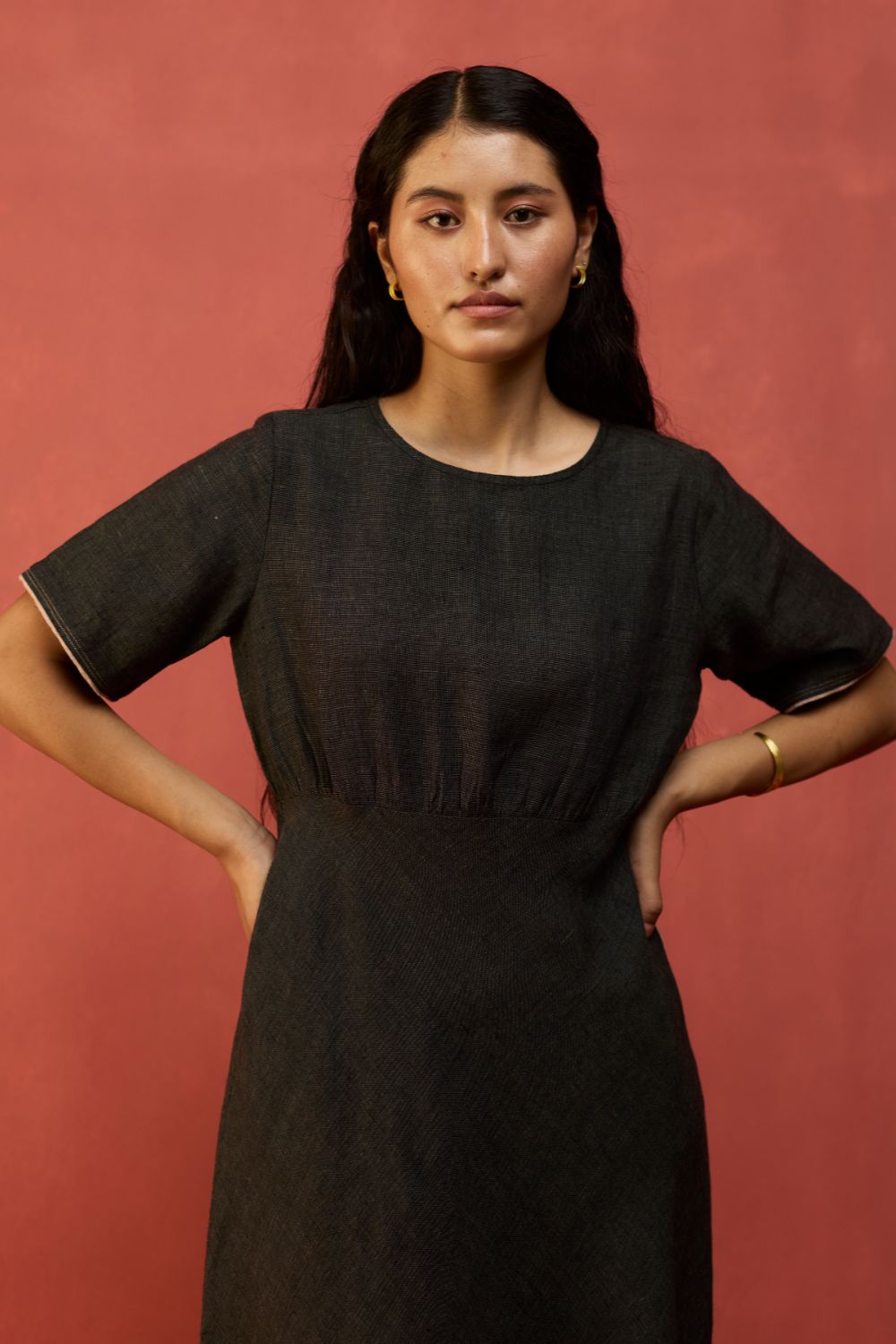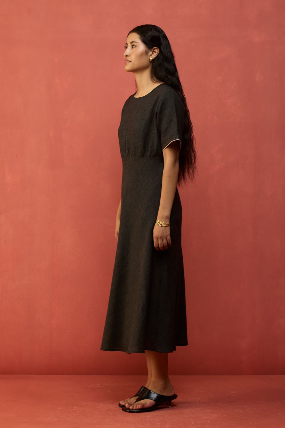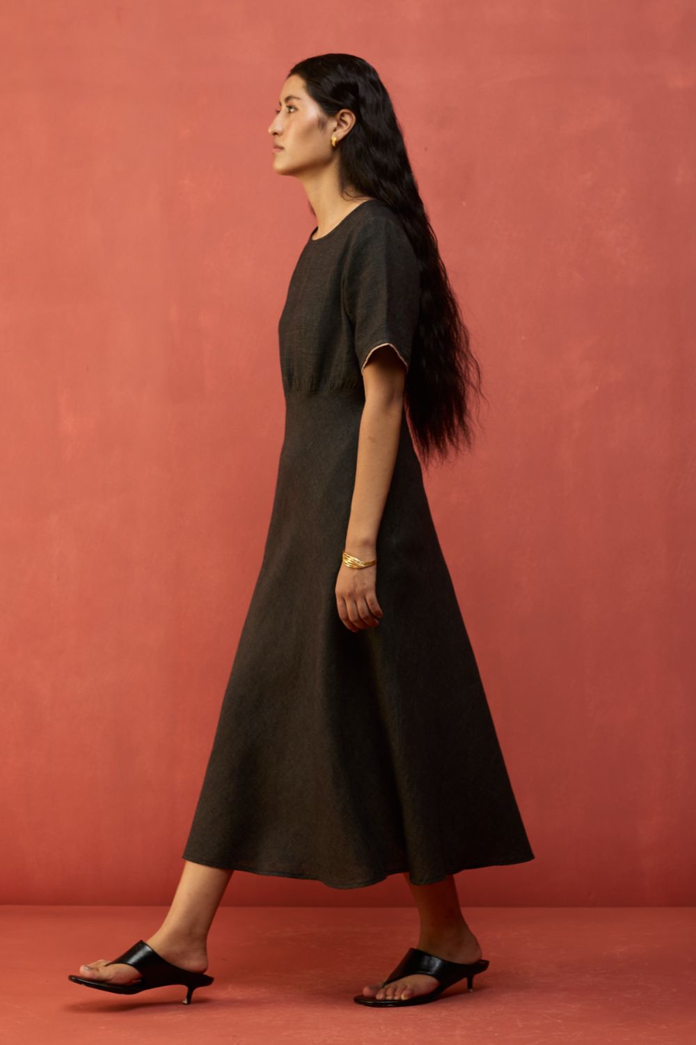 The Fumi is a fit-and-flare dress handcrafted from our signature soft pinstriped yarn-dyed linen. Cut on the bias with a shaped waist, it drapes beautifully to enhance the silhouette. Intricate contrast linen piping details with pop-coloured top-stitch lines are added along the sleeves and pockets. Thoughtfully designed with a side zipper, elbow-length sleeves and deep pockets for ease and wearability. Fumi is the perfect dress to transition from formal events to informal get-togethers.