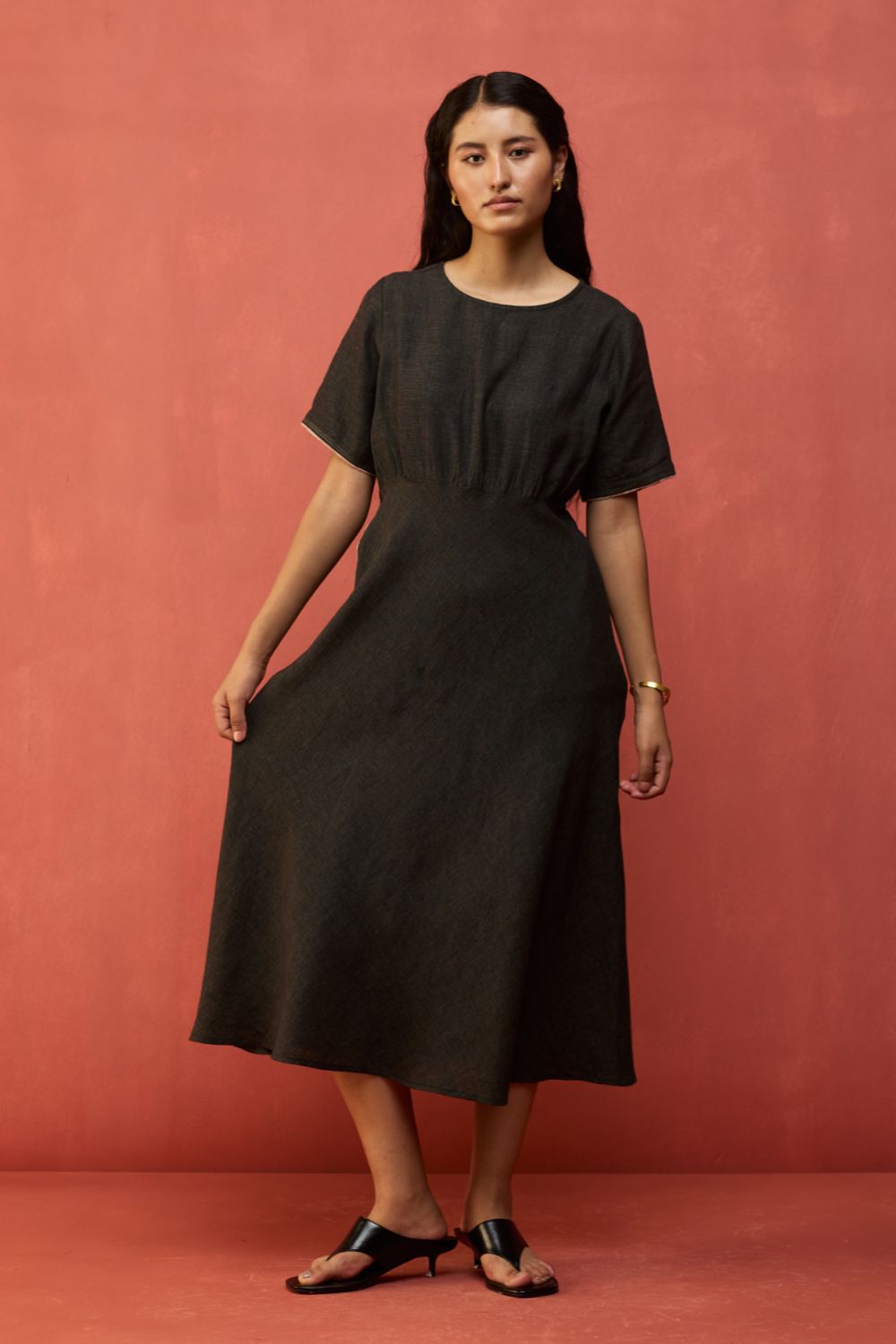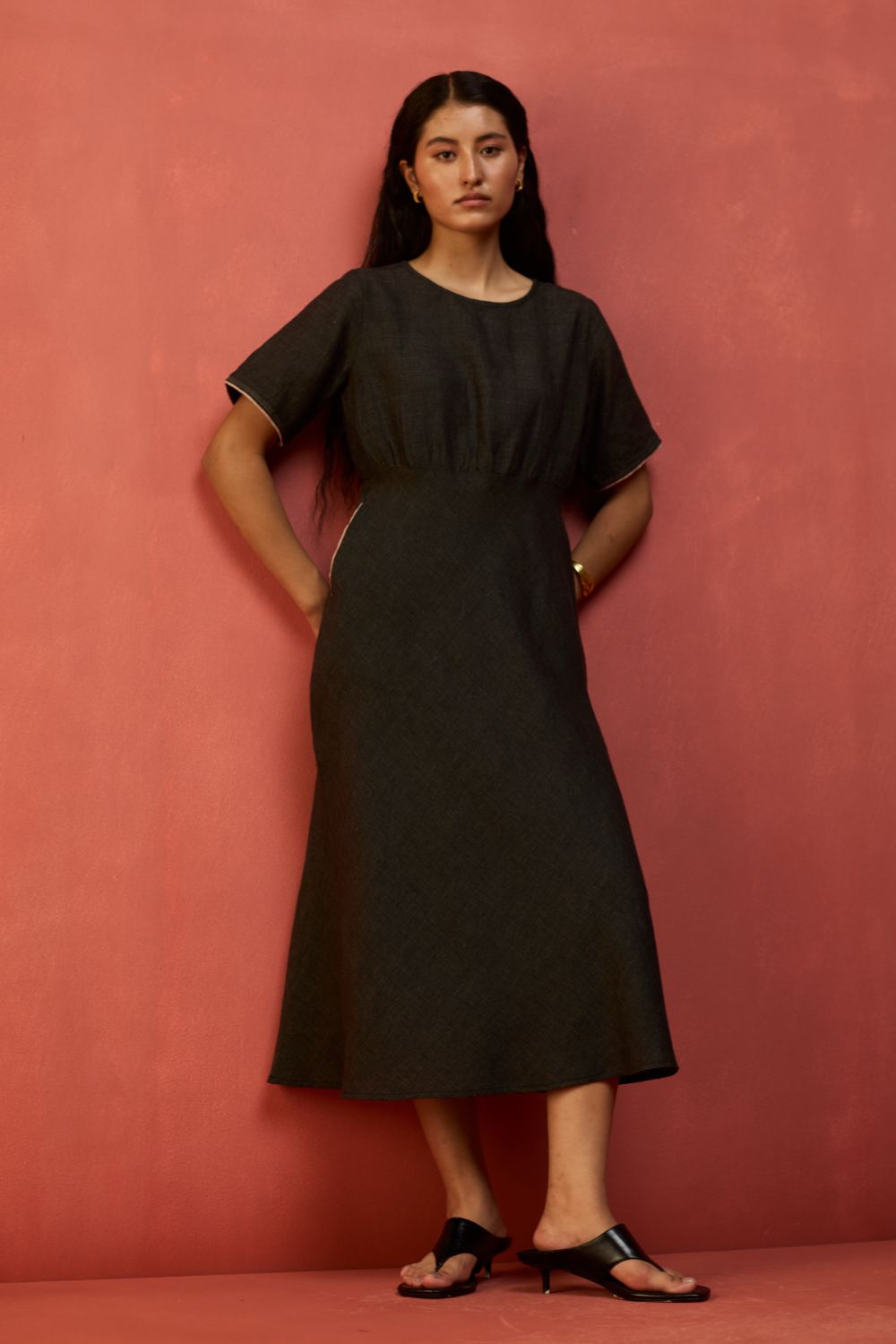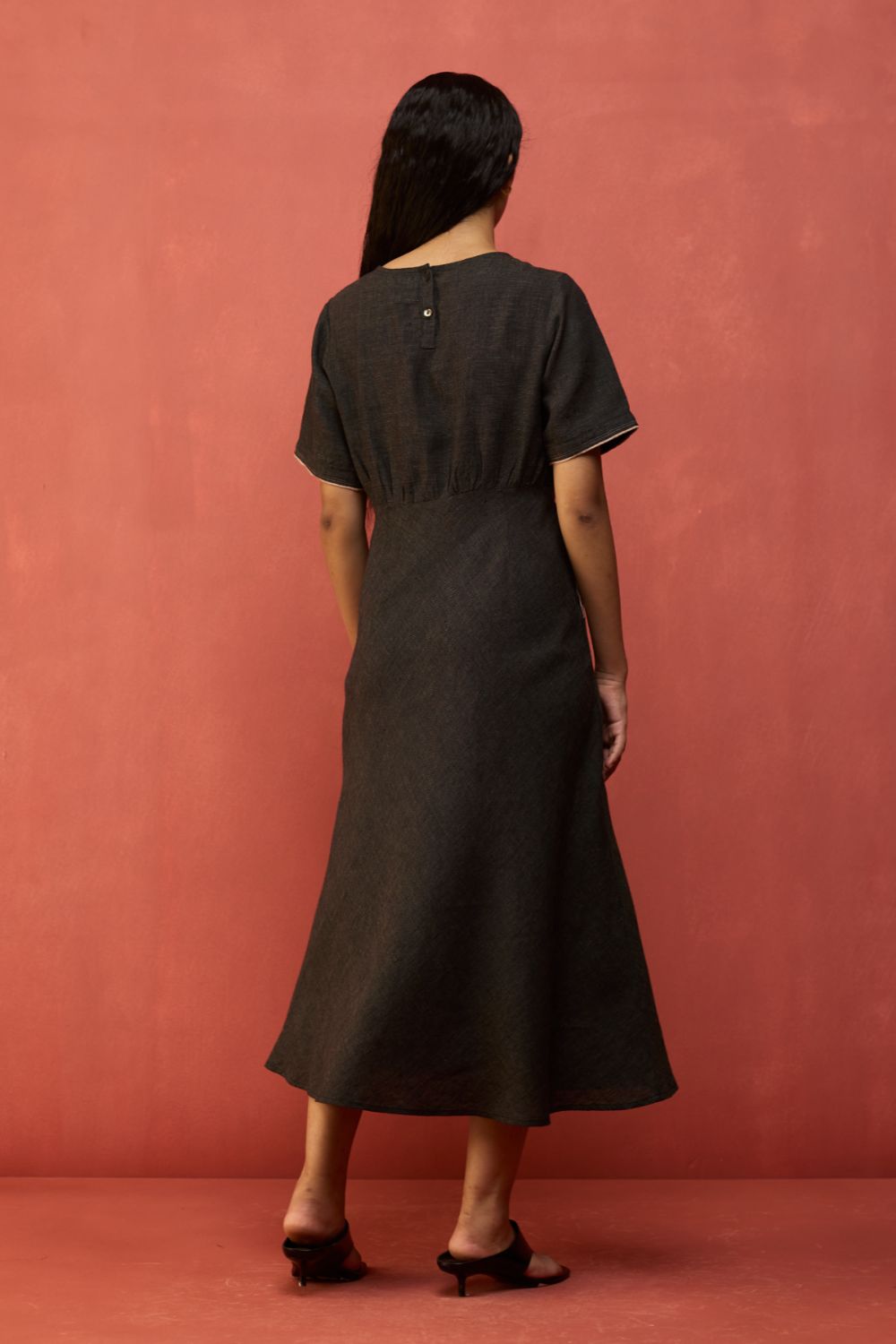 The Fumi is a fit-and-flare dress handcrafted from our signature soft pinstriped yarn-dyed linen. Cut on the bias with a shaped waist, it drapes beautifully to enhance the silhouette. Intricate contrast linen piping details with pop-coloured top-stitch lines are added along the sleeves and pockets. Thoughtfully designed with a side zipper, elbow-length sleeves and deep pockets for ease and wearability. Fumi is the perfect dress to transition from formal events to informal get-togethers.