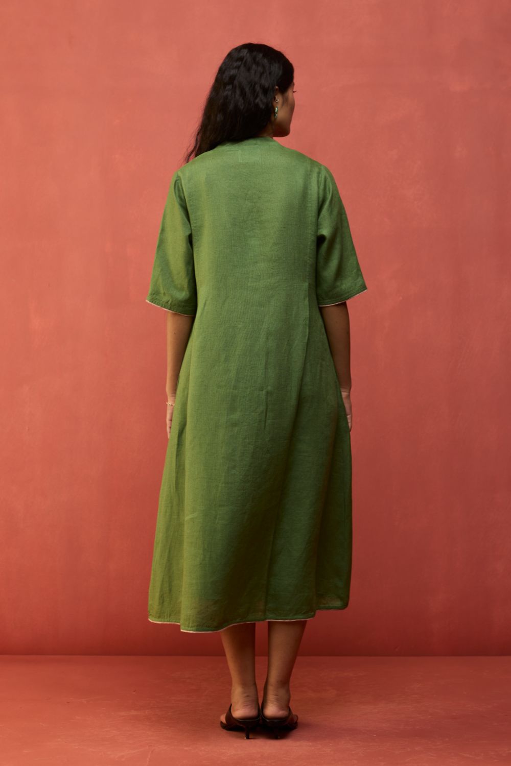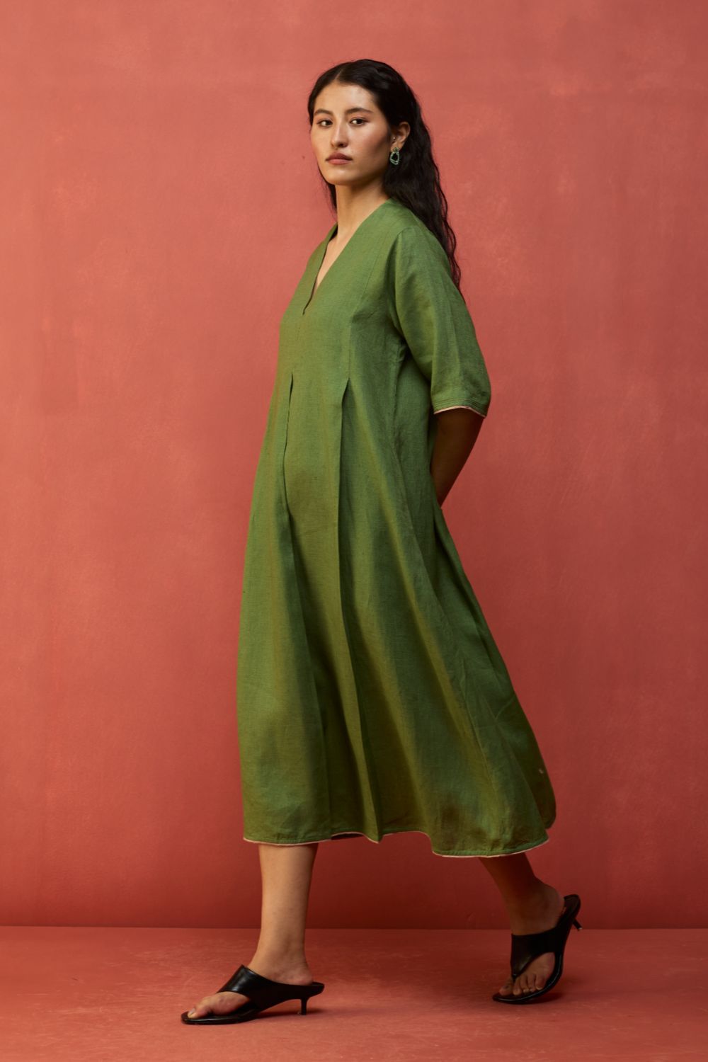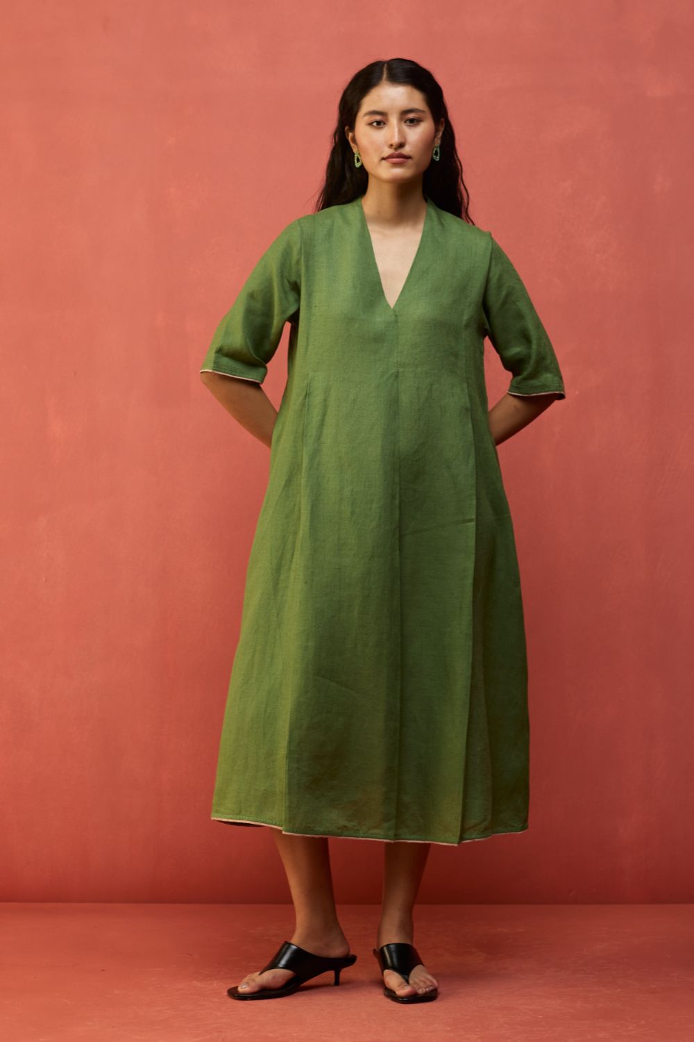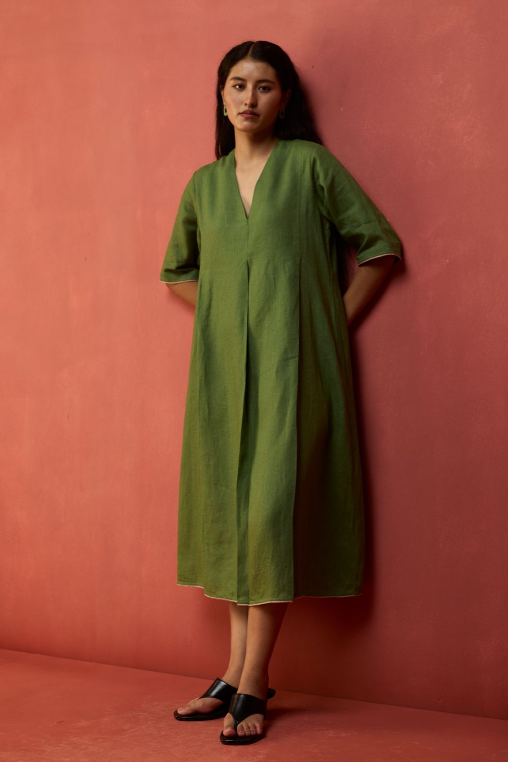 A v-neck, ankle-length, A-line dress with knife pleats at the front and back. Maki is crafted in our soft signature yarn-dyed linen with intricate contrast linen edging on the hemline and sleeves finished with intricate top-stitch detailing. Designed with comfortable pockets, the Maki is an easy silhouette to dress up or down depending on the occasion. Easily one of our most versatile dresses.