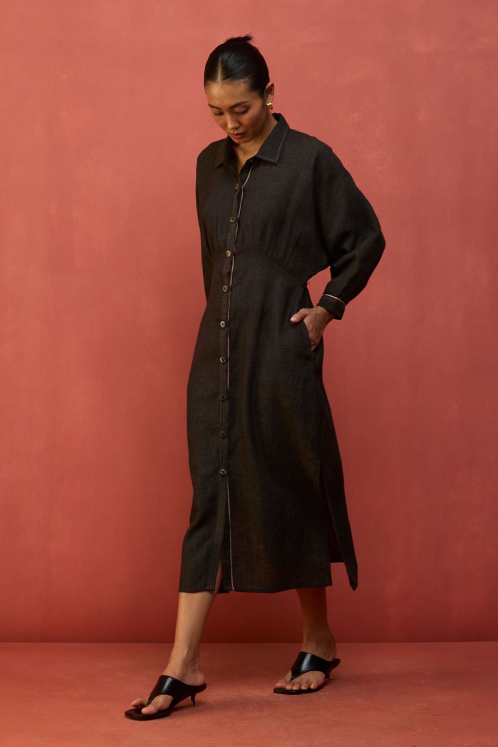 Masaru Buttoned Linen Dress - Charcoal