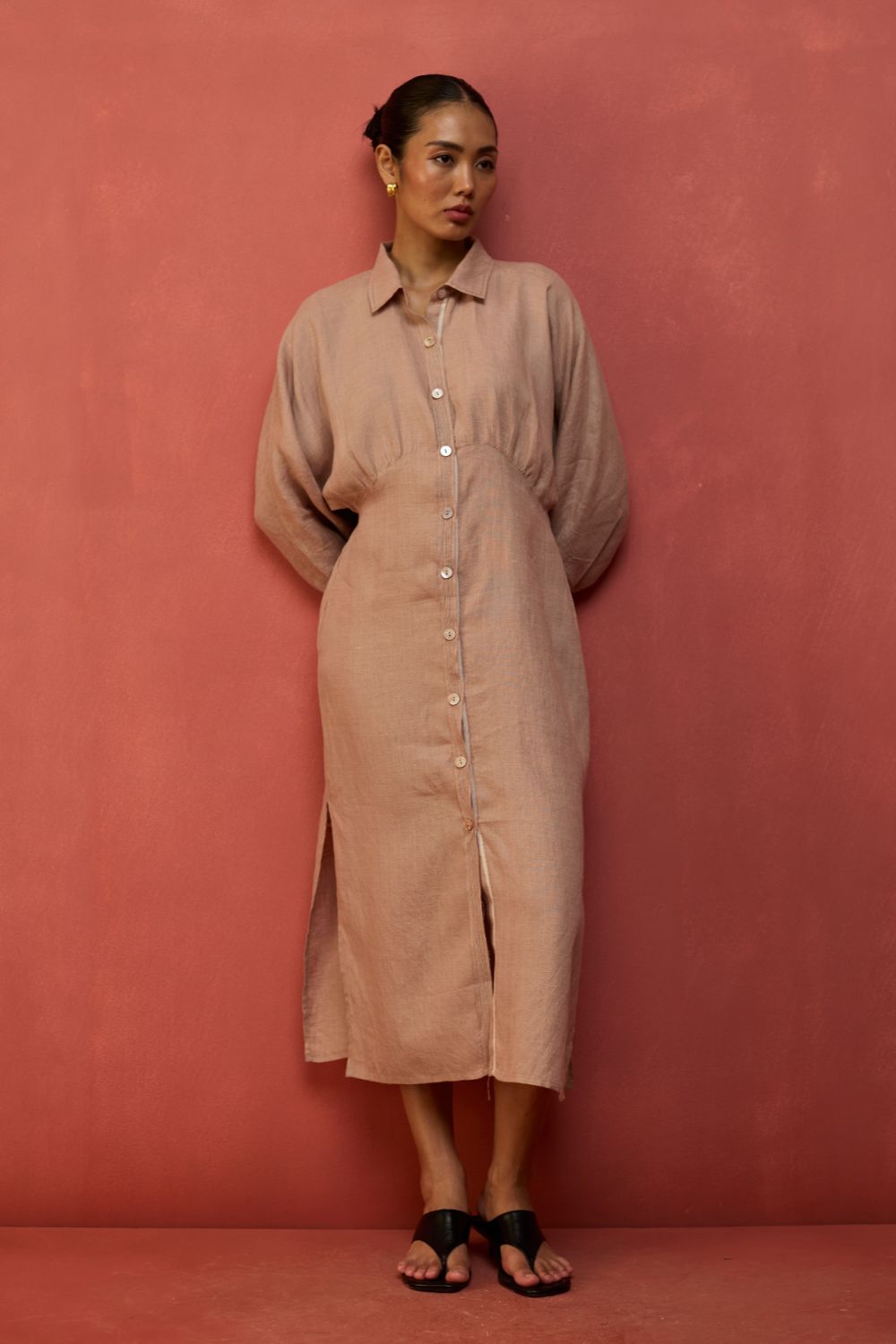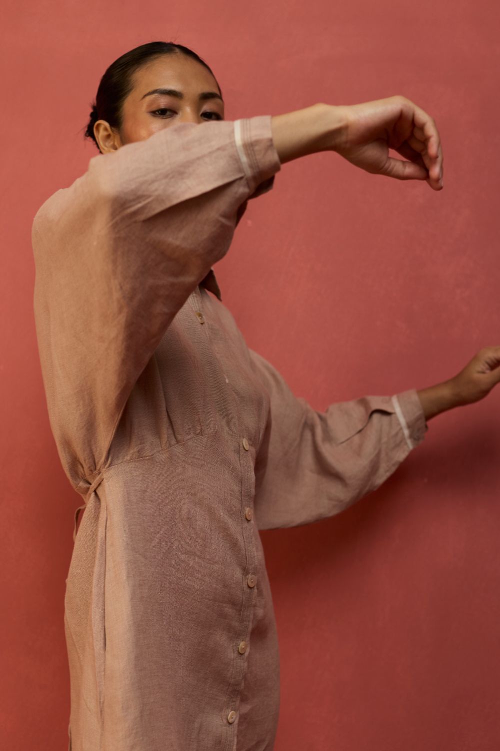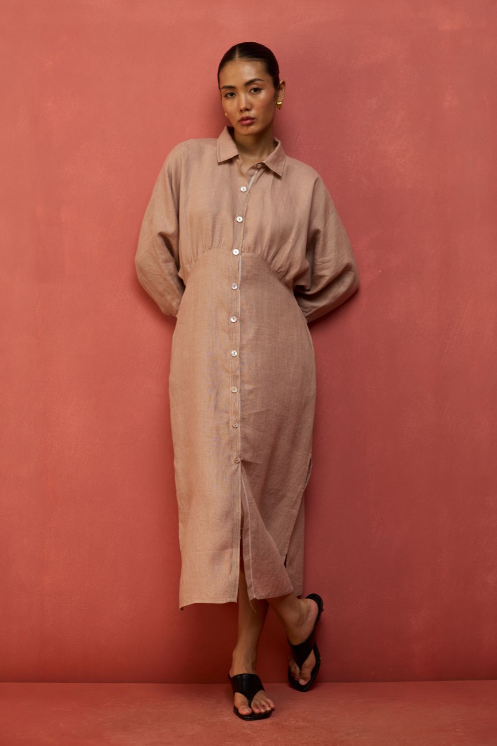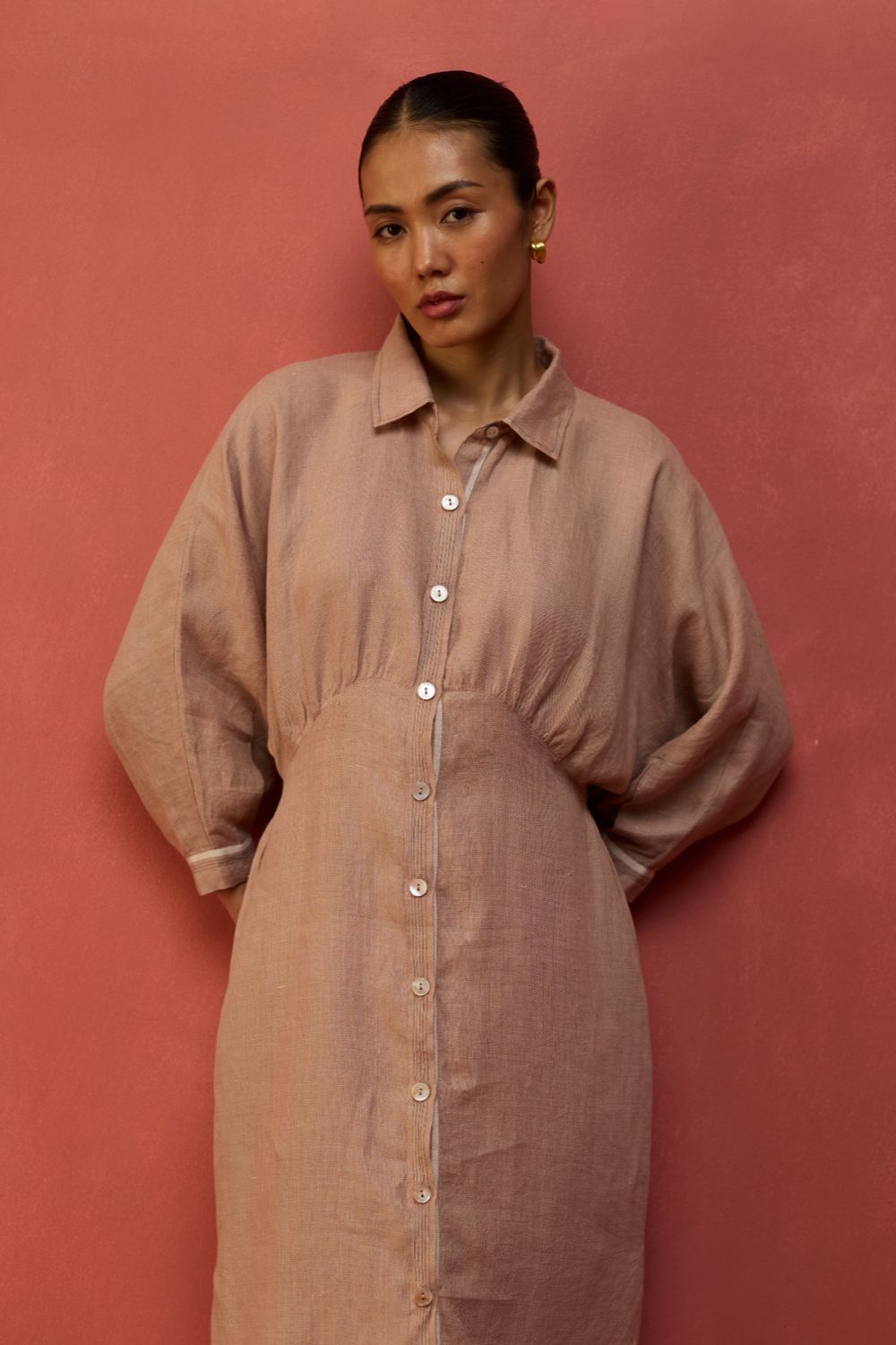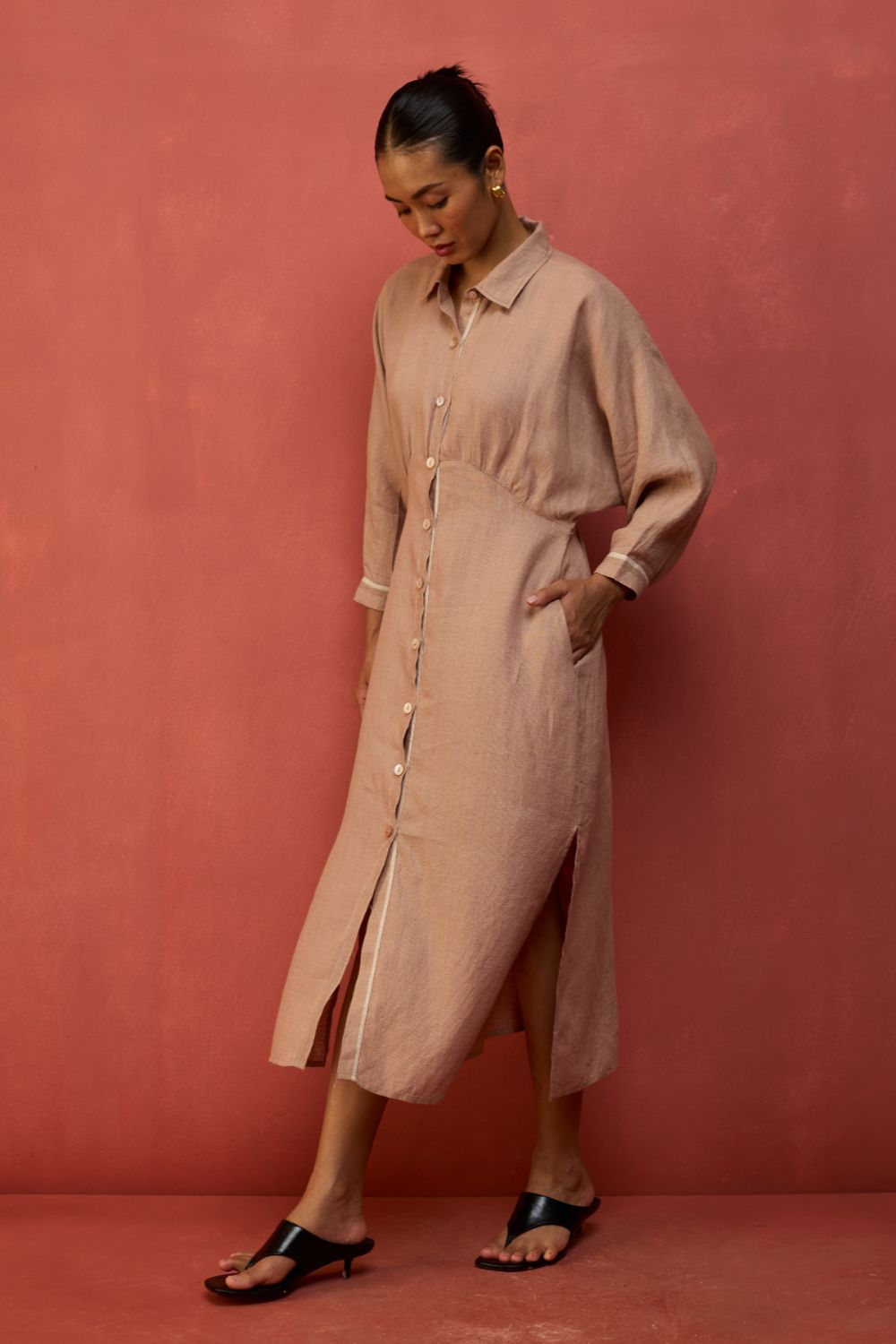 This buttoned flared dolman sleeve dress is thoughtfully designed in our signature yarn-dyed linen. It features a drawstring at the waist for a flattering, shaped silhouette along with contrast woven selvedge and top-stitch detailing along the sleeve cuffs and placket. The Masaru is elevated with oversized mother-of-pearl buttons and thoughtfully finished with pockets and side slits for ease of movement. Pair it with statement hoops or cuffs for a timeless look.