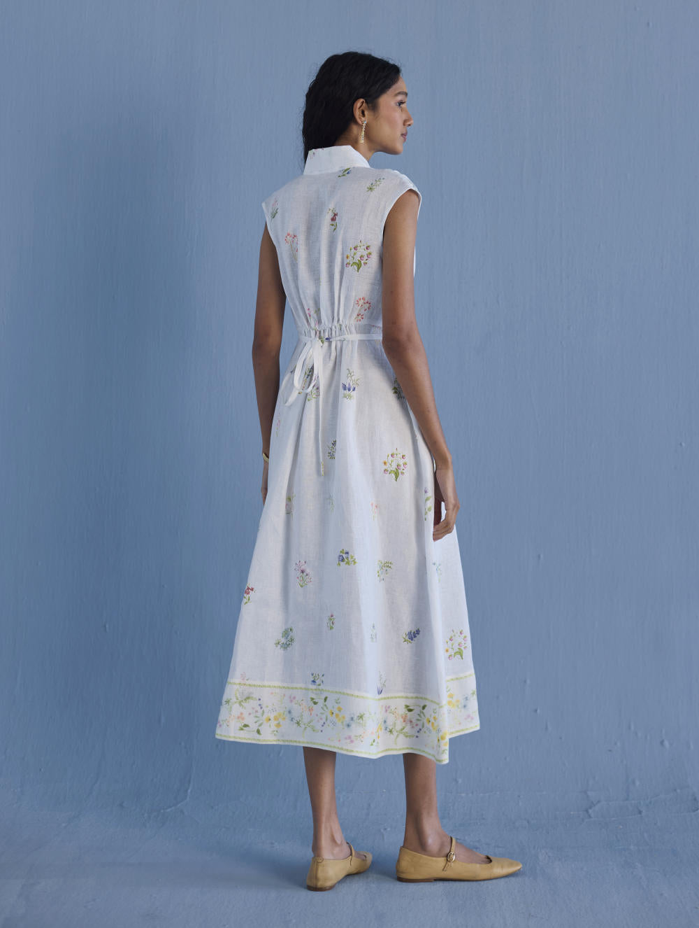 Our favourite contemporary shawl collar midi dress is handcrafted from our signature yarn-dyed linen printed with a hand-painted floral print. Gathered thoughtfully at the waist, the Mema Dress is finished with a printed sheer linen border at hem, pockets and has hand-embroidered bead detailing on the linen fabric belt. We love the Mema dress for it's versatility and it is one of our favourites to dress down or up.